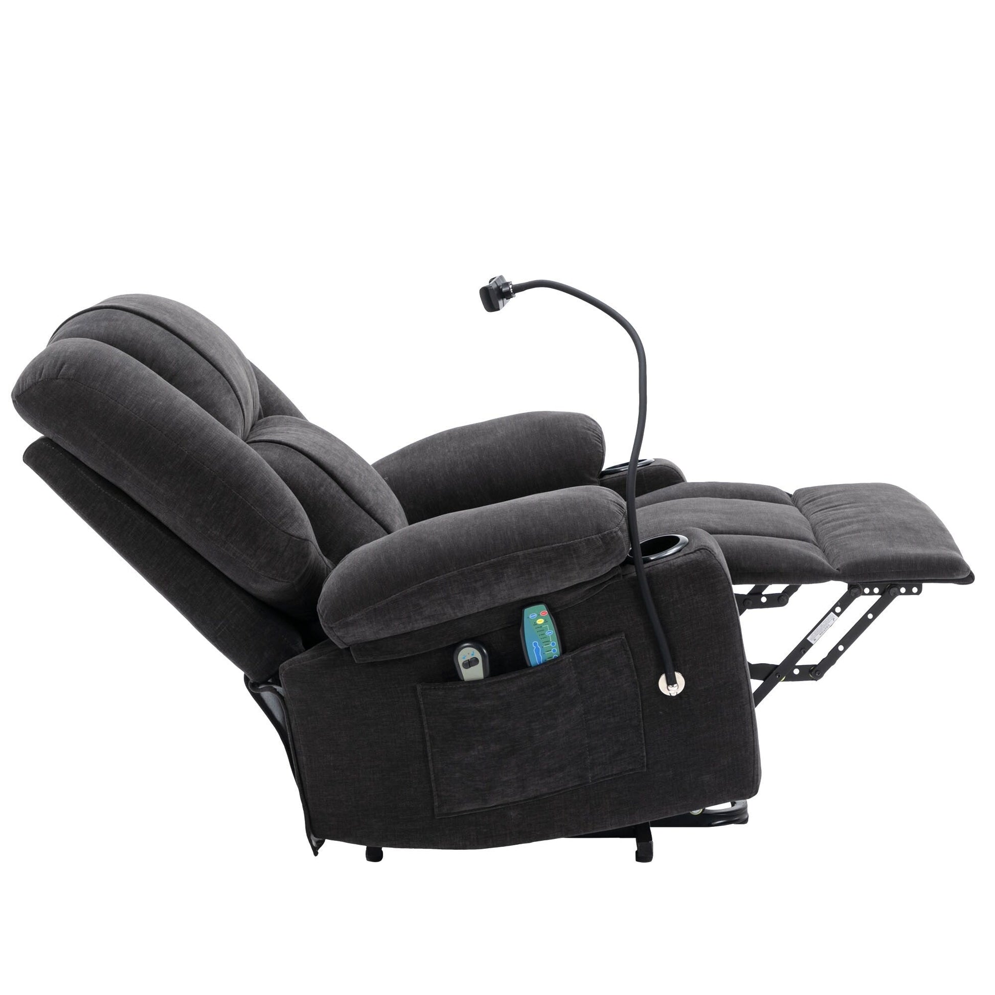 Poltrona reclinabile elettrica grigia con massaggio, riscaldamento, porta telefono a 360°, tasche laterali e portabicchieri per anziani