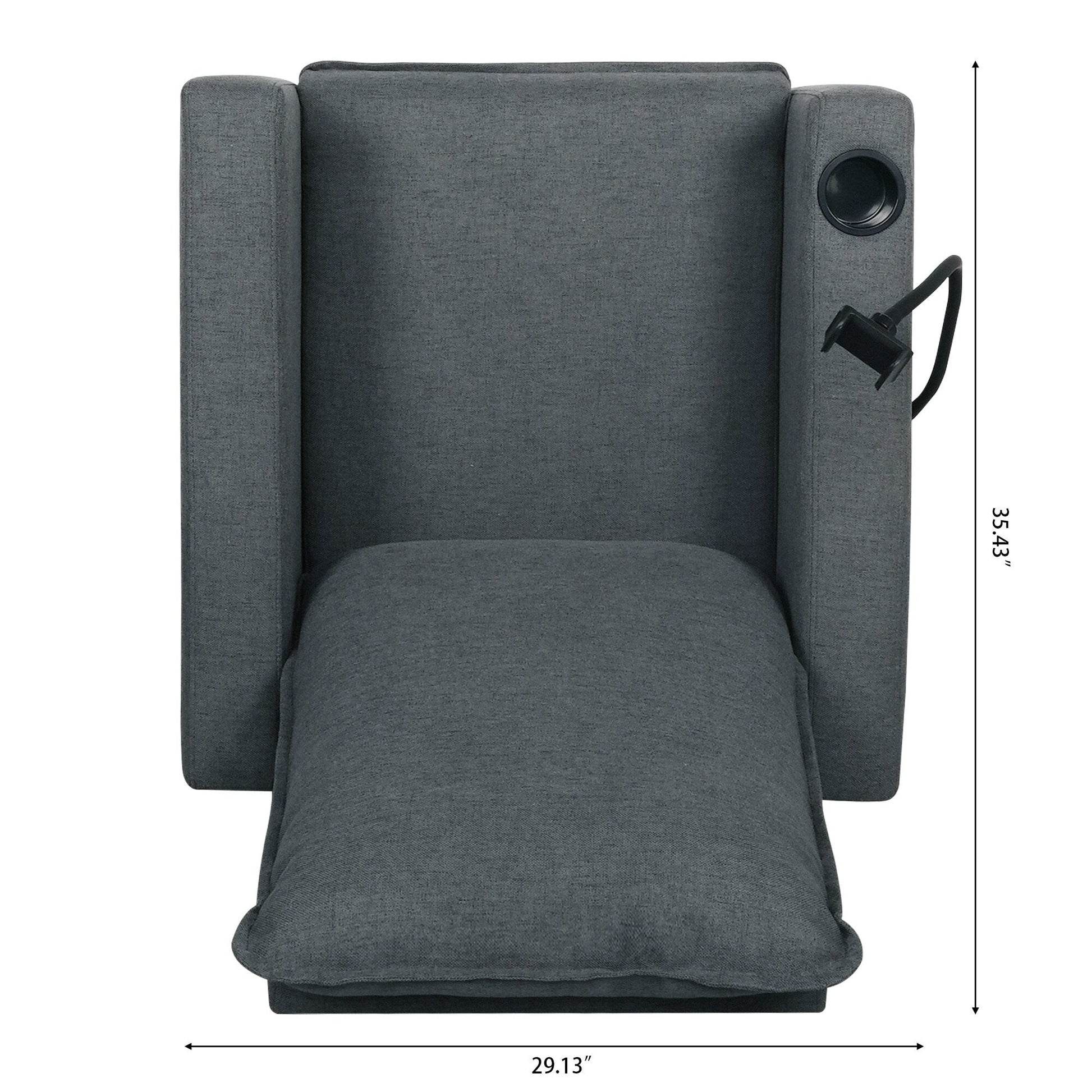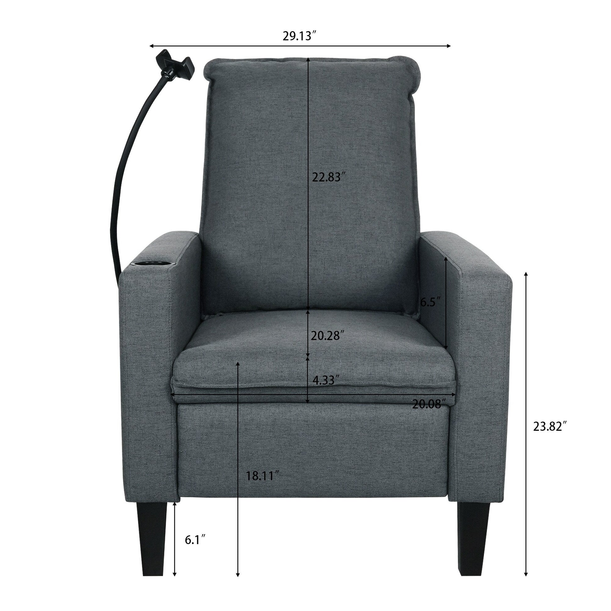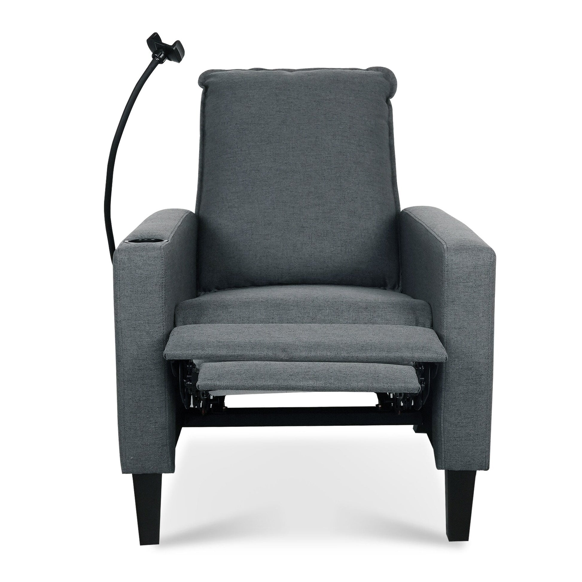 Poltrona reclinabile manuale moderna in tessuto grigio con porta cellulare, portabicchieri e poggiapiedi