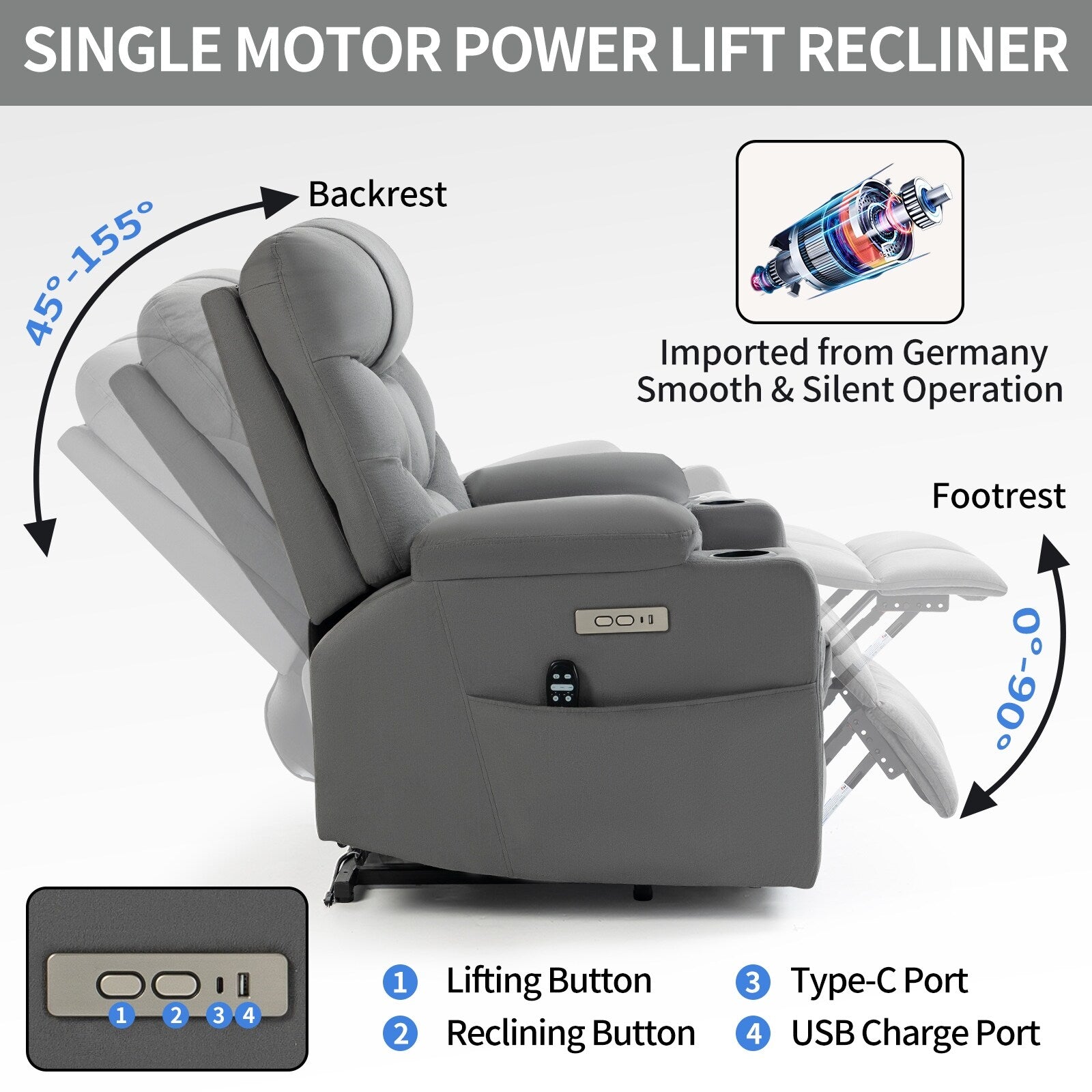 Poltrona reclinabile elettrica grigia con motore OKIN, massaggio,...