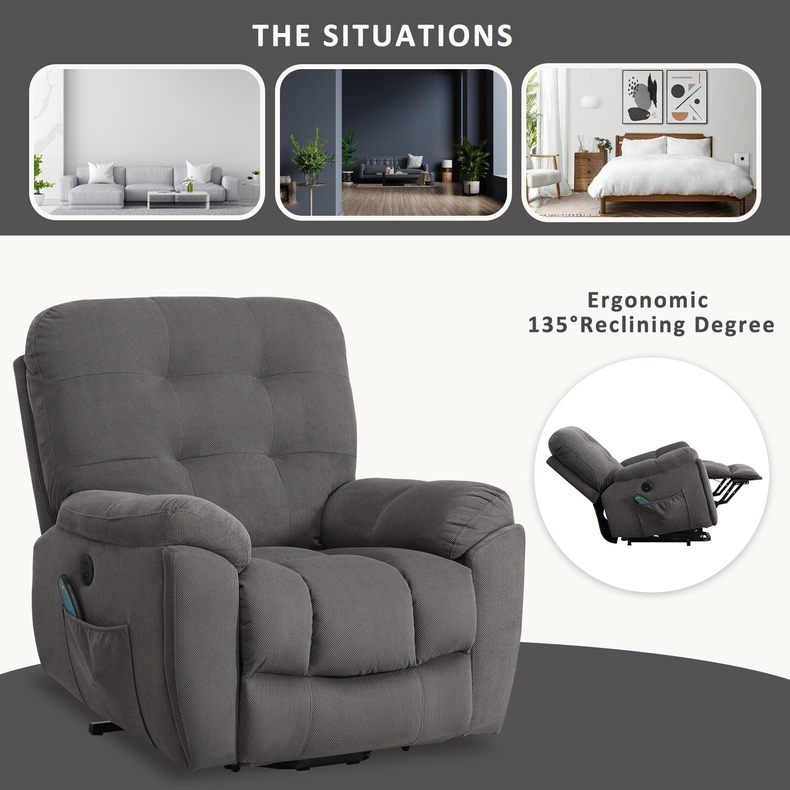 • DESIGN COMODO : Questa poltrona elettrica è dotata di una porta USB che consente di caricare i dispositivi mentre si è seduti o sdraiati. Le tasche laterali sono utilizzate per riporre telecomandi o riviste, mentre le doppie tasche anteriori sono utilizzate per riporre telefoni o altri piccoli oggetti. Questi design sono adatti all'uso quotidiano (nota: le porte USB sono adatte solo per dispositivi a bassa potenza come iPhone e iPad).