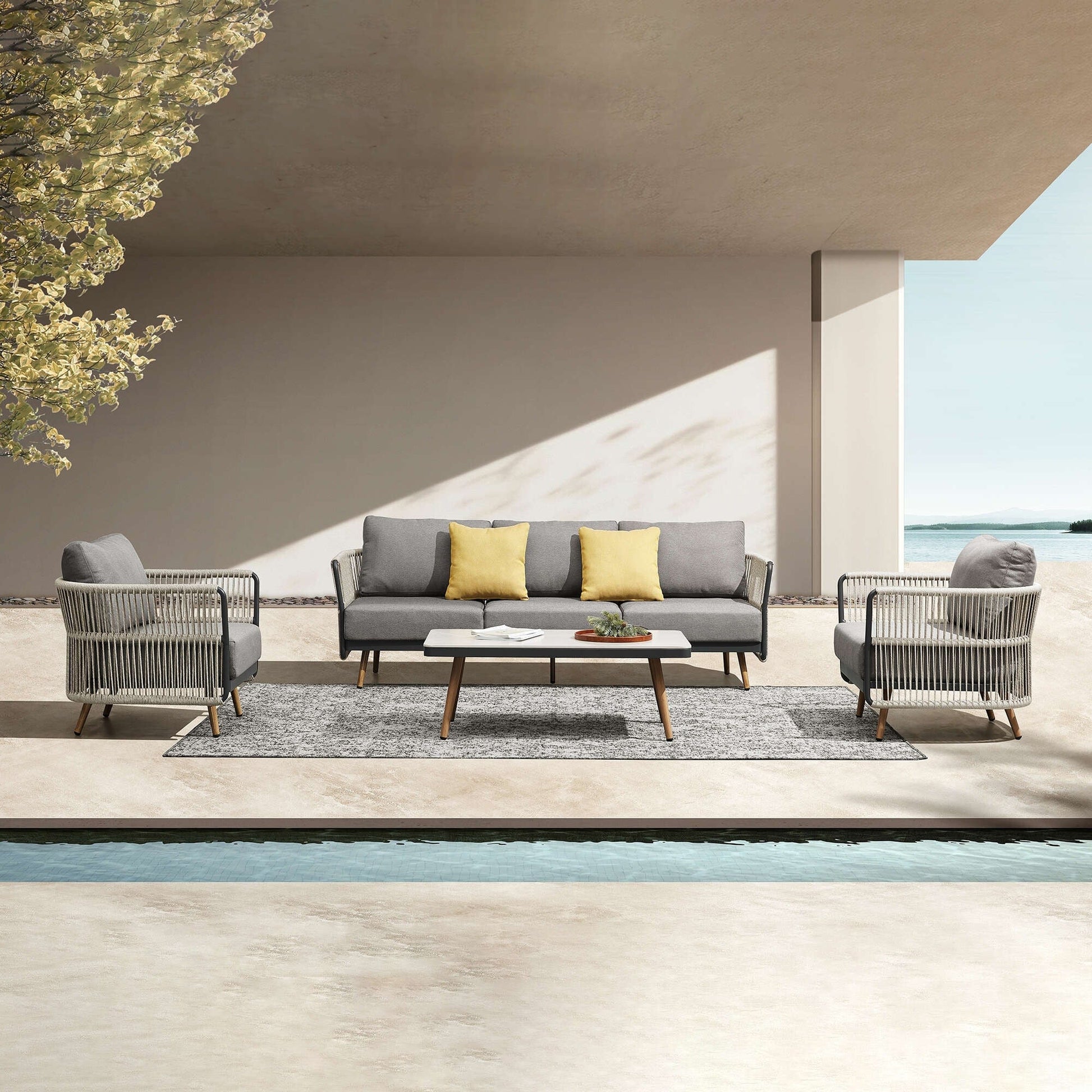 Crea un'oasi all'aperto tranquilla e invitante con il set da conversazione per patio HIGOLD da 4 pezzi. Questo splendido set include due sedie, un divano a tre posti e un tavolino da caffè, perfetti per rilassarsi e godersi la compagnia degli amici. I cavi in ​​PE resistenti alle intemperie sono robusti ed eleganti, mentre la seduta con cuscino in schiuma di spugna e il rivestimento in tessuto a fibre corte, che offrono un comfort duraturo, rendono questo set costruito per resistere agli elementi. L'elegante tavolino da caffè con piano in vetro nero aggiunge un tocco di raffinatezza, mentre i morbidi cuscini offrono ampio comfort per rilassarsi all'aperto.