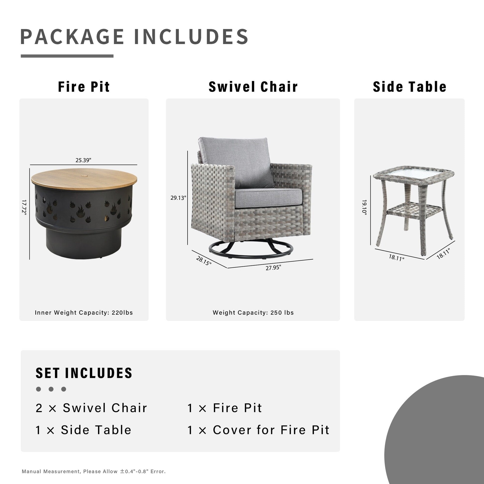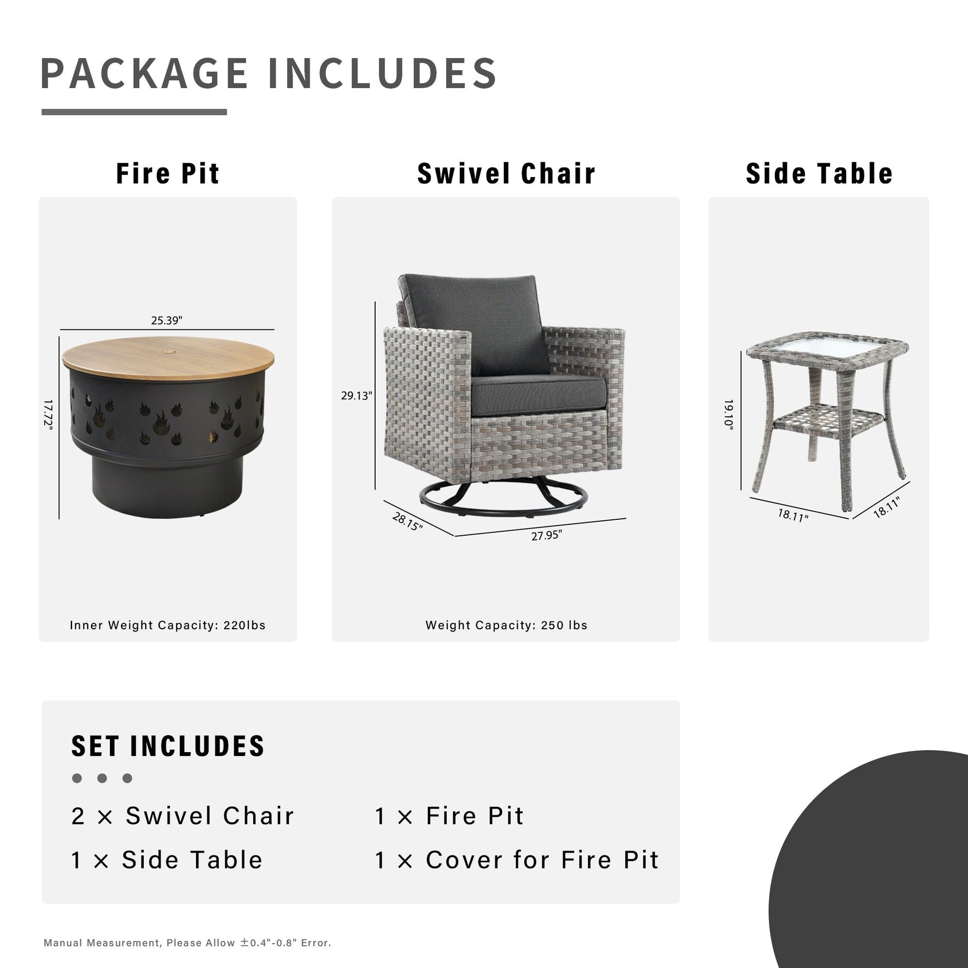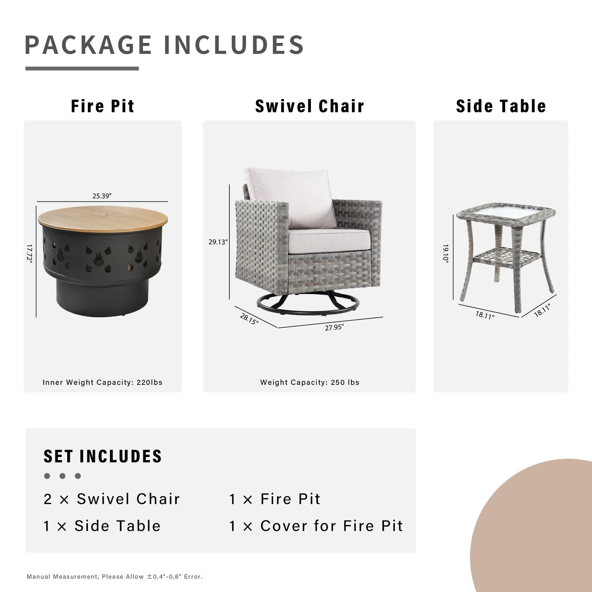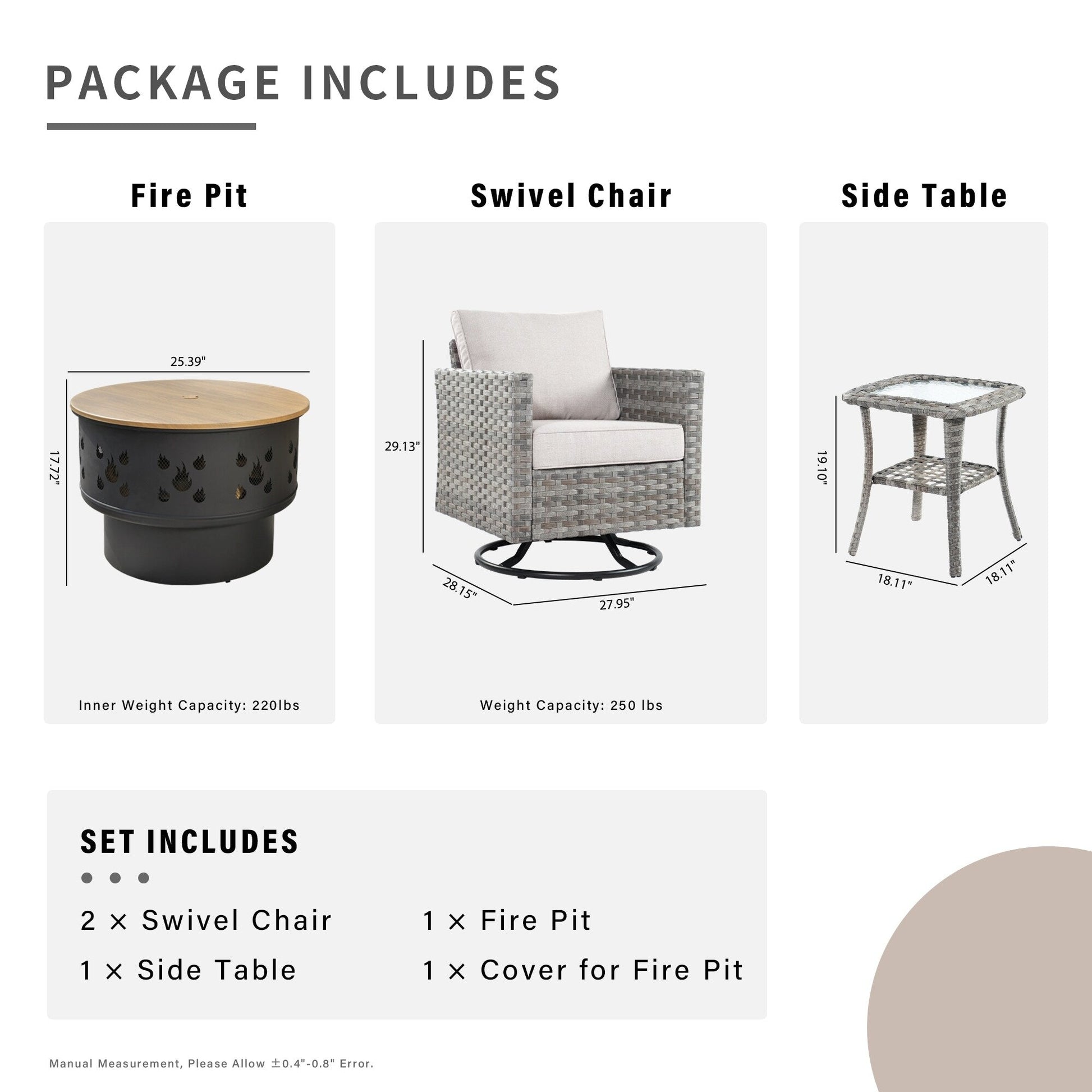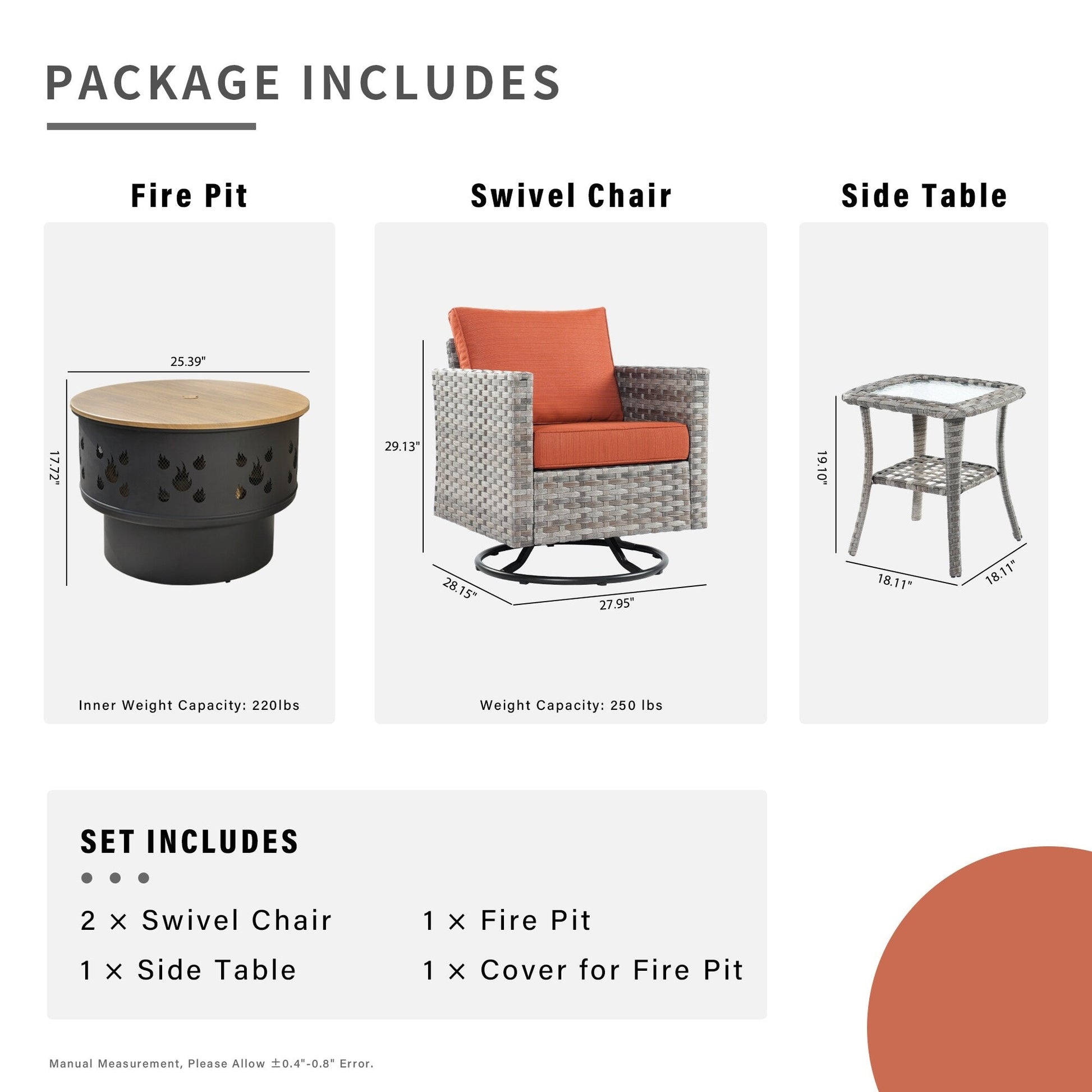 Trasforma il tuo patio esterno in un'oasi di comfort con il set di 4 sedie girevoli in vimini per patio HOOOWOOO con braciere a legna. Questo set include 2 sedie girevoli, 1 tavolino laterale e 1 braciere a legna, creando un'atmosfera rilassante e un ambiente ideale per una piacevole conversazione con gli amici. Realizzato con telaio in acciaio verniciato a polvere e vimini PE intrecciato a mano, questo set è resistente e duraturo. La sedia, con la sua resistente base in acciaio, consente una rotazione agevole in tutte le direzioni e un dolce dondolio avanti e indietro, mentre i suoi spessi cuscini imbottiti in schiuma offrono un'ottima resistenza, proteggendo la zona lombare e offrendo un piacevole relax. È ideale per giardino, cortile, bordo piscina e qualsiasi altro spazio adatto.