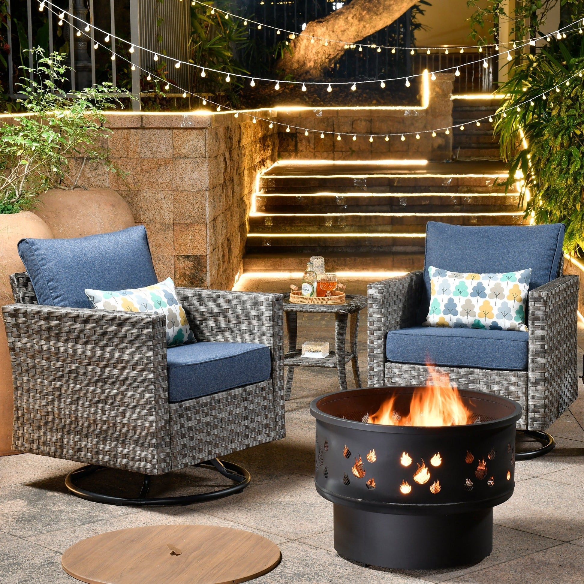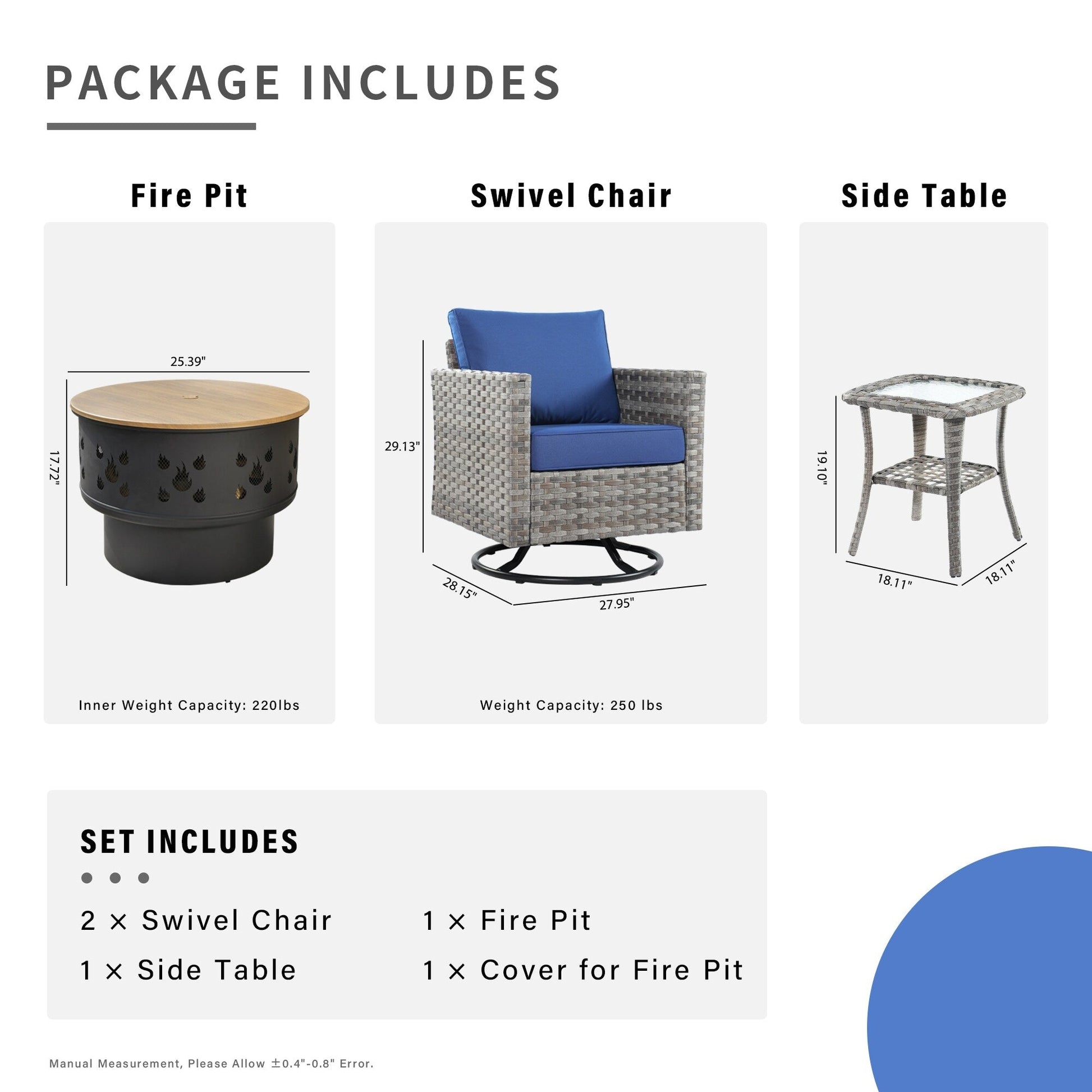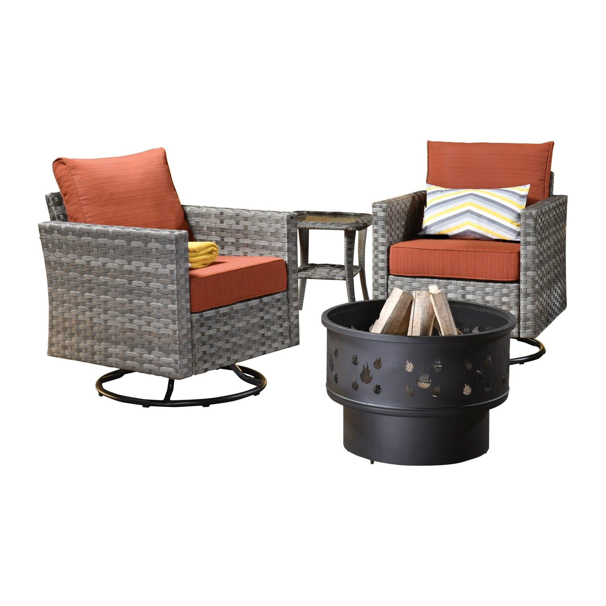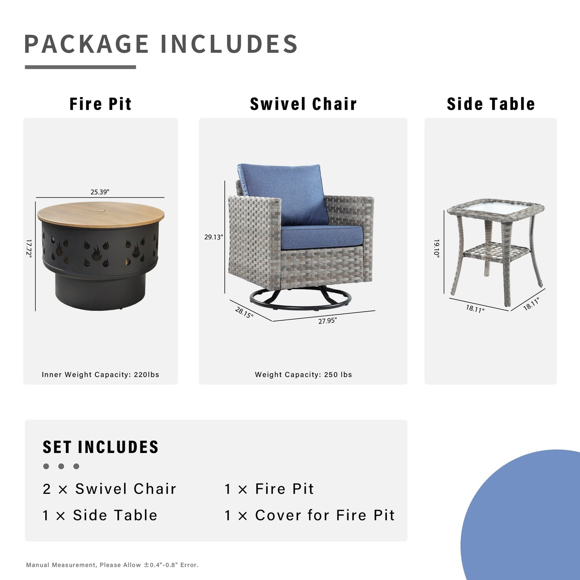 Trasforma il tuo patio esterno in un'oasi di comfort con il set di 4 sedie girevoli in vimini per patio HOOOWOOO con braciere a legna. Questo set include 2 sedie girevoli, 1 tavolino laterale e 1 braciere a legna, creando un'atmosfera rilassante e un ambiente ideale per una piacevole conversazione con gli amici. Realizzato con telaio in acciaio verniciato a polvere e vimini PE intrecciato a mano, questo set è resistente e duraturo. La sedia, con la sua resistente base in acciaio, consente una rotazione agevole in tutte le direzioni e un dolce dondolio avanti e indietro, mentre i suoi spessi cuscini imbottiti in schiuma offrono un'ottima resistenza, proteggendo la zona lombare e offrendo un piacevole relax. È ideale per giardino, cortile, bordo piscina e qualsiasi altro spazio adatto.