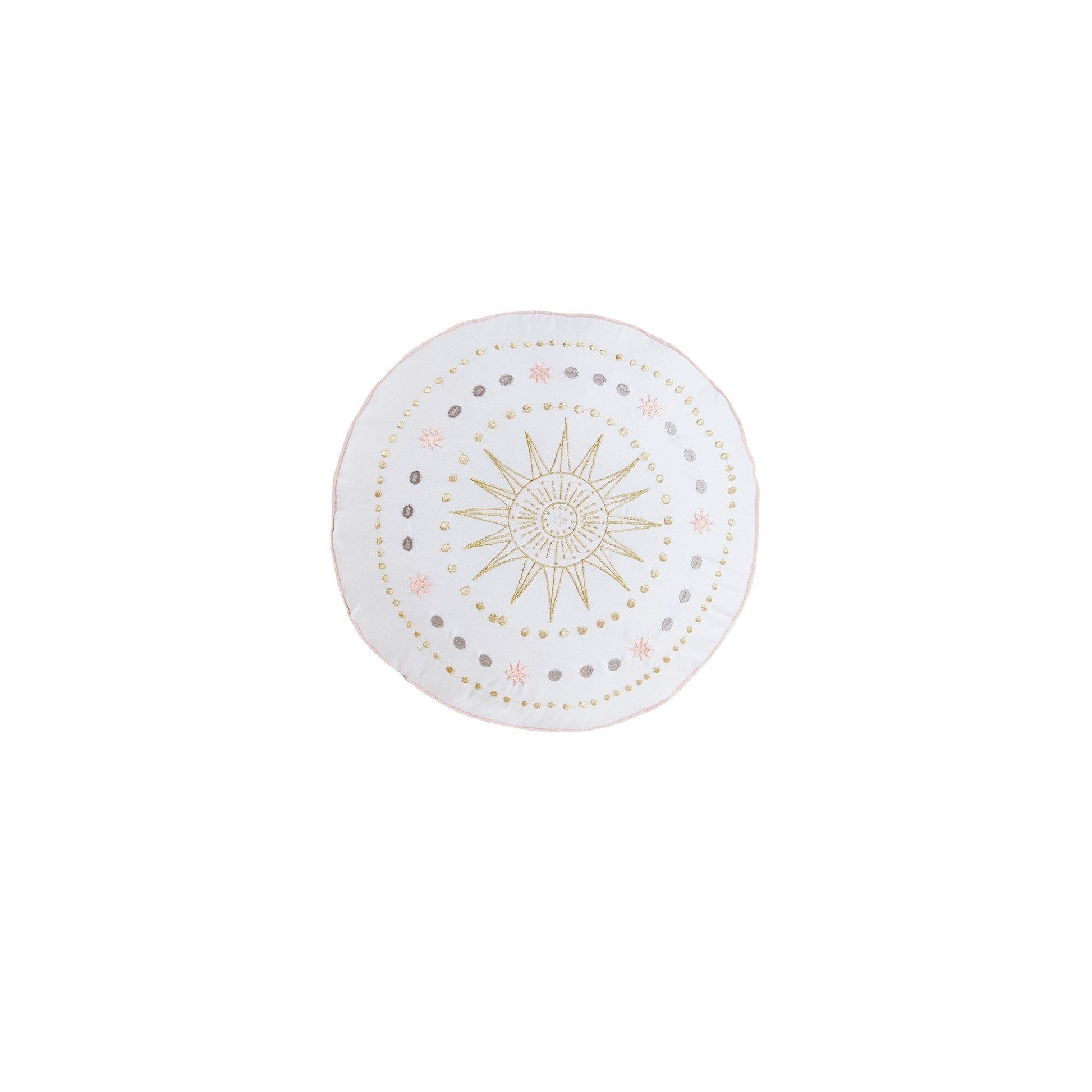 • Cuscino decorativo di forma rotonda con dettagli ricamati