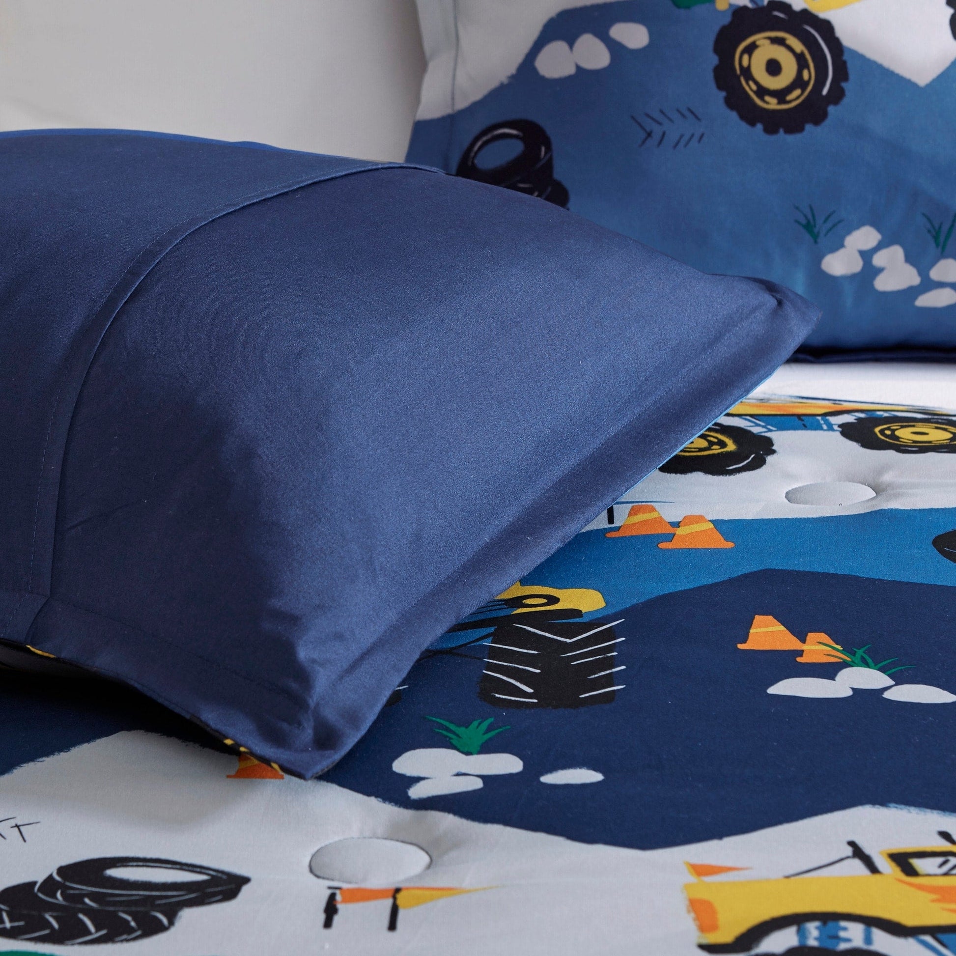 • Set di piumoni blu con stampa di camion per il primo letto del bambino, nei colori arancioni e grigi.