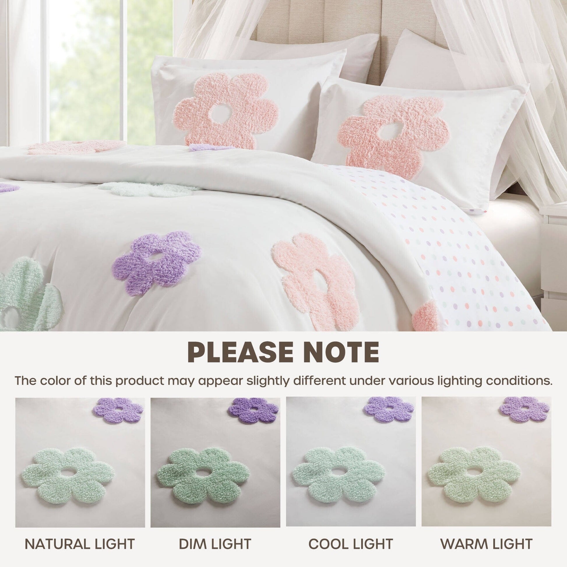 Il set copripiumino Intelligent Design Kids presenta un grazioso motivo floreale in ciniglia trapuntata nei colori viola, rosa e acquamarina su un lato e un retro a pois coordinato sull'altro, offrendo al tuo bambino due divertenti opzioni per arredare il suo letto.