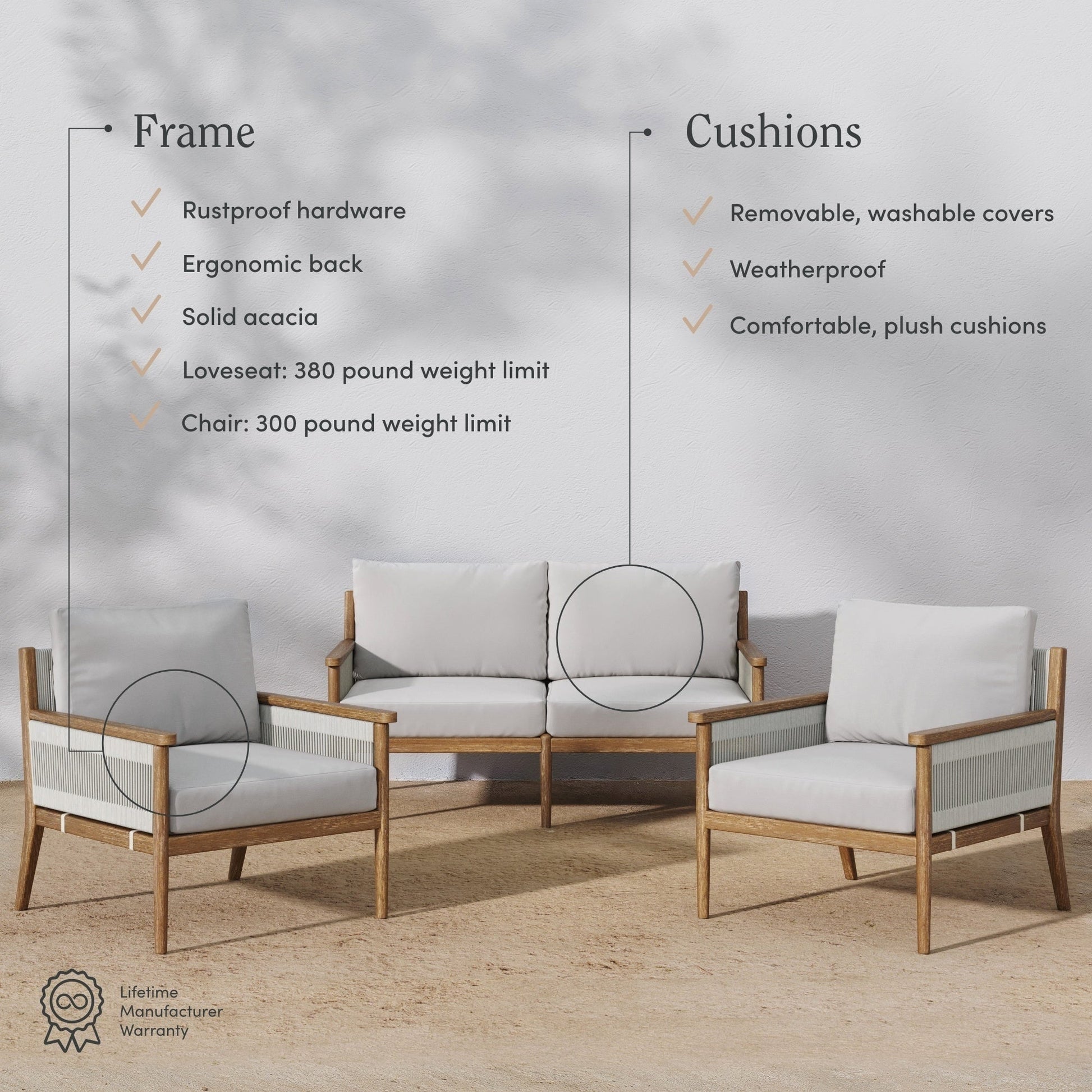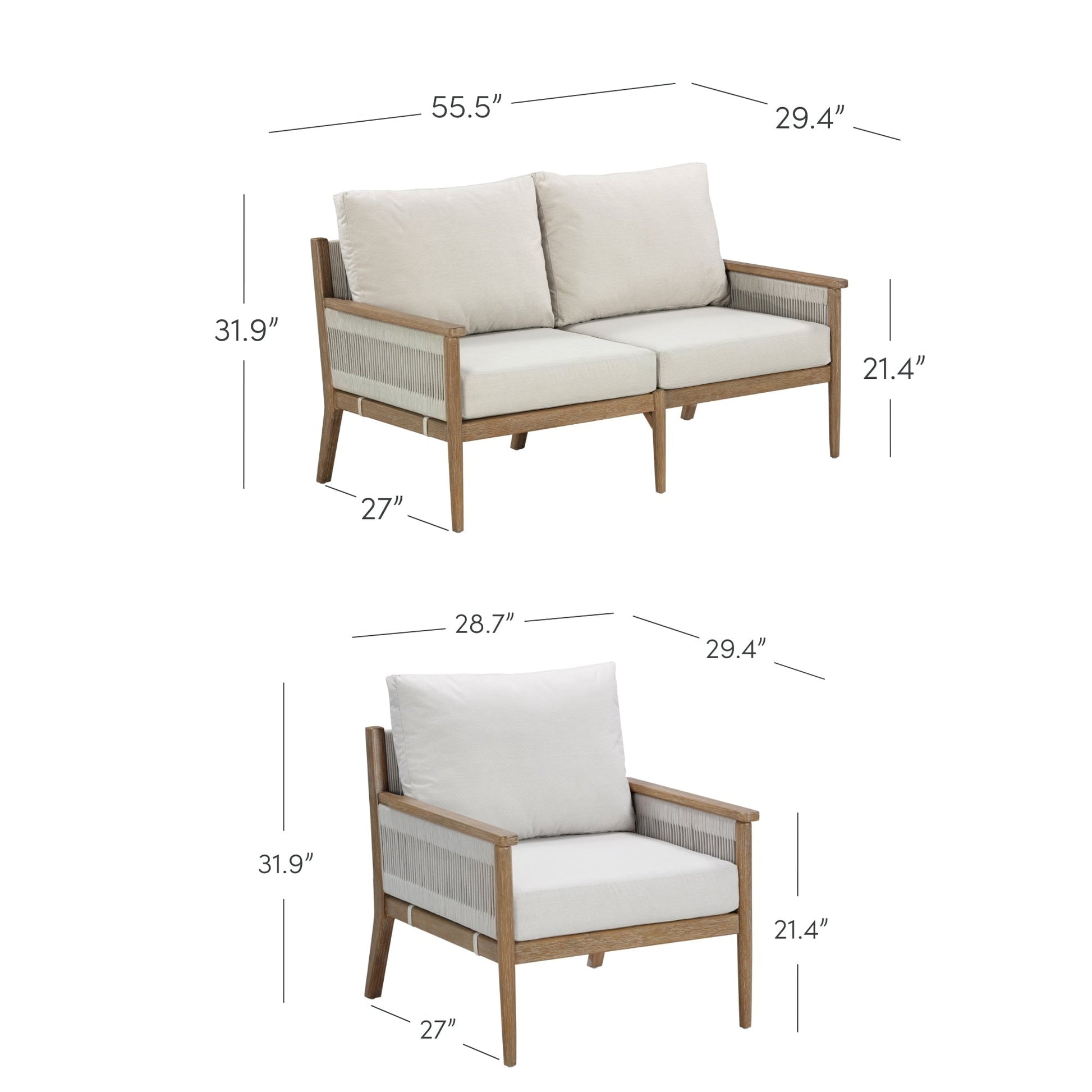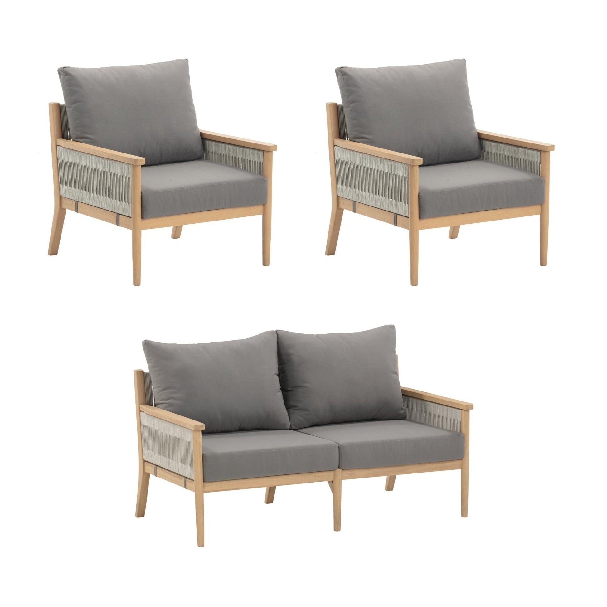• Questo set di divani da esterno è dotato di uno schienale ergonomico per il massimo comfort. Ogni acquisto include un divano a due posti e due poltrone in legno.