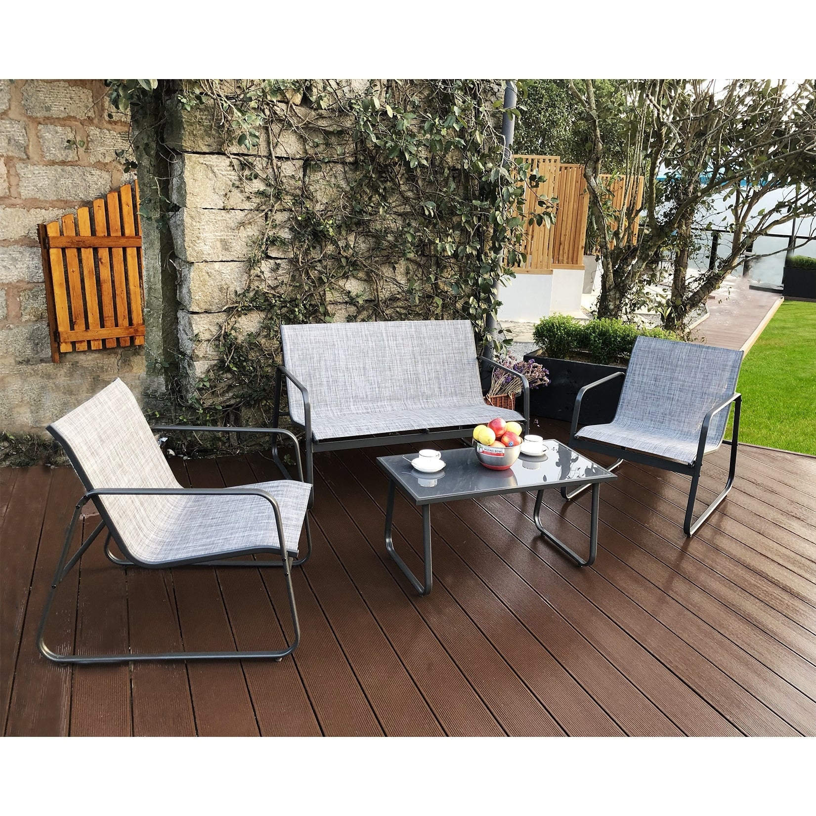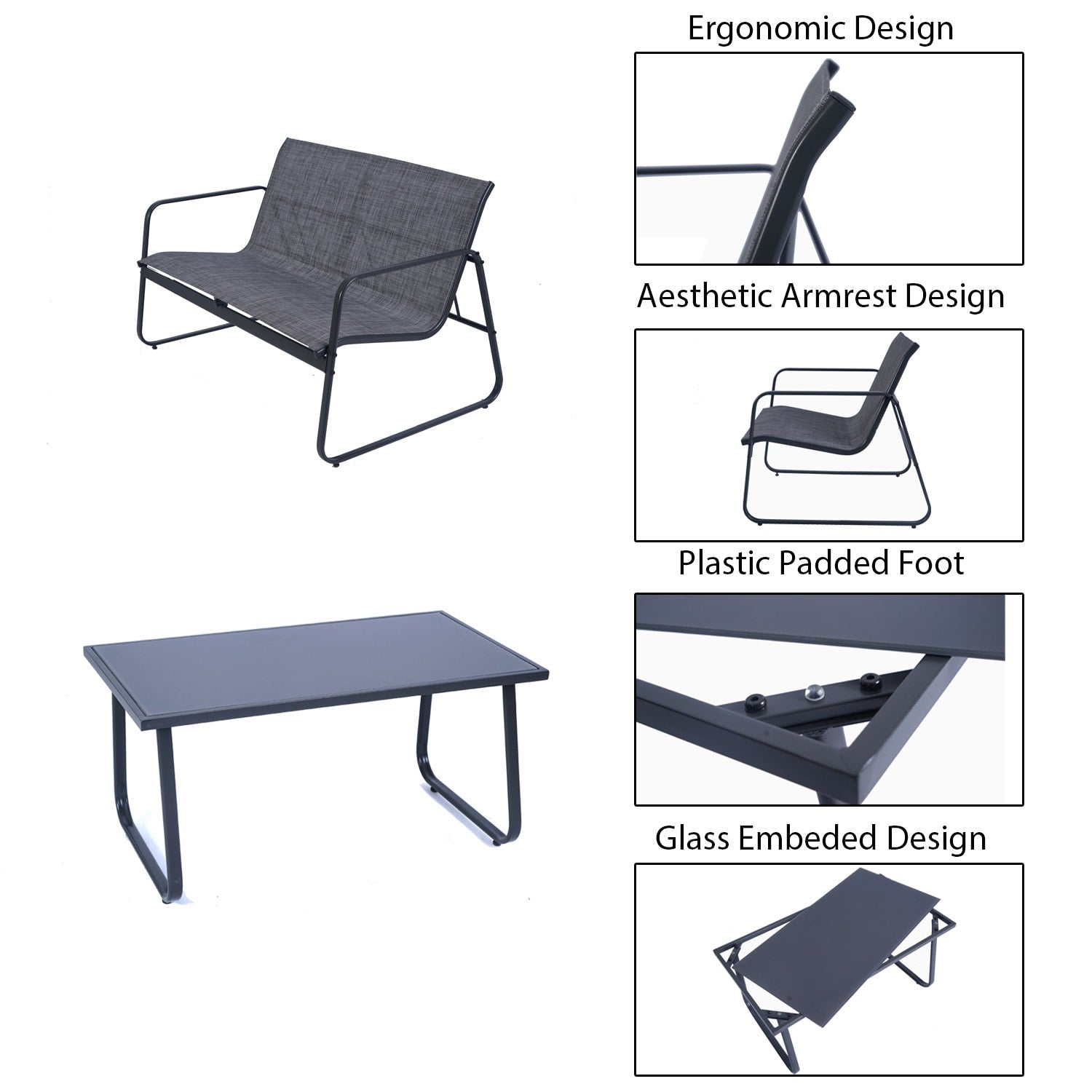 Migliora il tuo spazio esterno con il moderno ma classico set da conversazione Kozyard Sofia da 4 pezzi per patio/esterno. Questo set include un accogliente divano a due posti, due comode sedie e un robusto tavolo, offrendo il luogo perfetto per conversazioni vivaci e ritrovi in ​​famiglia. Il tessuto traspirante in textilene garantisce comfort anche nelle calde giornate estive, mentre la struttura in acciaio resistente alla ruggine e alle intemperie garantisce durata e longevità. Goditi questo set sia all'interno che all'esterno e stupisci i tuoi ospiti con il suo design elegante e moderno.