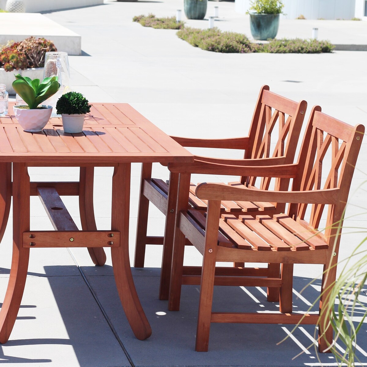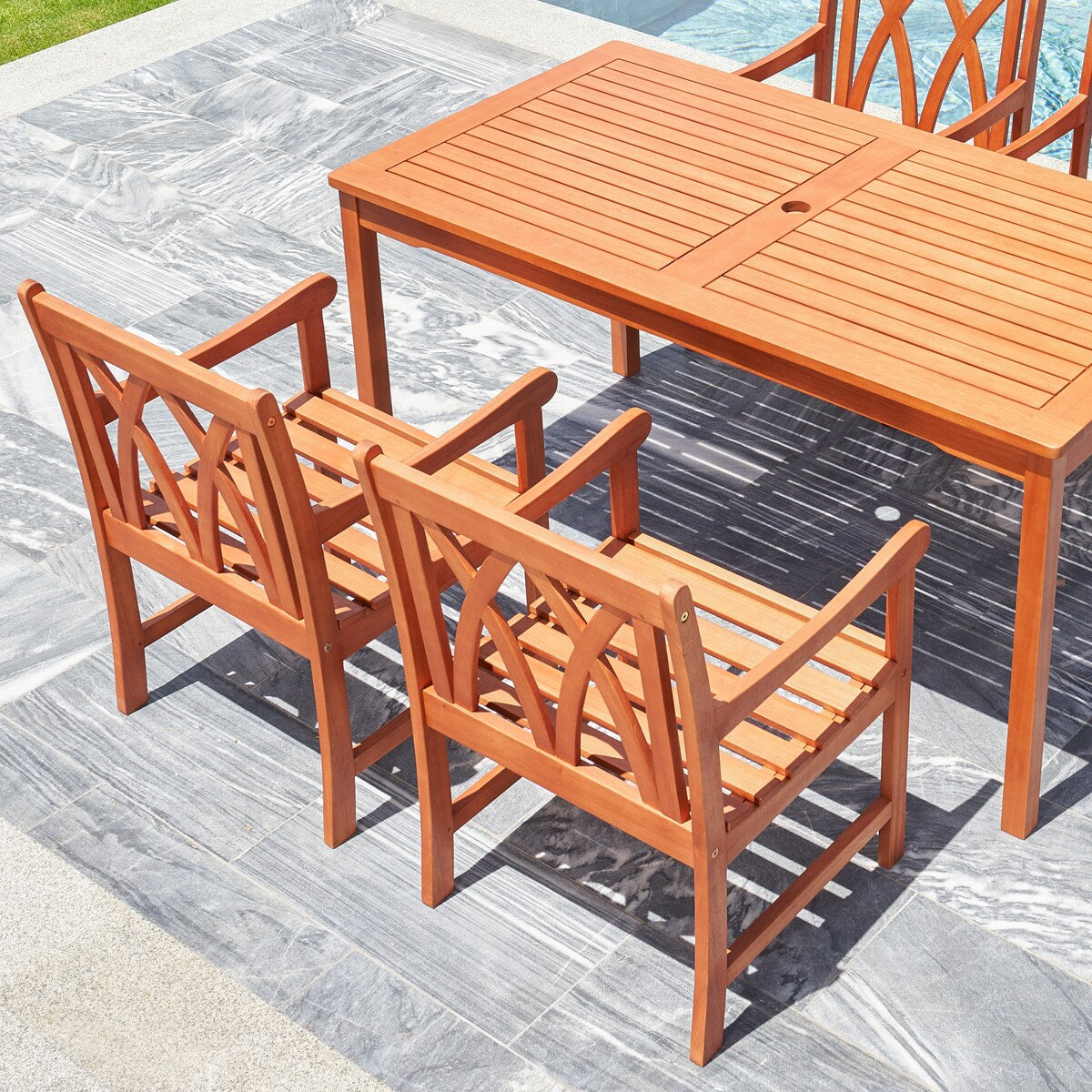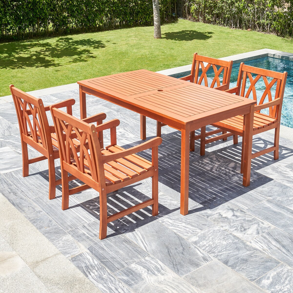 Set da pranzo Lazarus da 5 pezzi con tavolo e poltrona da patio in legno tropicale marrone rossiccio