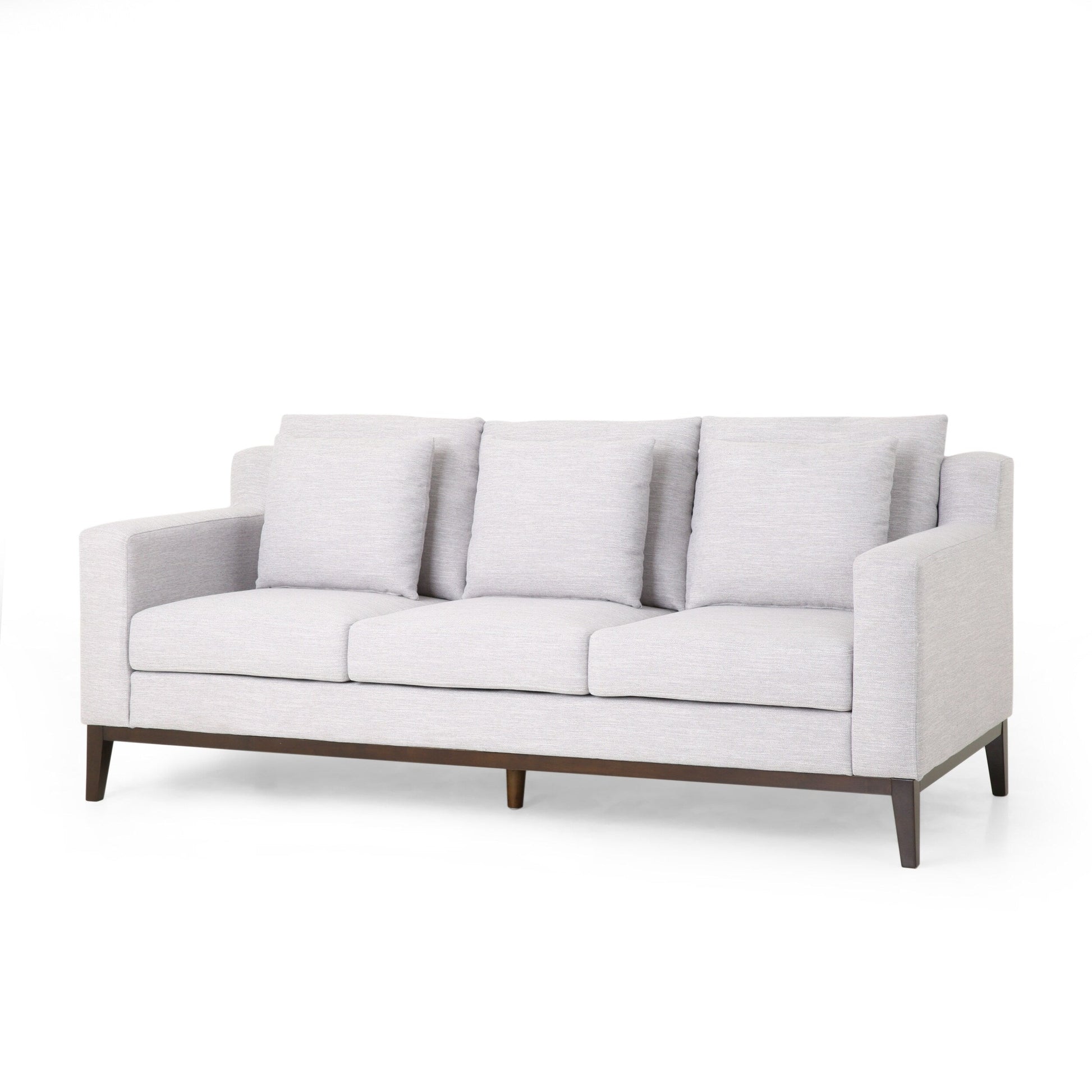 Divano moderno grigio chiaro da 80 a 3 posti con gambe in legno e cuscini coordinati per il soggiorno