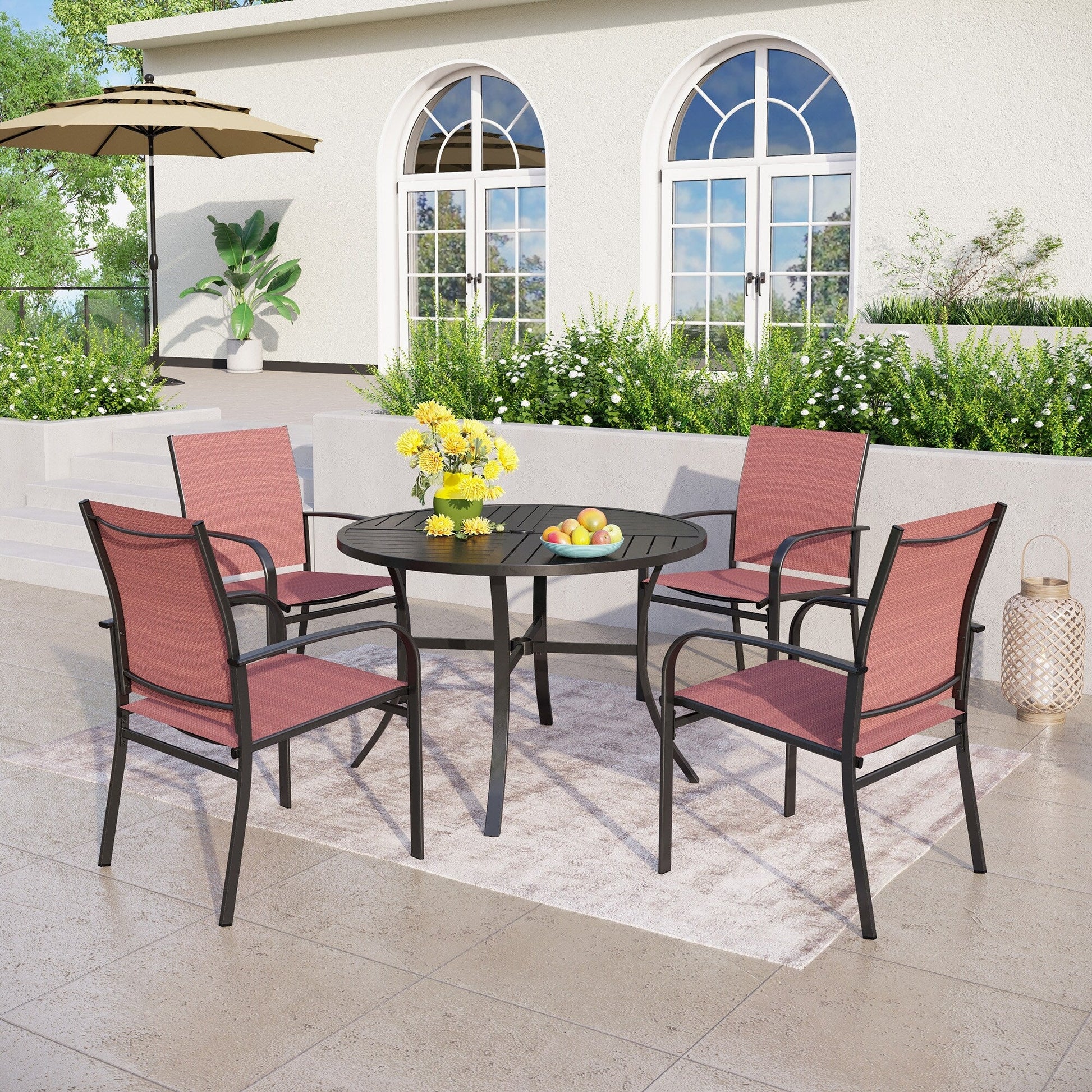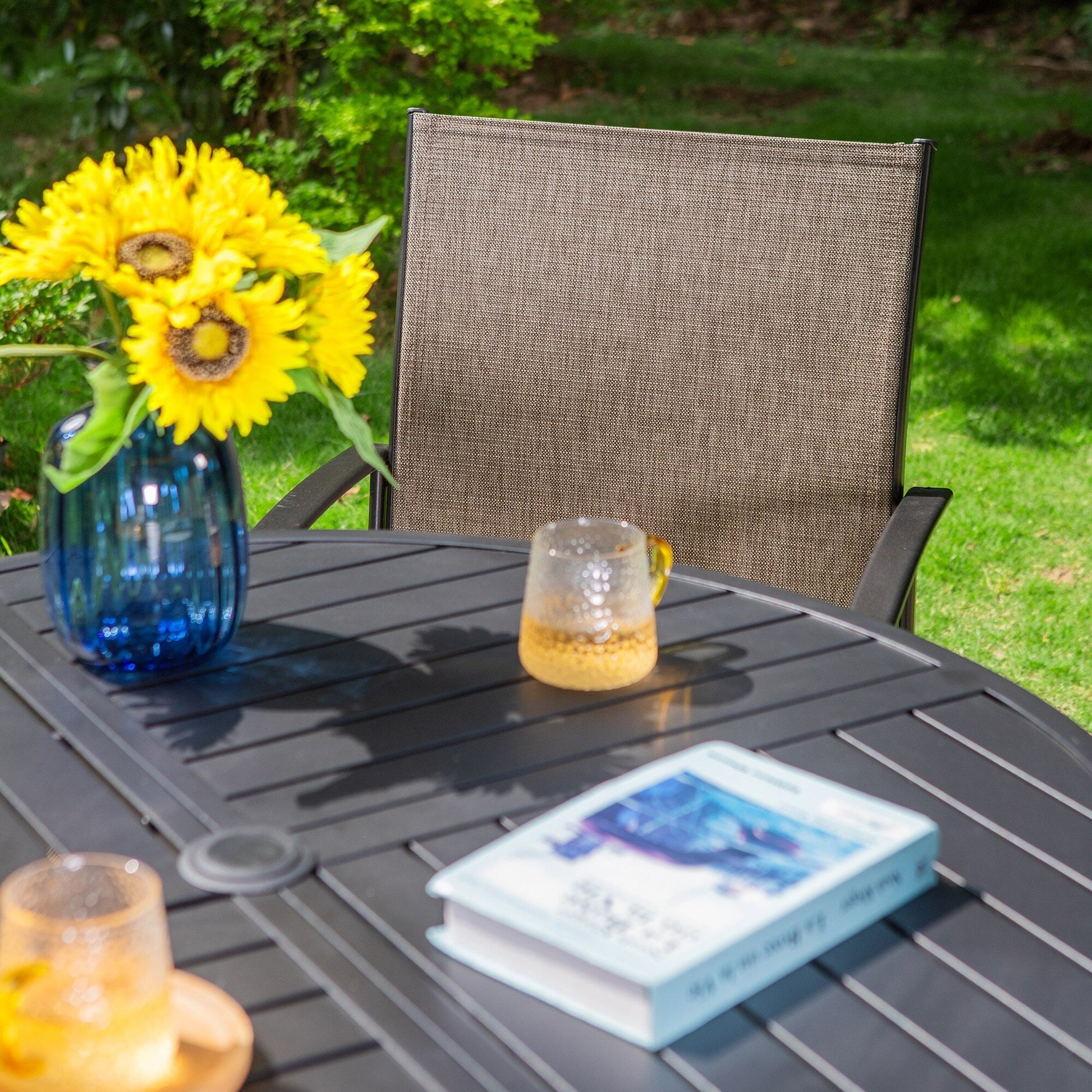 Migliora la tua esperienza culinaria all'aperto con questo elegante set da pranzo da 5 pezzi. Realizzato in resistente metallo con verniciatura epossidica, questo tavolo è costruito per durare senza arrugginire o scolorire. Il tavolo quadrato è dotato di un foro per ombrellone per una maggiore ombra nelle giornate di sole. Il set include 4 sedie in Textilene dal design ergonomico per una seduta confortevole. Perfetto per piccoli pasti o riunioni, questo set stupirà sicuramente i tuoi ospiti.