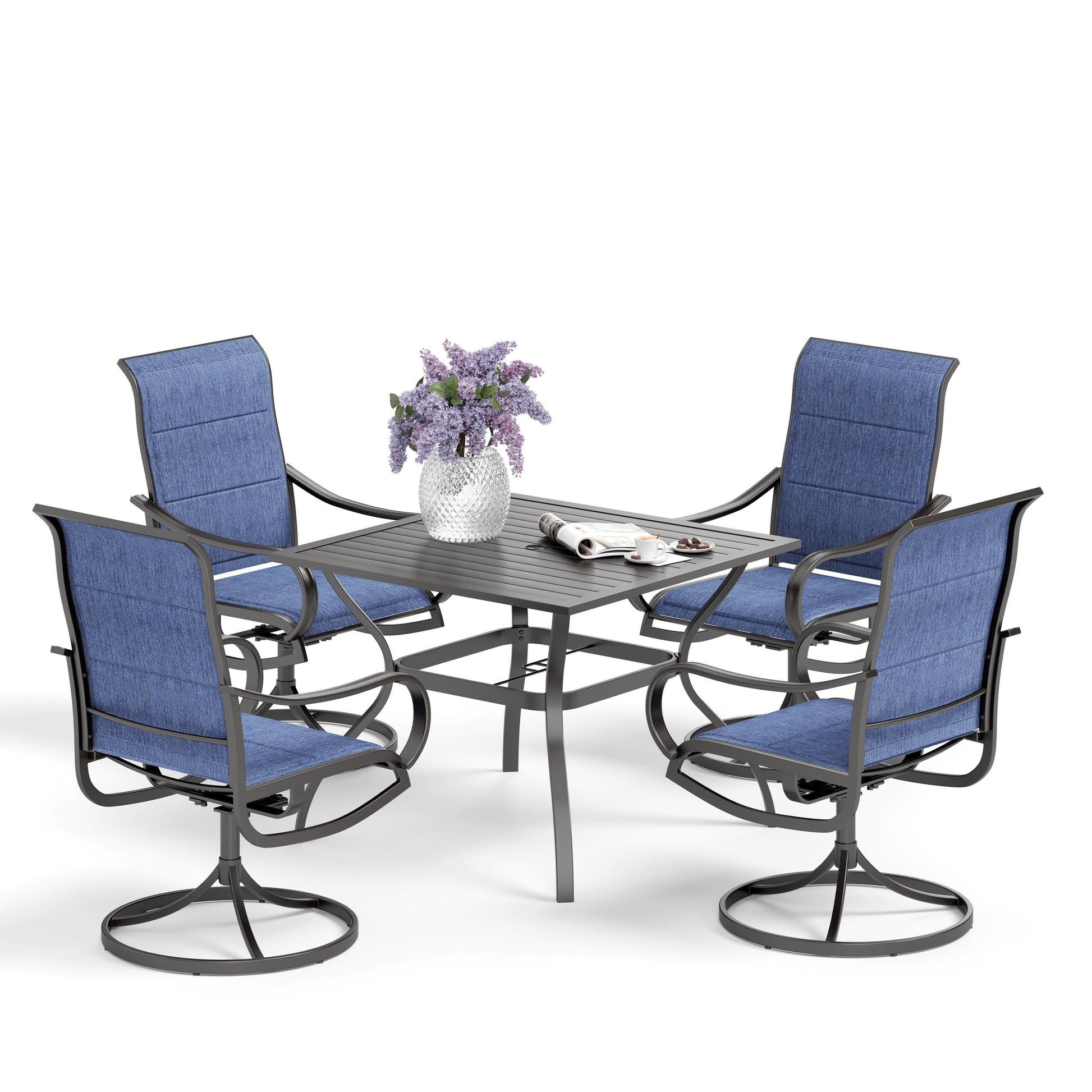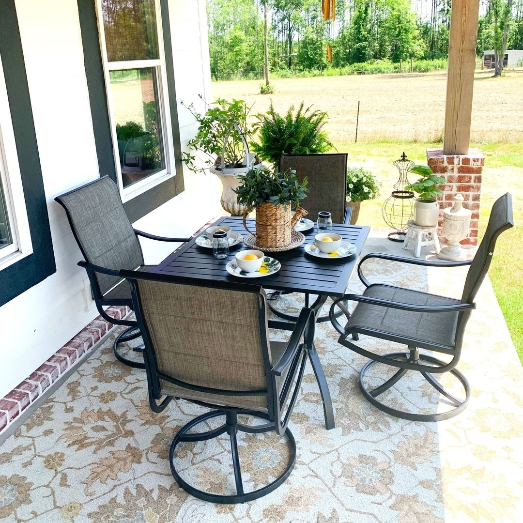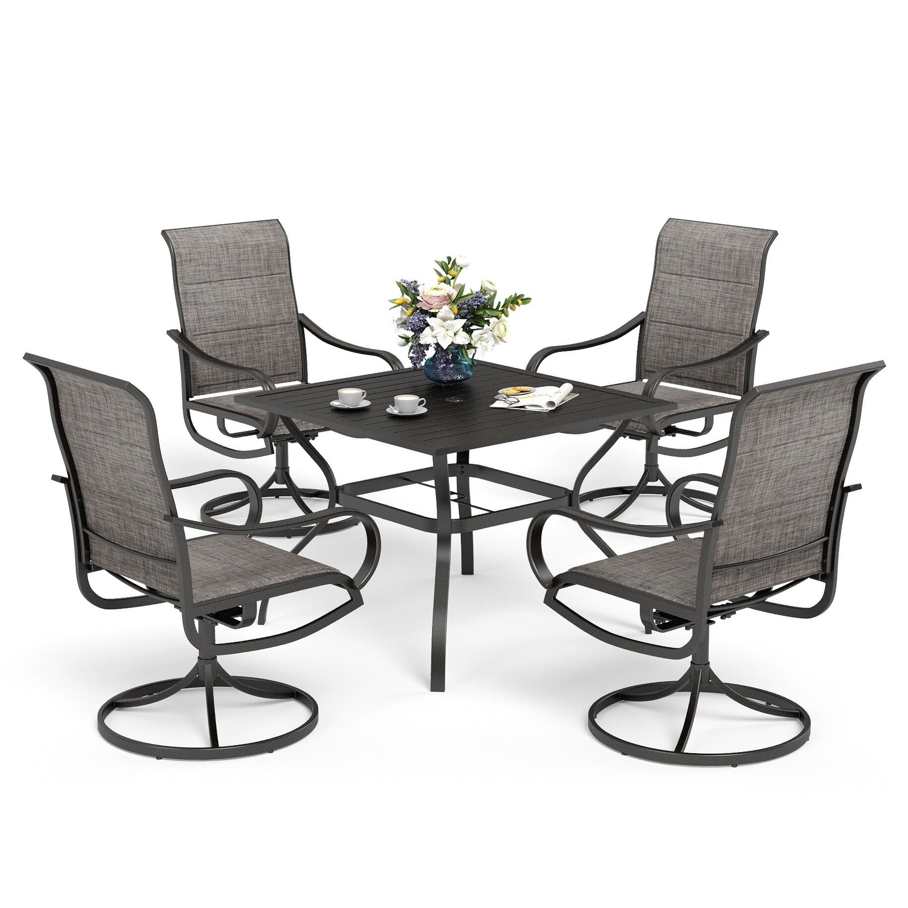 Questo elegante e moderno set da pranzo da giardino valorizzerà l'aspetto e il comfort di qualsiasi spazio esterno. Le sedie sono dotate di sedute in tessuto traspirante e imbottito e sono girevoli a 360 gradi per un utilizzo pratico e versatile. Il tavolo è dotato di un foro per ombrellone, che consente di aggiungere un ombrellone per creare ombra nelle calde giornate estive.