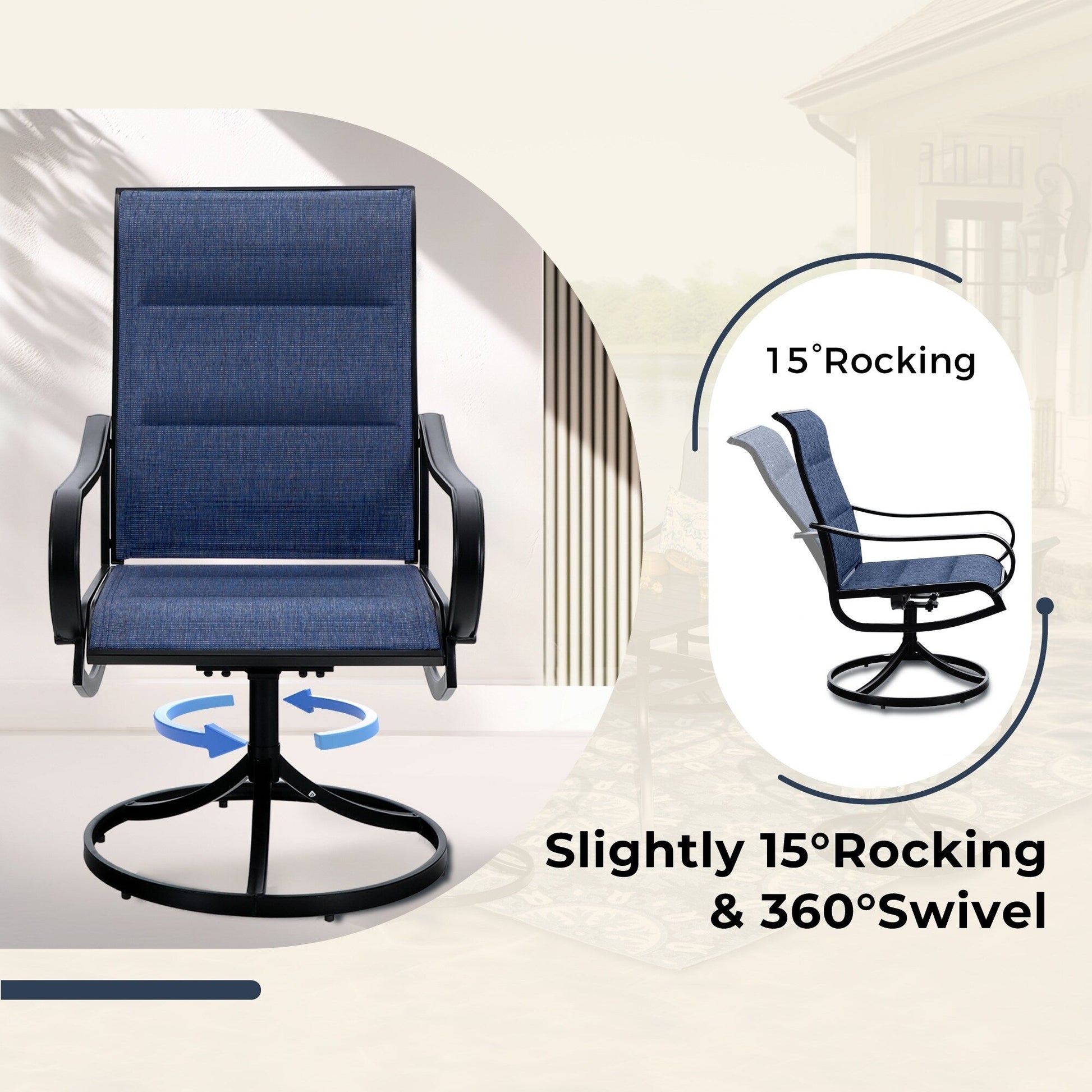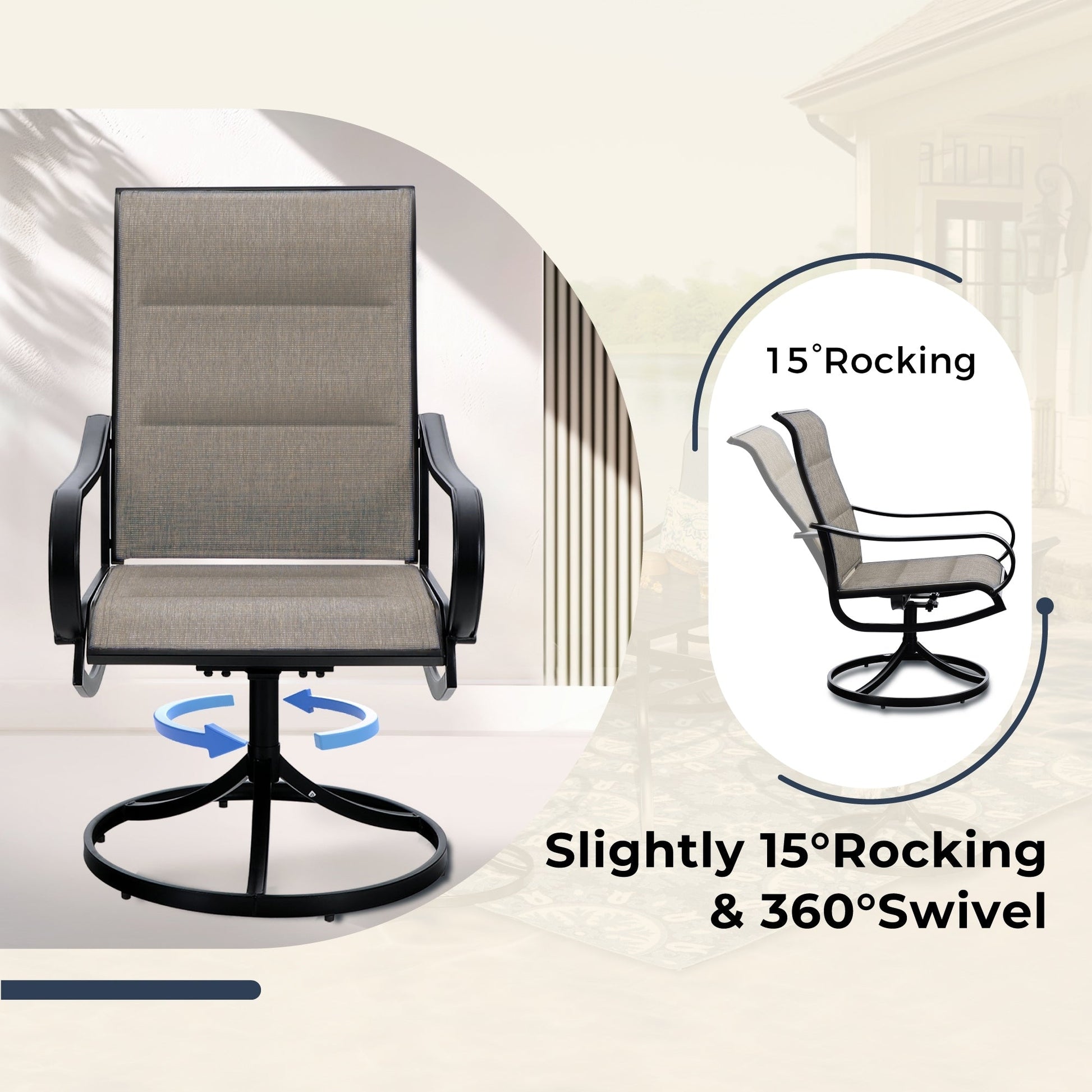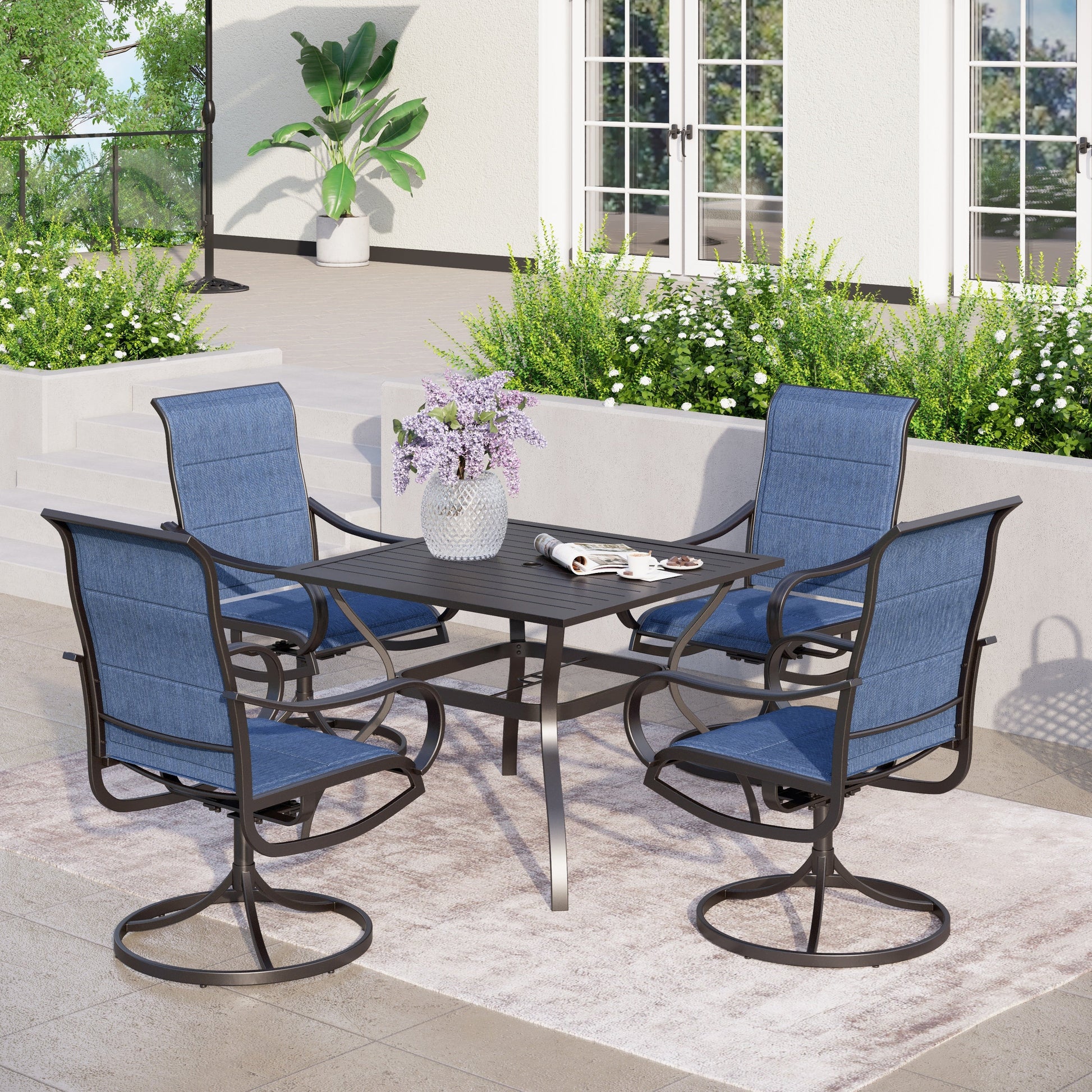 Questo elegante e moderno set da pranzo da giardino valorizzerà l'aspetto e il comfort di qualsiasi spazio esterno. Le sedie sono dotate di sedute in tessuto traspirante e imbottito e sono girevoli a 360 gradi per un utilizzo pratico e versatile. Il tavolo è dotato di un foro per ombrellone, che consente di aggiungere un ombrellone per creare ombra nelle calde giornate estive.