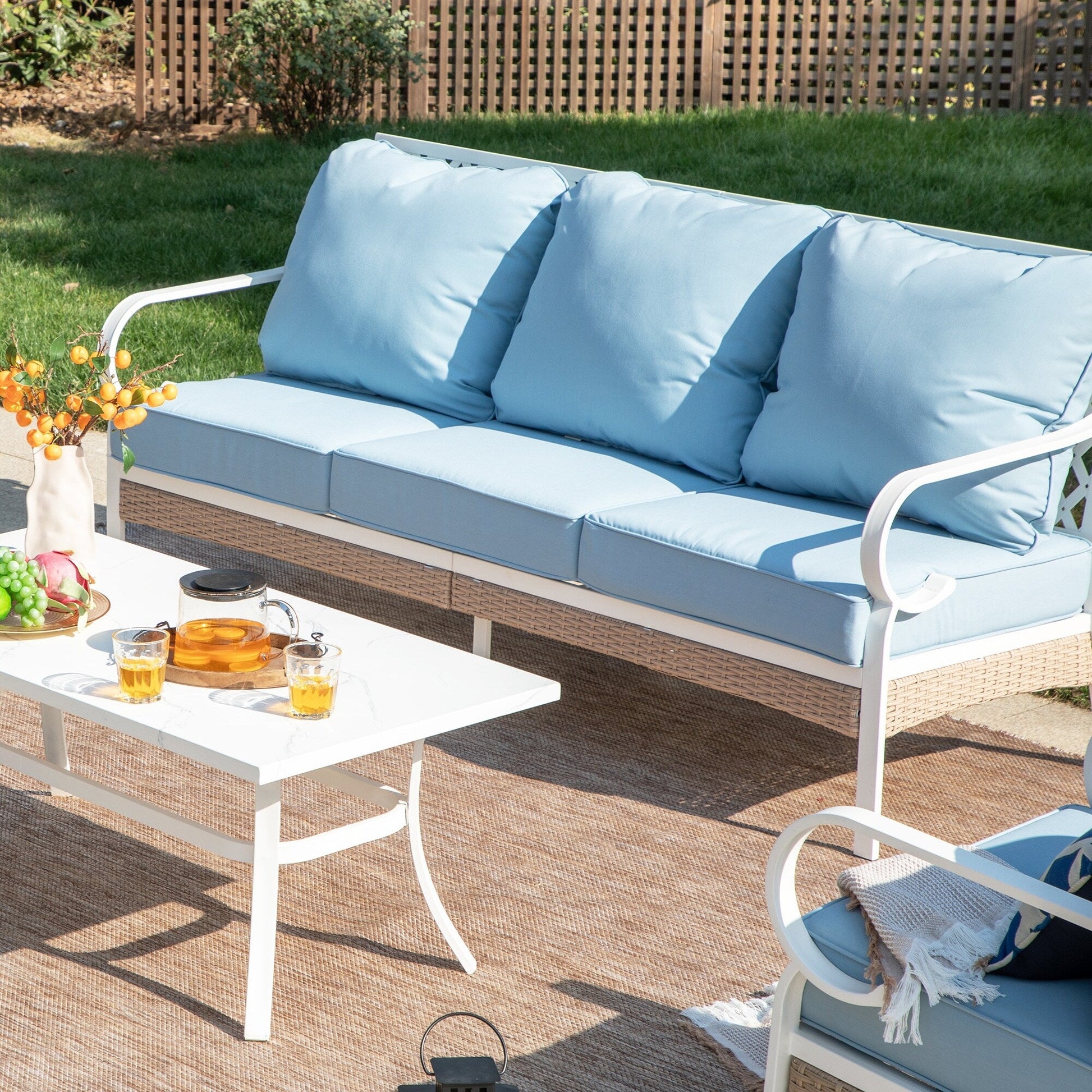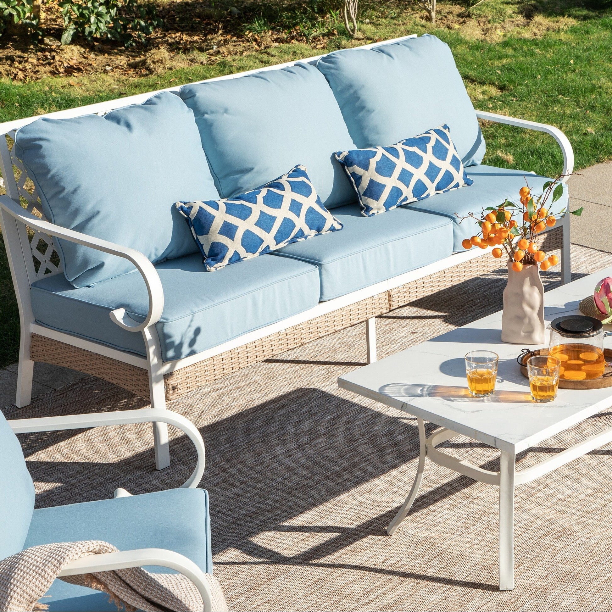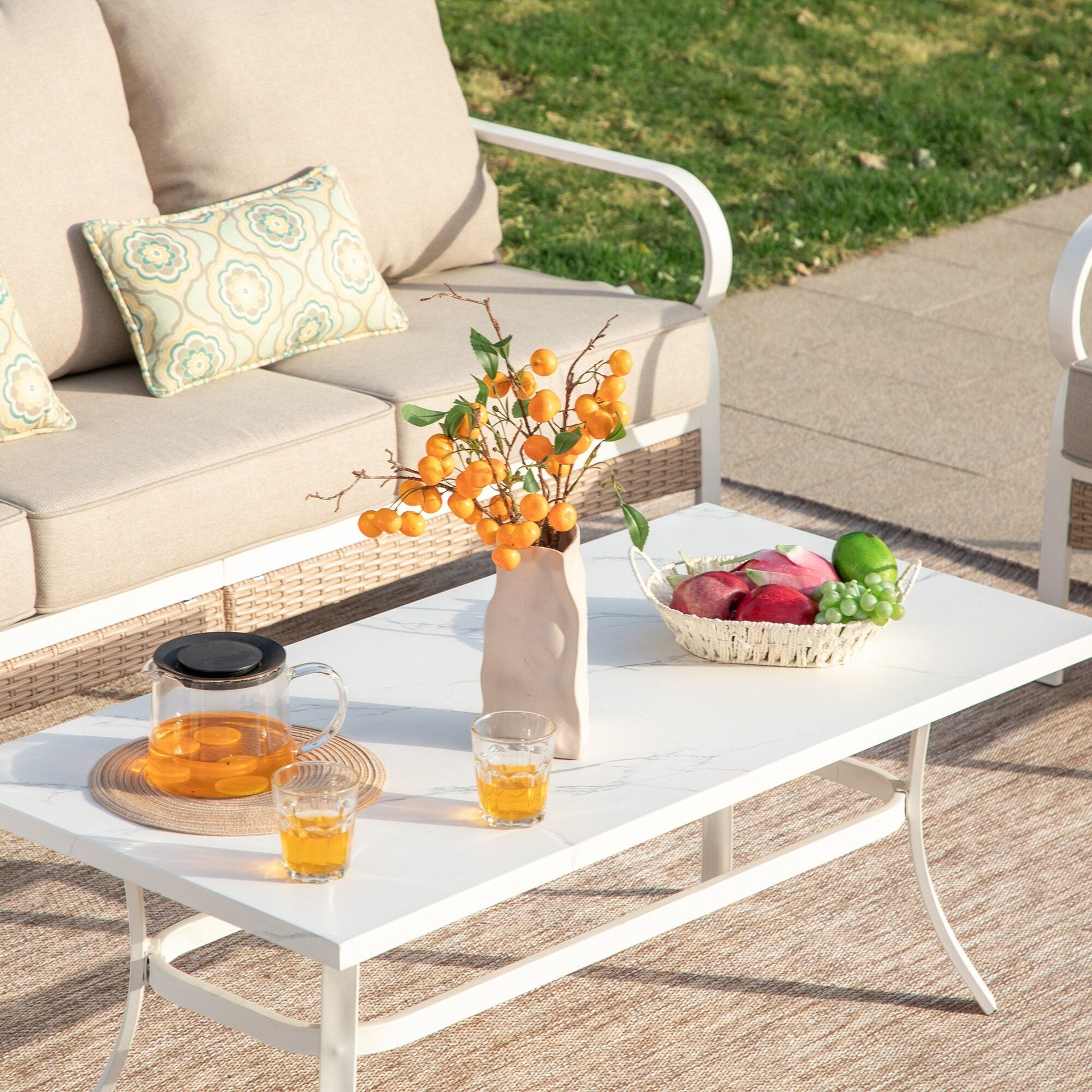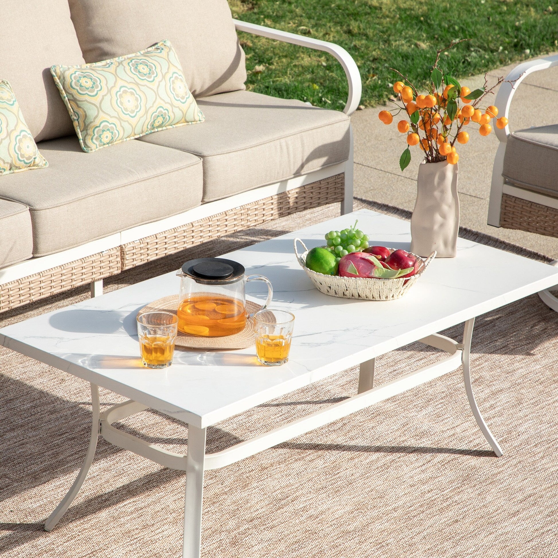 MAISON ARTS Set di mobili da giardino a 5 posti, 2 sedie imbottite in metallo, 1 divano a 3 posti con tavolino da caffè marmorizzato