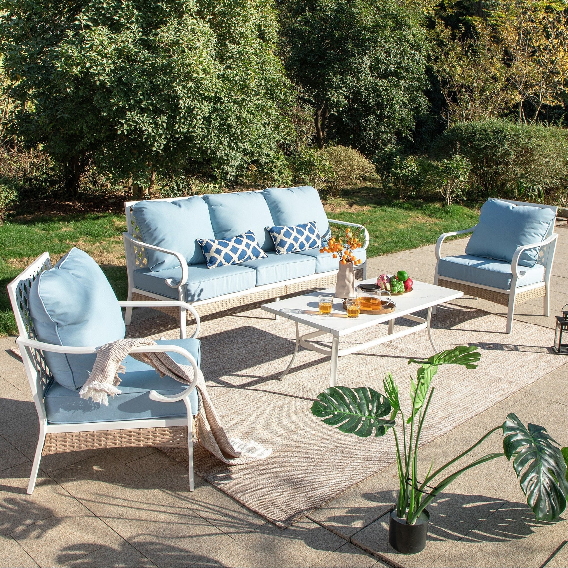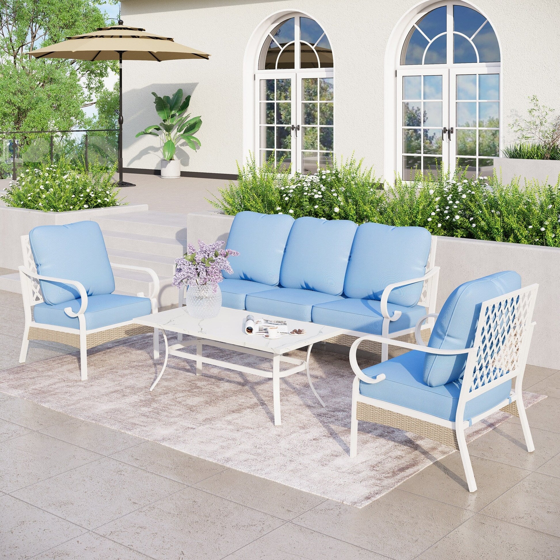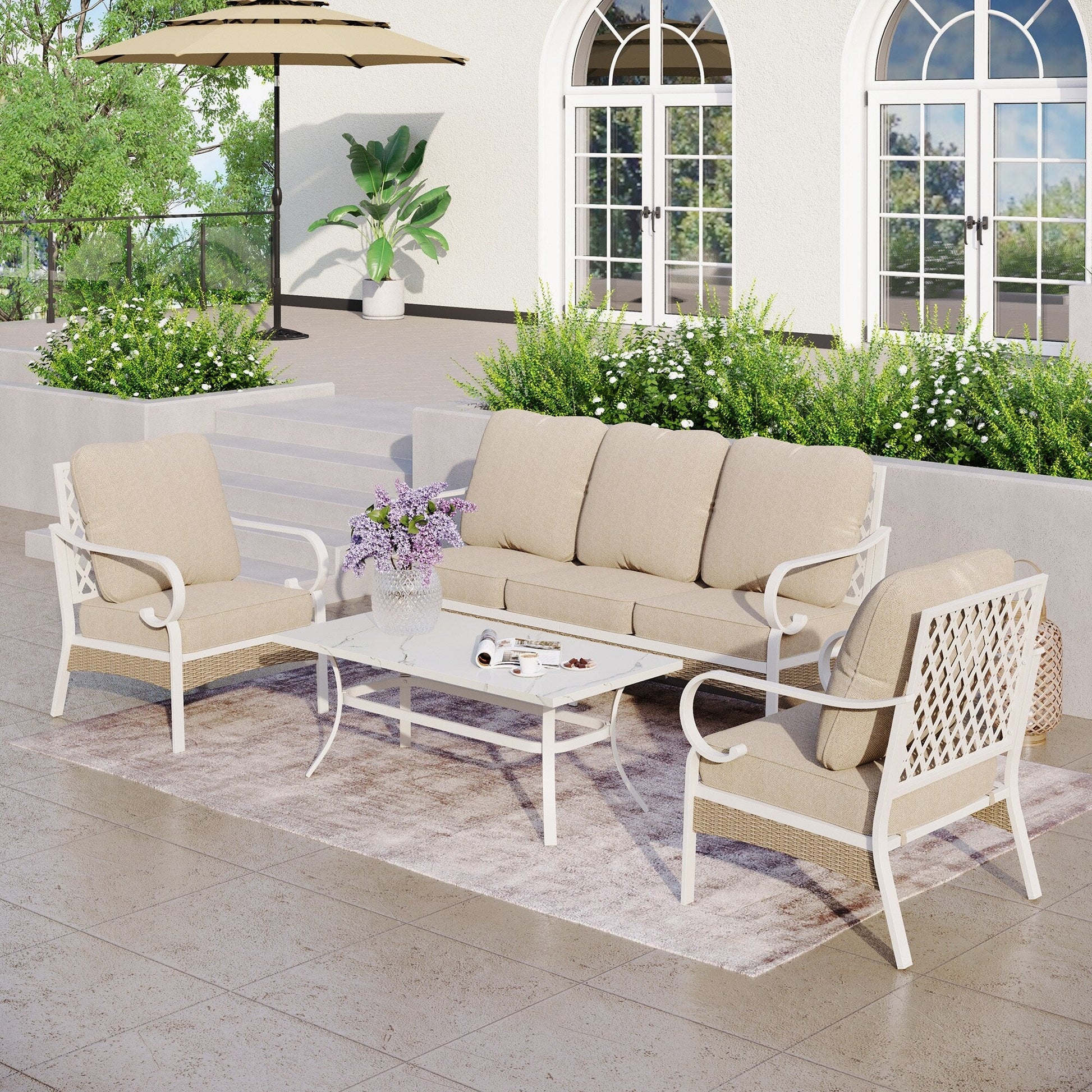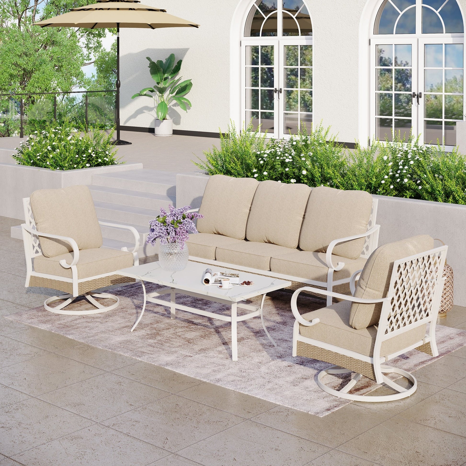 MAISON ARTS Set di mobili da giardino a 5 posti, 2 sedie imbottite in metallo, 1 divano a 3 posti con tavolino da caffè marmorizzato