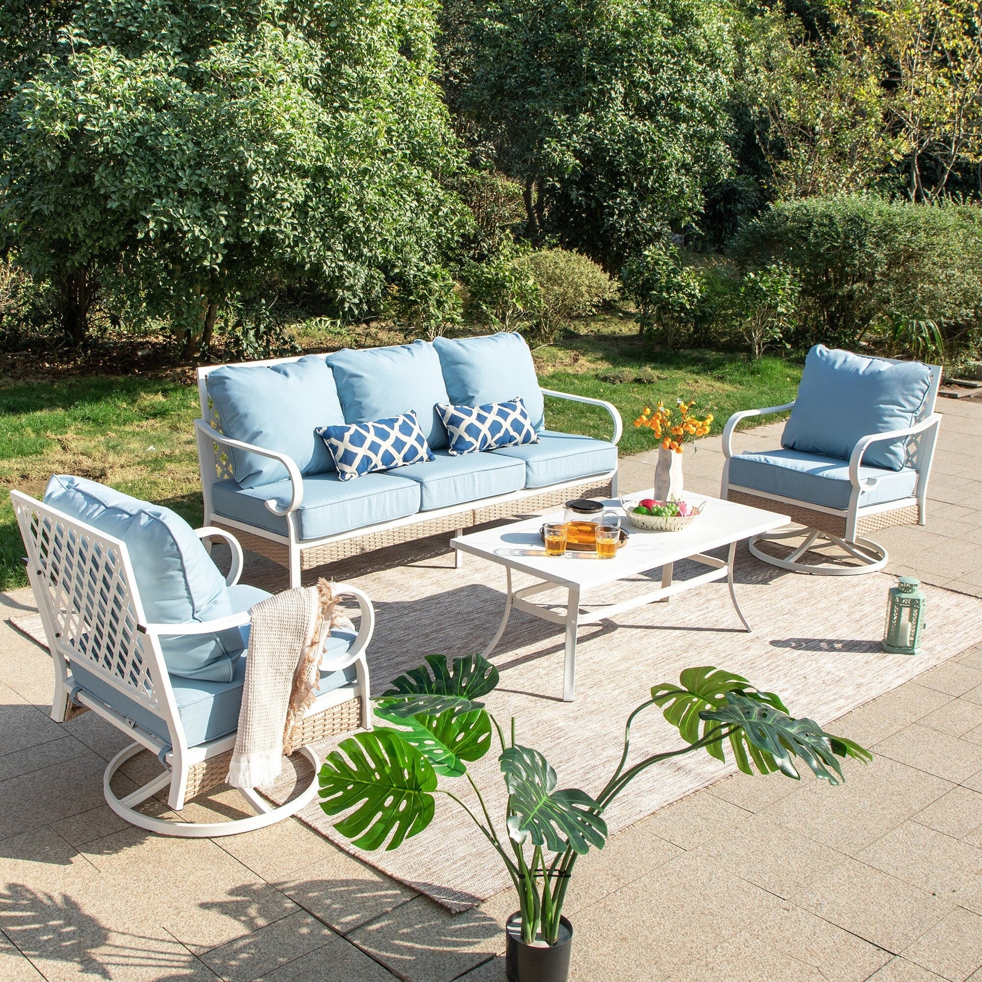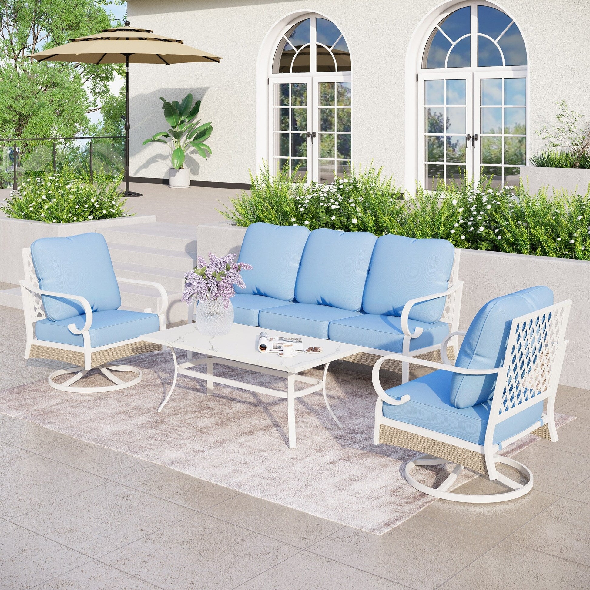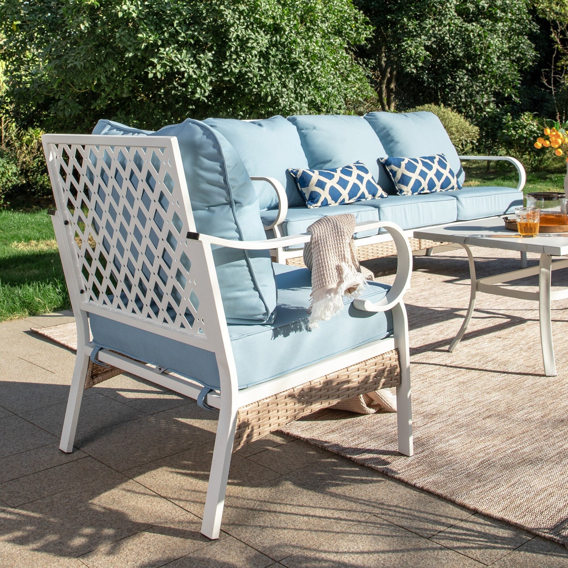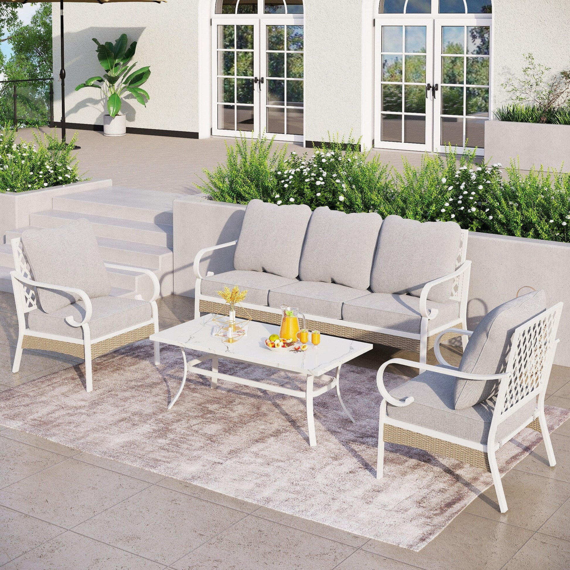 MAISON ARTS Set di mobili da giardino a 5 posti, 2 sedie imbottite in metallo, 1 divano a 3 posti con tavolino da caffè marmorizzato