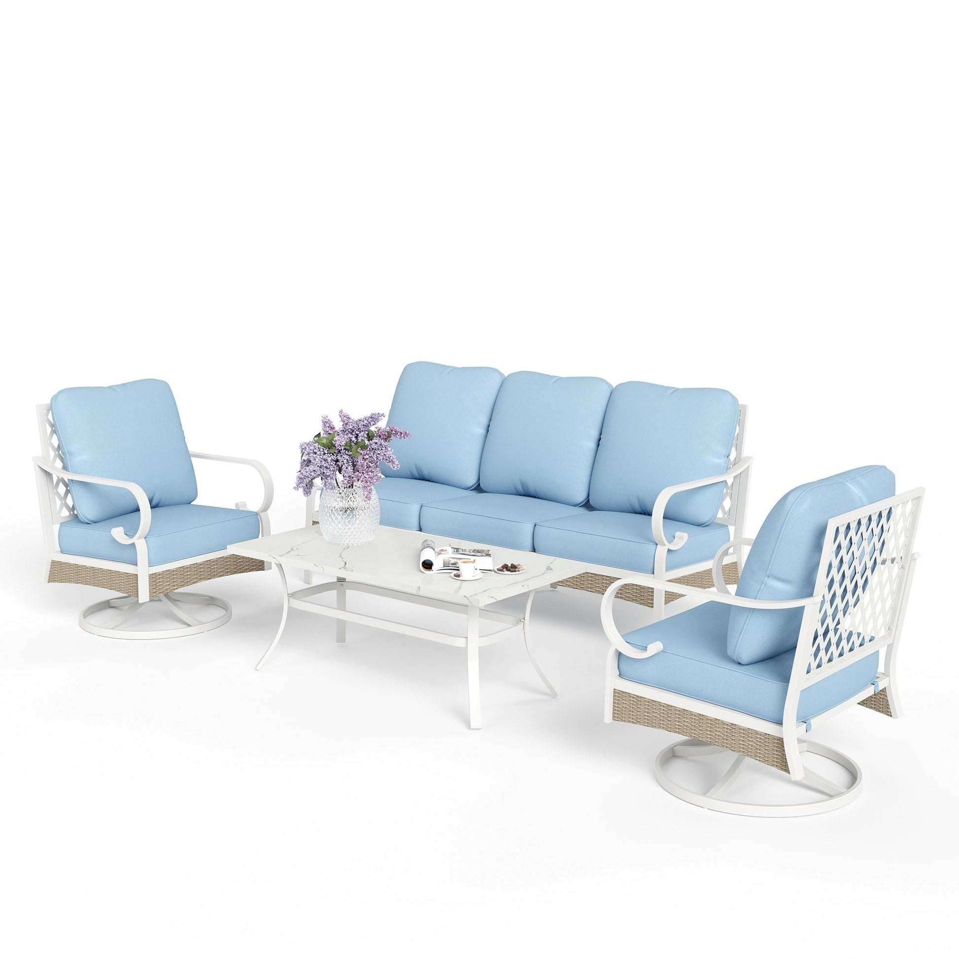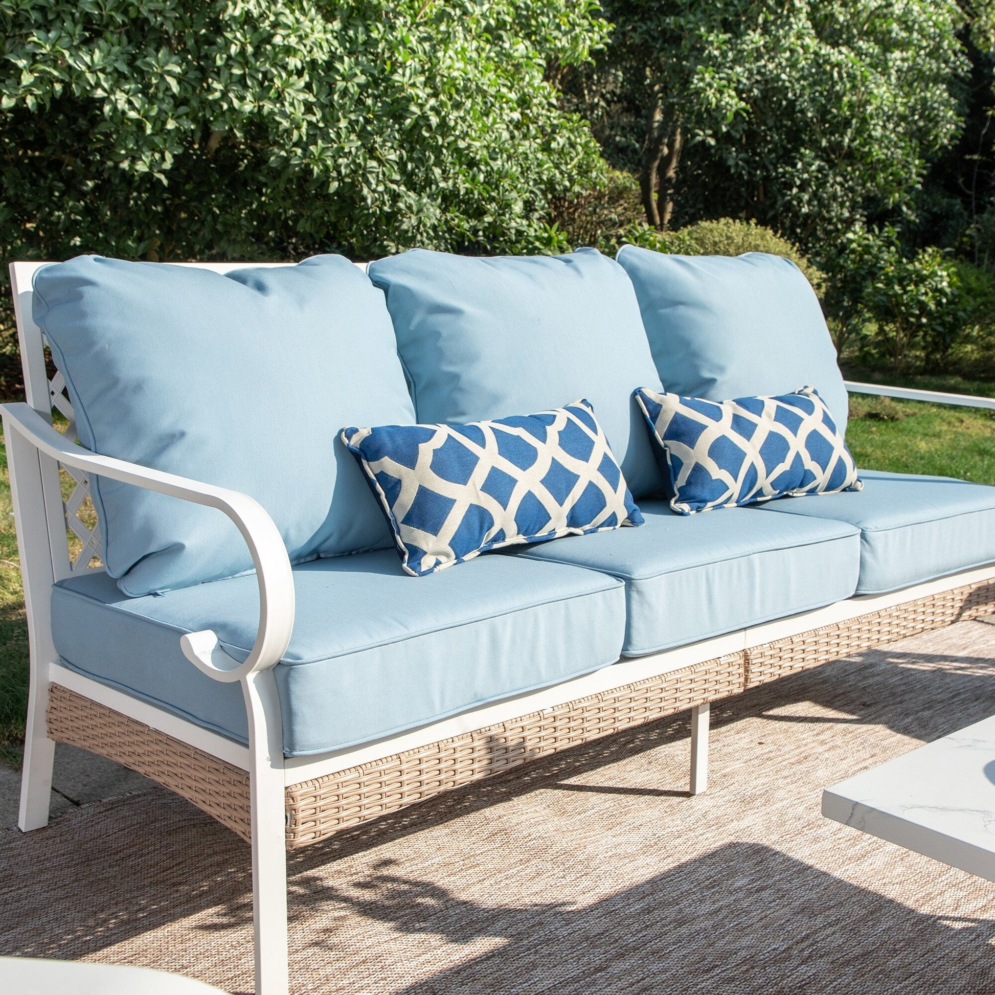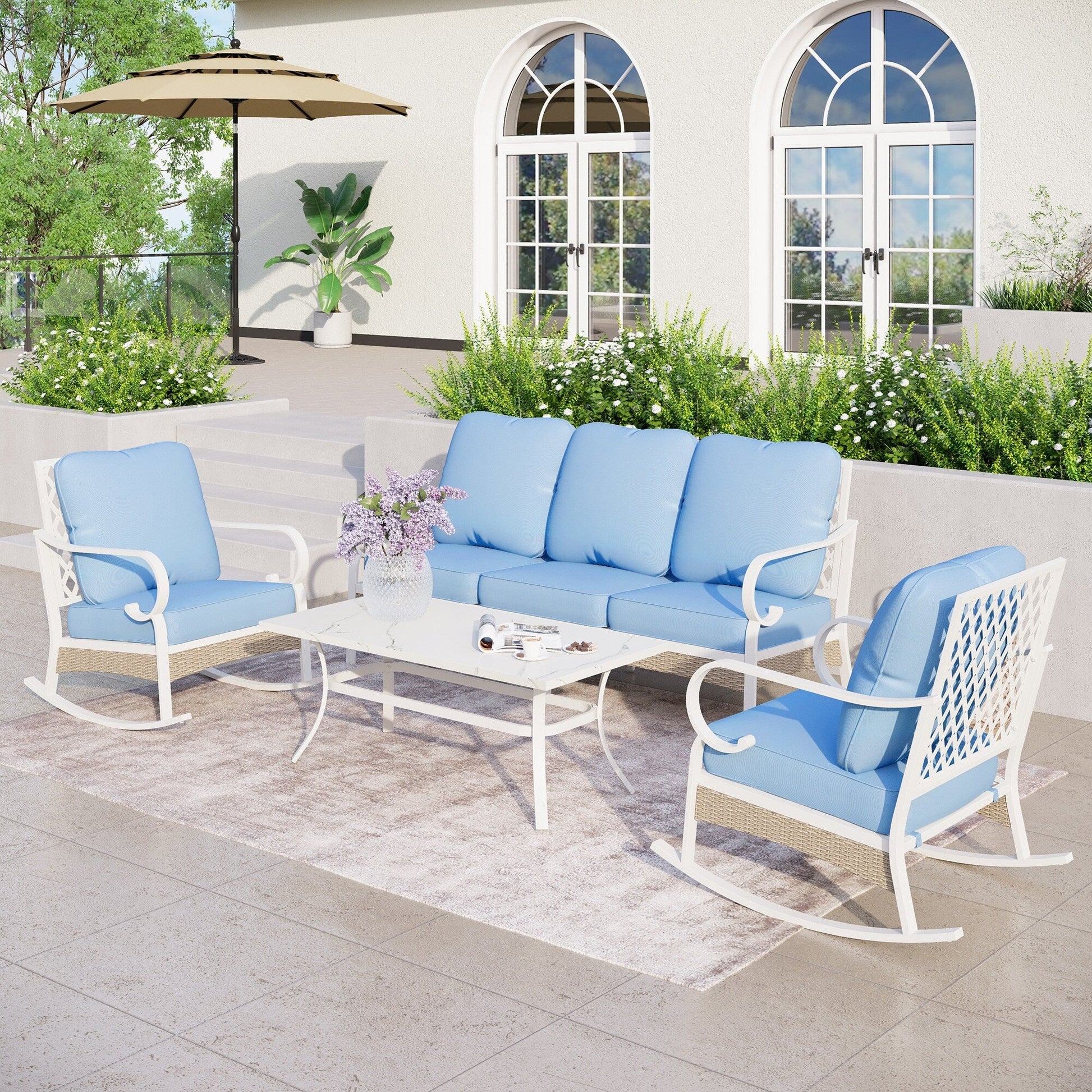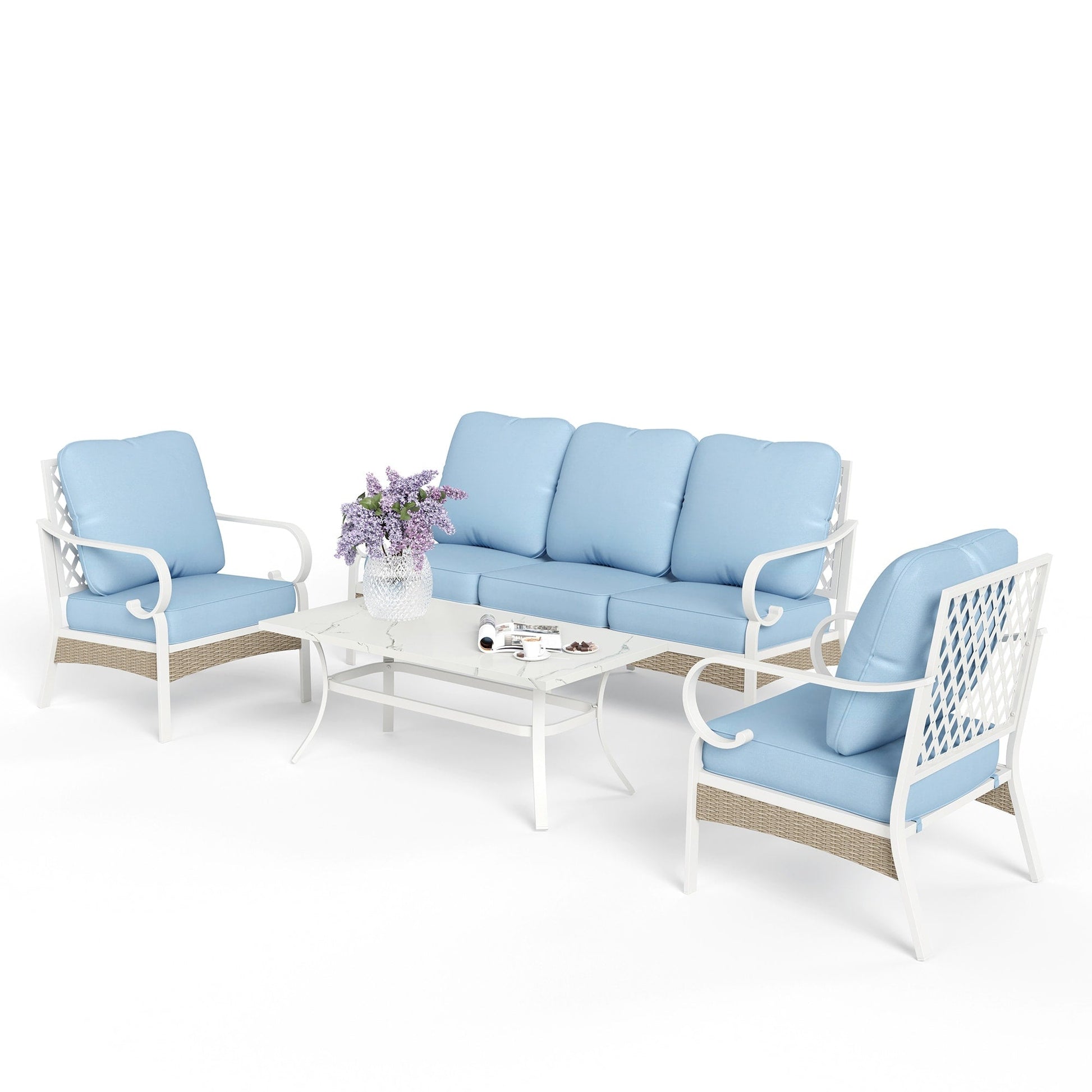 MAISON ARTS Set di mobili da giardino a 5 posti, 2 sedie imbottite in metallo, 1 divano a 3 posti con tavolino da caffè marmorizzato