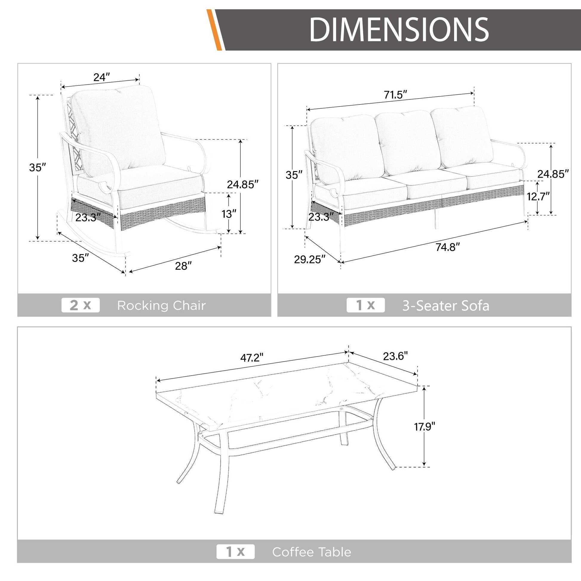 • Set 2: sedia a dondolo*2 + divano a 3 posti*1 + tavolino*1