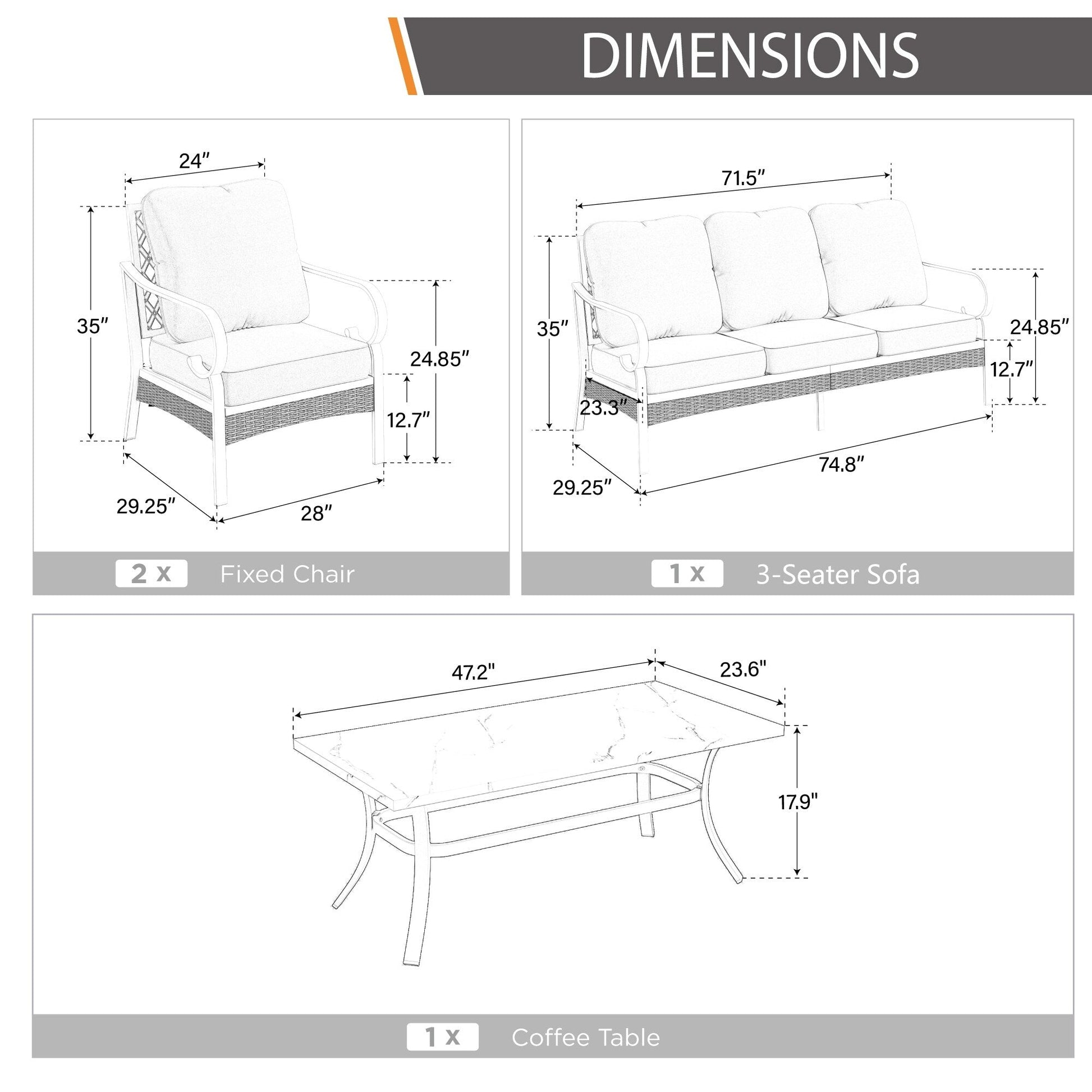 • Set 1: sedia fissa*2 + divano a 3 posti*1 + tavolino*1