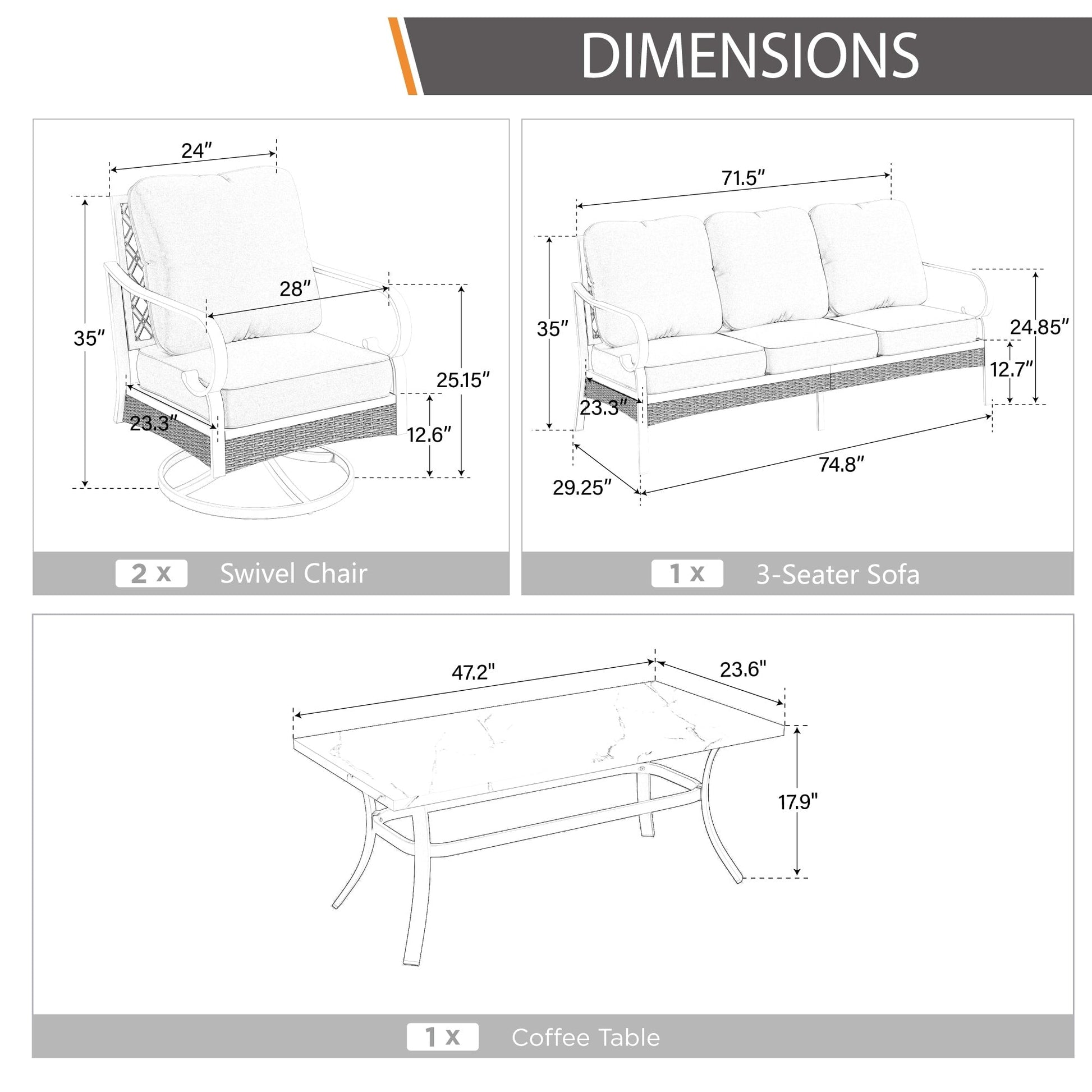 • Set 3: sedia girevole*2 + divano a 3 posti*1 + tavolino*1