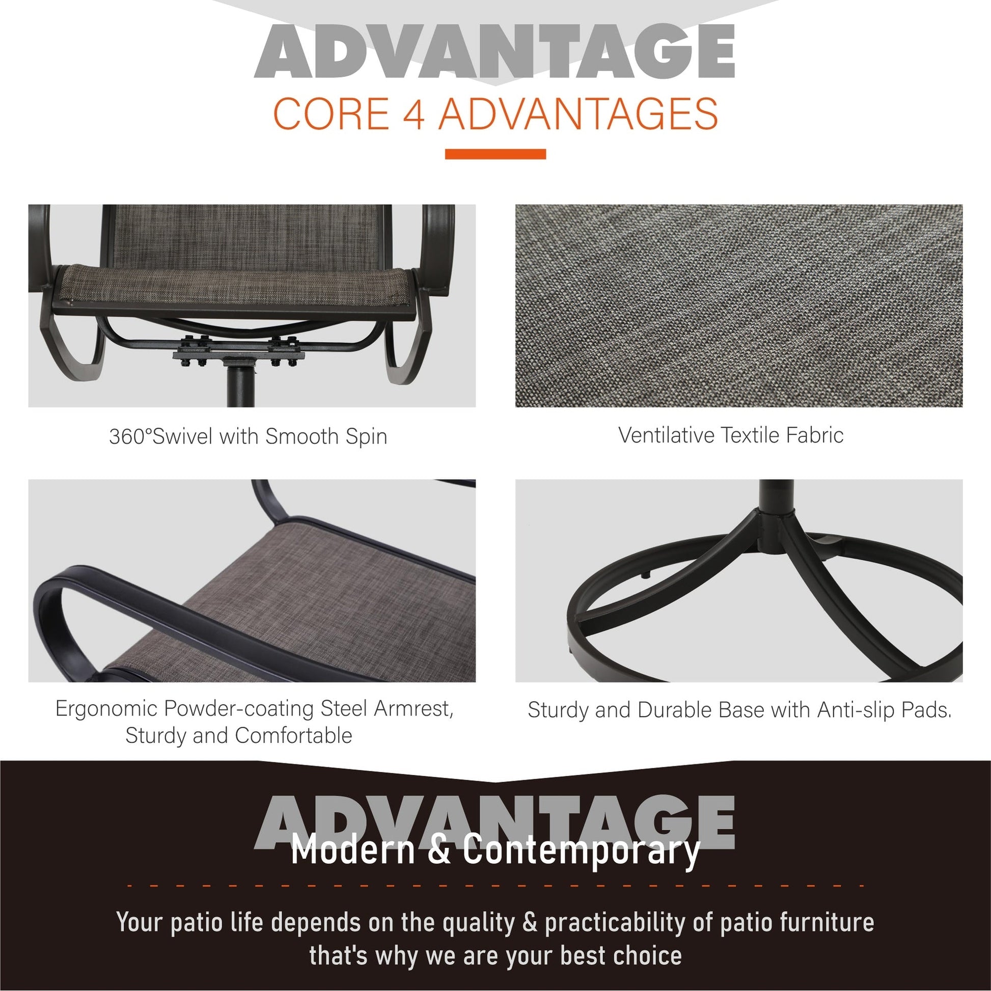 Migliora la tua esperienza di pranzo all'aperto con il nostro set da pranzo da 7 pezzi per patio, dotato di comode e resistenti sedie girevoli in Textilene. Realizzato con una robusta struttura in acciaio e un rivestimento epossidico antiruggine e anticorrosione, questo set è progettato per durare in qualsiasi condizione atmosferica. Le sedie girevoli sono realizzate in resistente tessuto Textilene color tortora, resistente all'usura, alla corrosione, all'acqua, all'olio e ai raggi UV. Il tavolo da pranzo è dotato di un foro centrale per ombrellone (copertura inclusa) per fornire ombra opzionale. Perfetto sia per uso interno che esterno, questo set è coperto da una garanzia di 1 anno. È richiesto il montaggio.