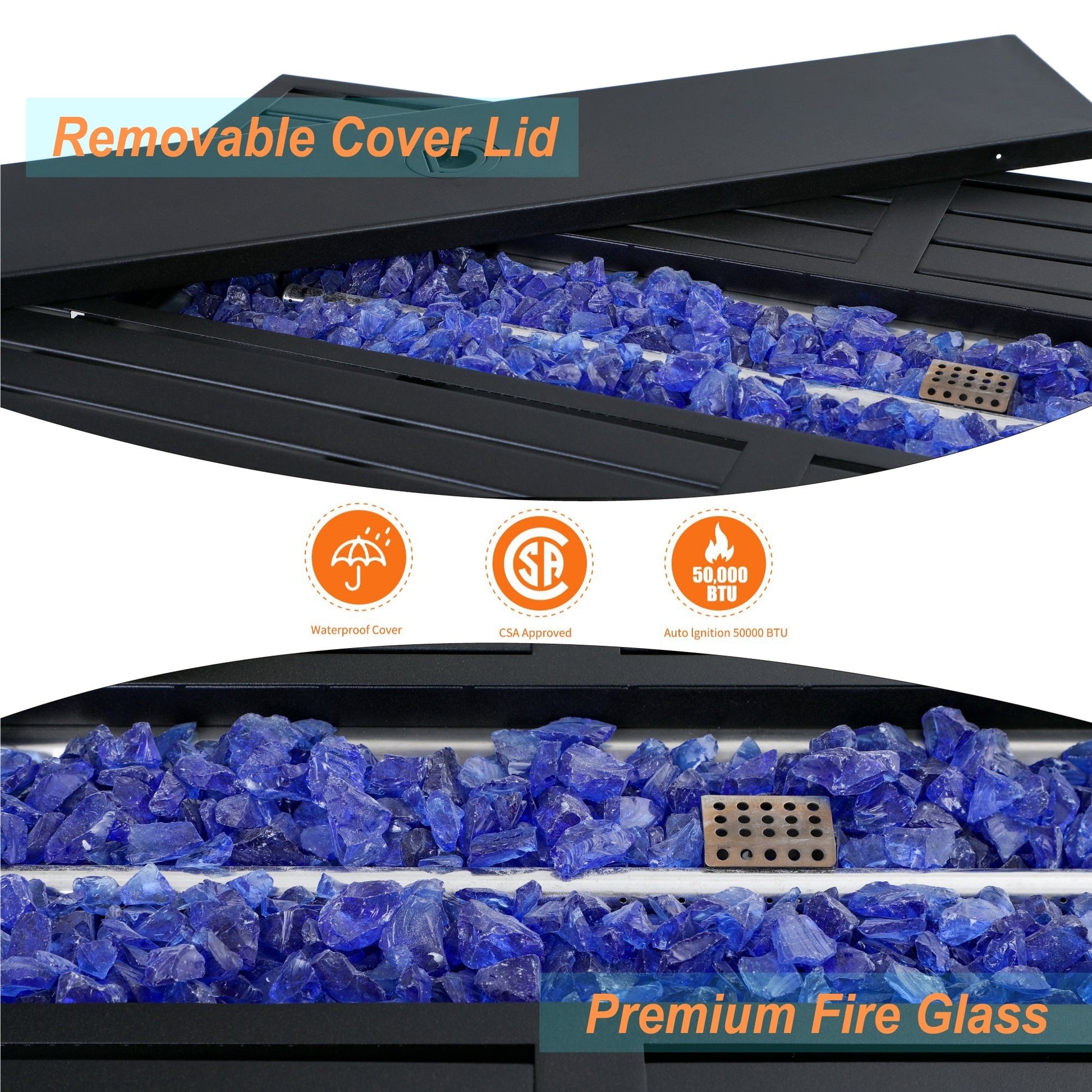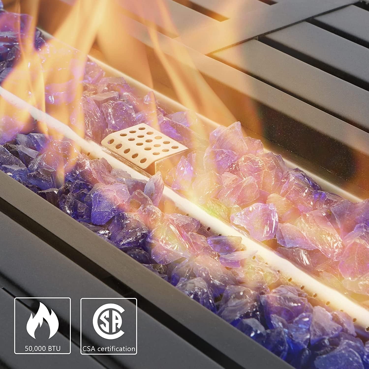 - Il bruciatore centrale in acciaio inossidabile emette 50.000 BTU di calore, mentre i 11 libbre di vetro antincendio di colore blu offrono sia un aspetto gradevole che una buona ritenzione del calore.