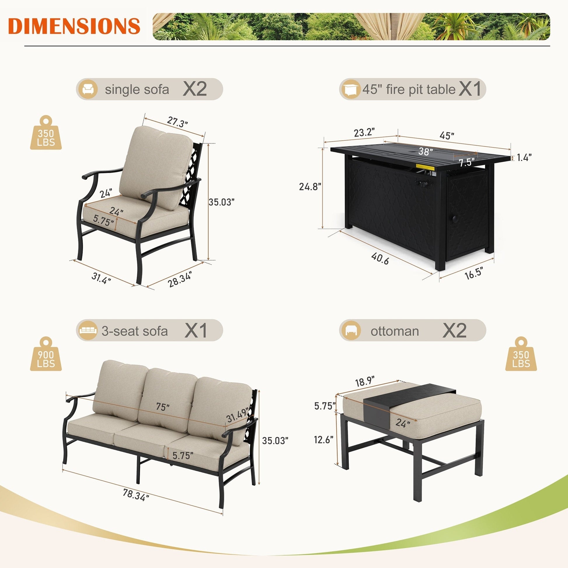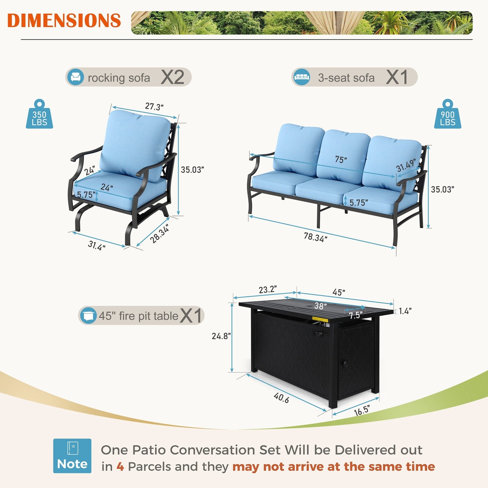 - Set 4: sedia fissa*2 + divano a 3 posti*1 + 2 pouf + tavolo con braciere*1
