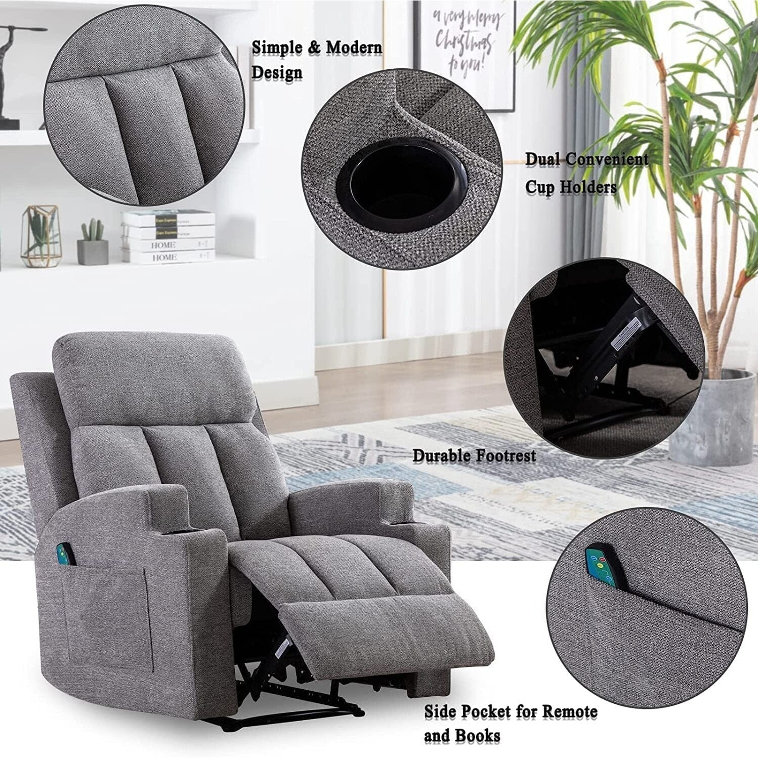Prova il massimo comfort e relax con la nostra poltrona reclinabile massaggiante con riscaldamento e vibrazione manuale. Questa poltrona reclinabile è dotata di 8 punti di massaggio (schiena, zona lombare, cosce e gambe) e di un punto di riscaldamento nella zona lombare, alleviando efficacemente dolori e affaticamento. Il tessuto traspirante e la schiuma ad alta densità offrono comfort e supporto per la schiena e la zona lombare. Grazie ai comodi portabicchieri, alla tasca laterale e al poggiapiedi facile da usare, questa poltrona è perfetta per leggere, guardare la TV, dormire o stare in piedi. Il montaggio è semplicissimo e può essere eseguito da una sola persona in pochi minuti.