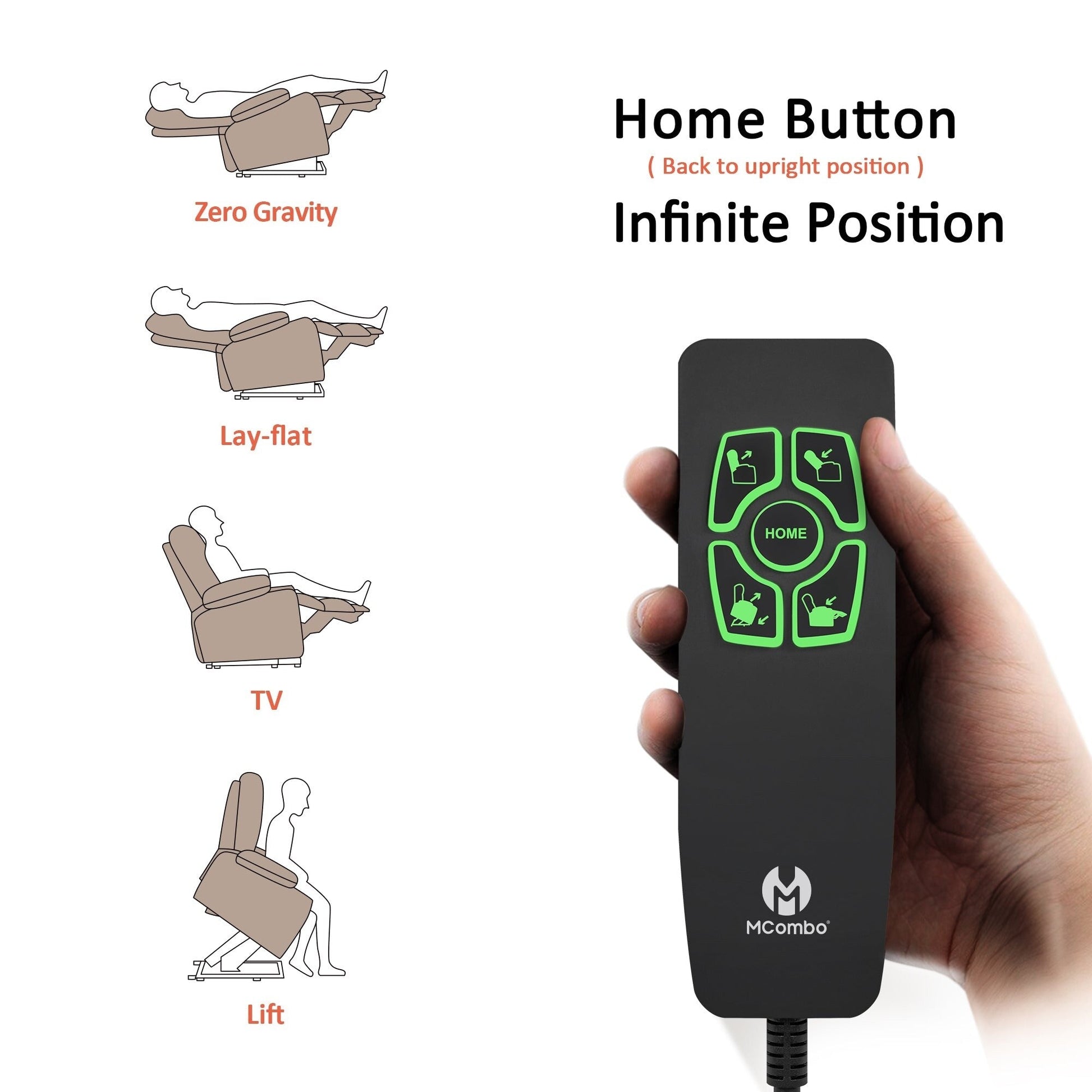 • Pulsante Home: quando qualcuno bussa alla porta, basta premere il pulsante HOME sul telecomando e si tornerà in posizione verticale in un massimo di ''16'' secondi. Quando la posizione reclinata viene sollevata, lo schienale si muoverà per primo per garantire la tua sicurezza.