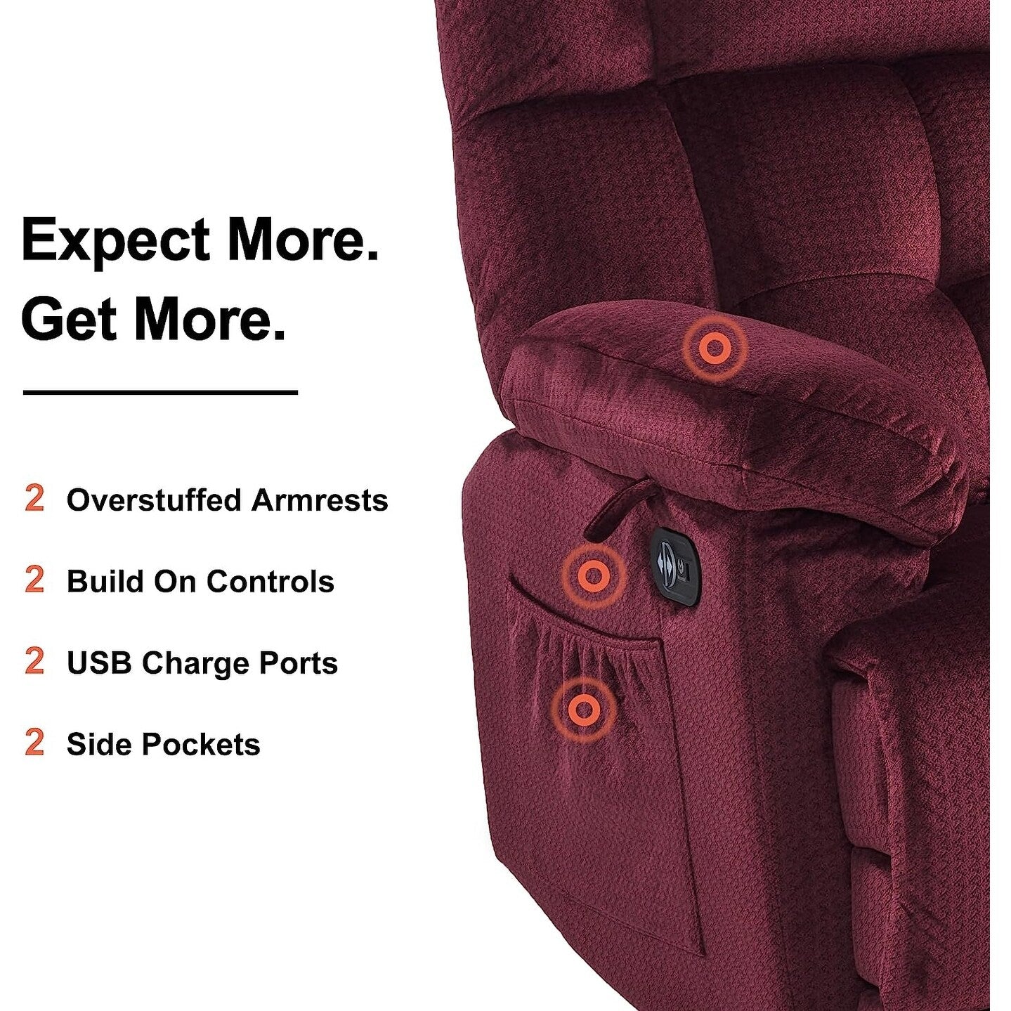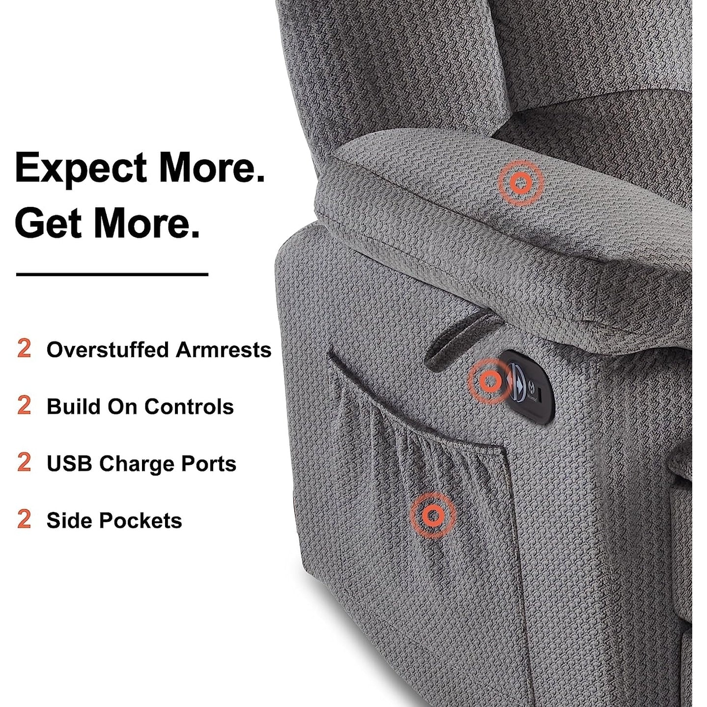 • Reclinazione elettrica: la reclinazione elettrica del divano a due posti è controllata dal pulsante integrato nel bracciolo. Basta premere i pulsanti su entrambi i lati del bracciolo per regolare agevolmente il poggiapiedi e lo schienale nella posizione di reclinazione preferita. (Ogni sedile può essere controllato individualmente.)