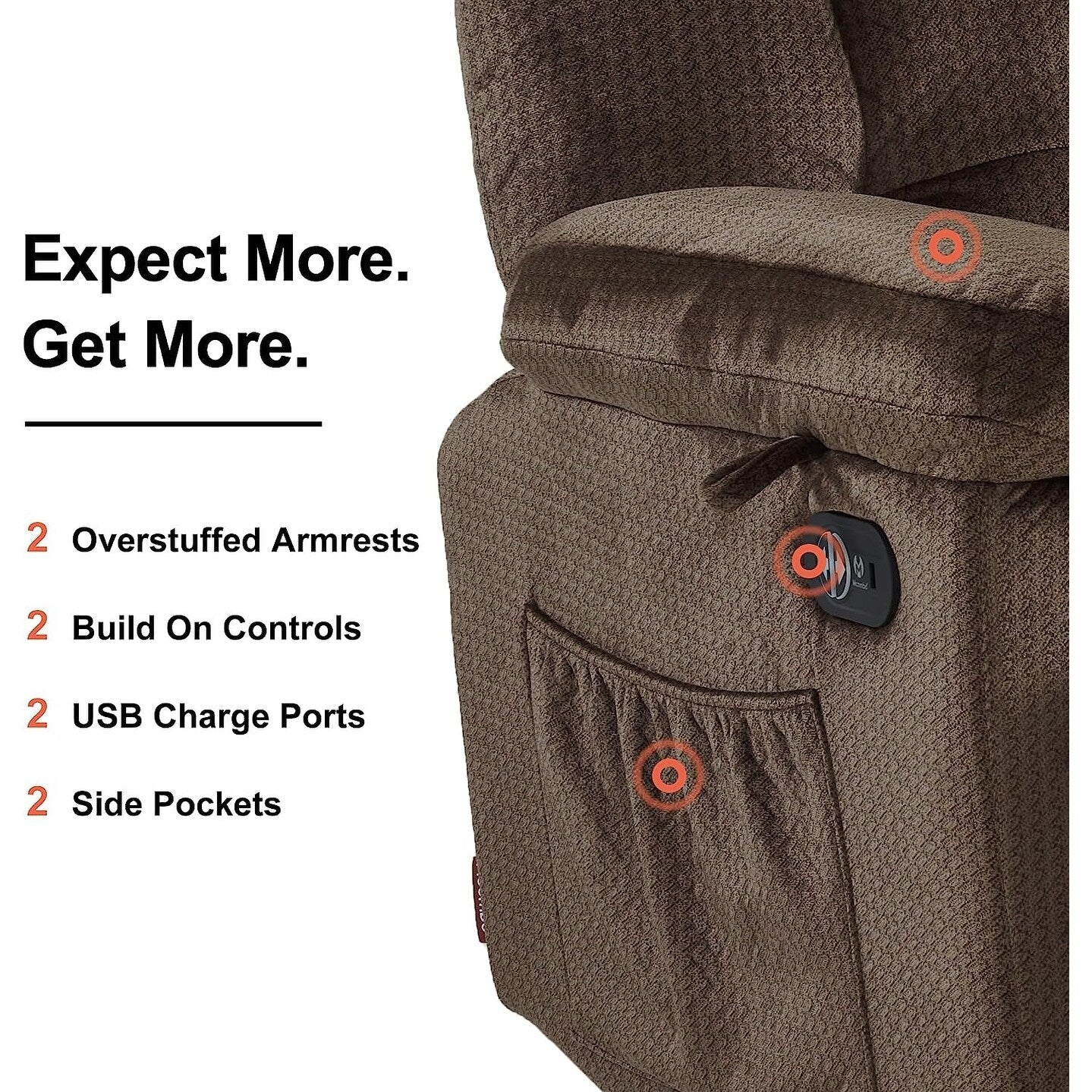 • 2 porte USB, tasche laterali: grazie alle porte USB, puoi tenere i tuoi dispositivi indispensabili sempre carichi e a portata di mano. Nel frattempo, puoi riporre piccoli oggetti o riviste nelle tasche laterali, a seconda delle tue esigenze. (SOLO per dispositivi a basso consumo, come i cellulari.)