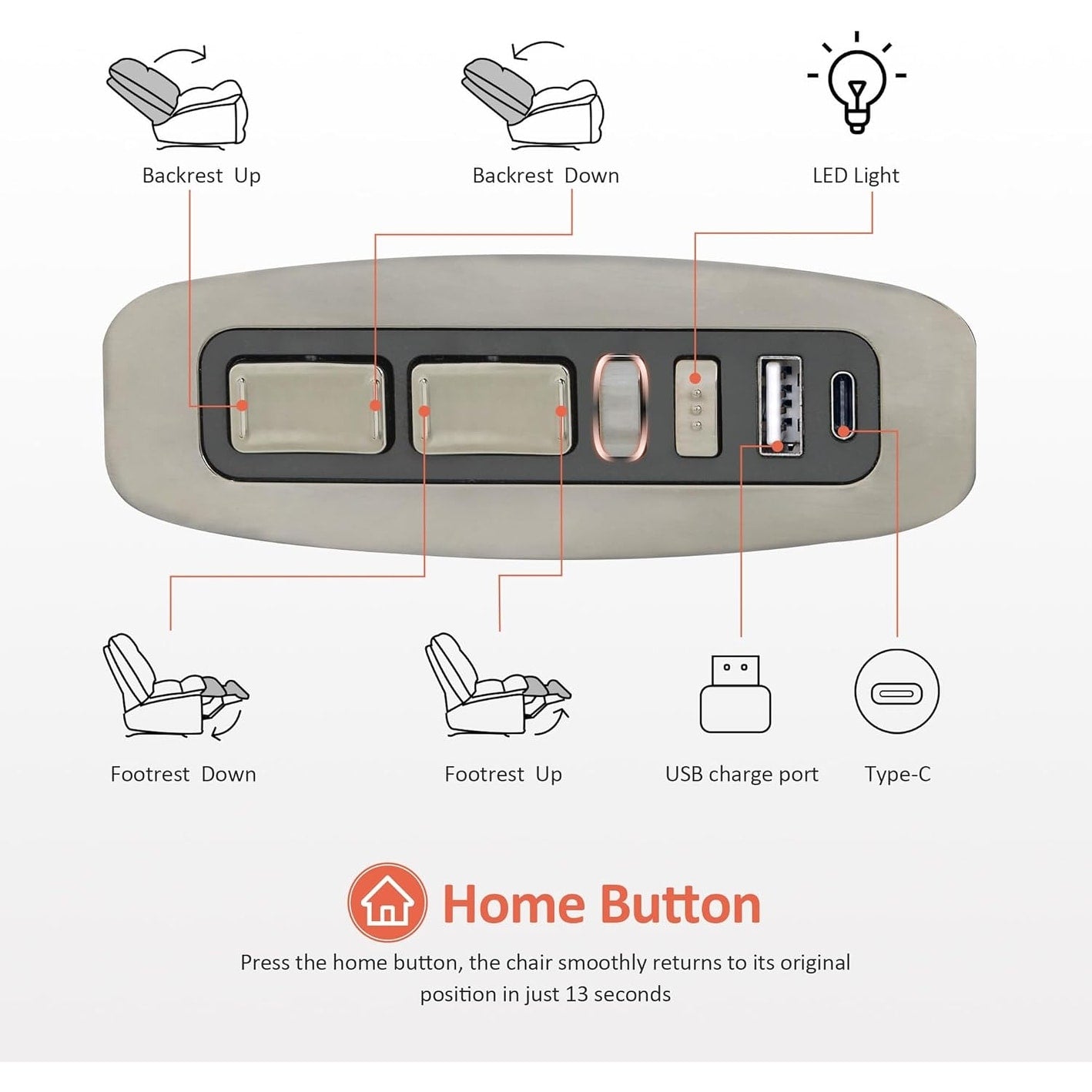 • RESET CON UN TOCCO E ILLUMINAZIONE A LED. Premendo il pulsante Home, la sedia torna dolcemente alla sua posizione originale in soli 13 secondi. Le doppie porte USB e Type-C sul bracciolo supportano qualsiasi telefono o tablet, e l'illuminazione a LED garantisce un maggiore relax.