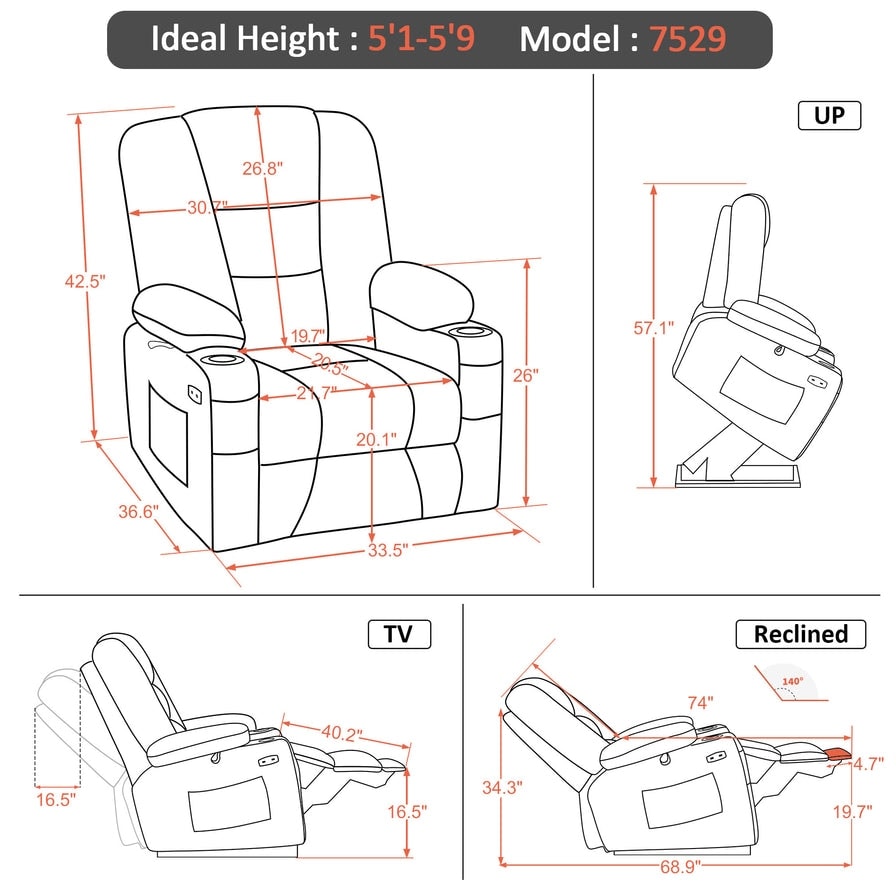 • Assistenza al sollevamento elettrico: meccanismo di sollevamento controbilanciato per aiutare l'anziano ad alzarsi facilmente, regolabile senza problemi nella posizione di sollevamento o reclinazione preferita premendo i pulsanti (angolo di reclinazione massimo: 140°)