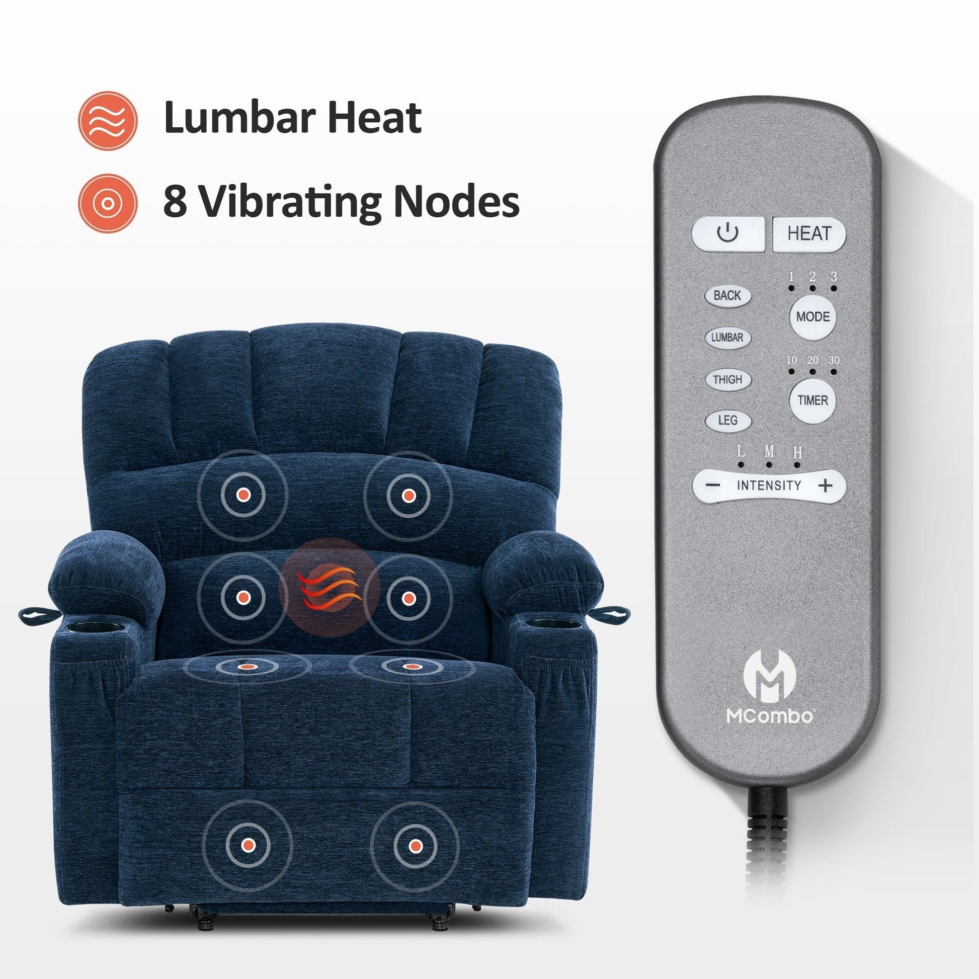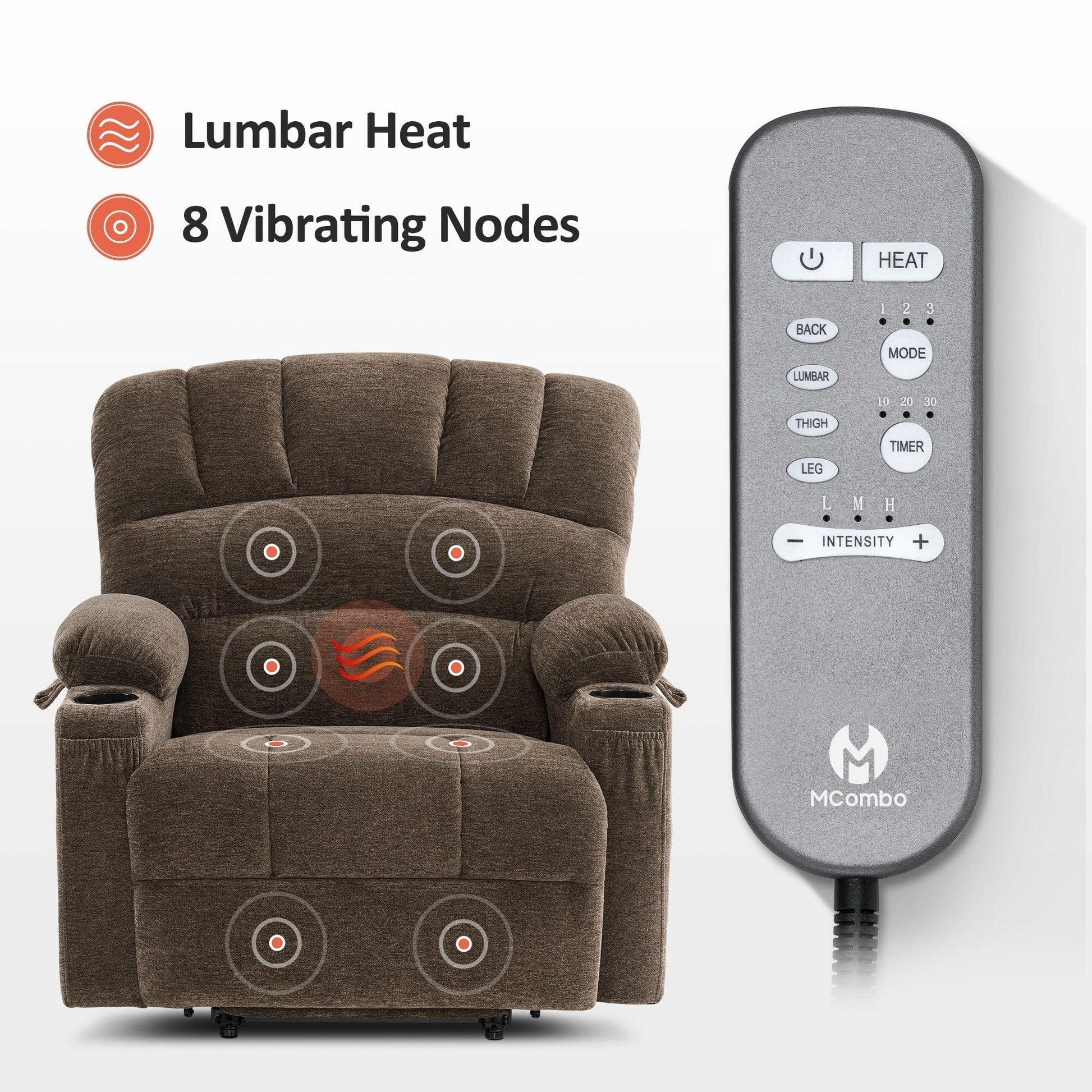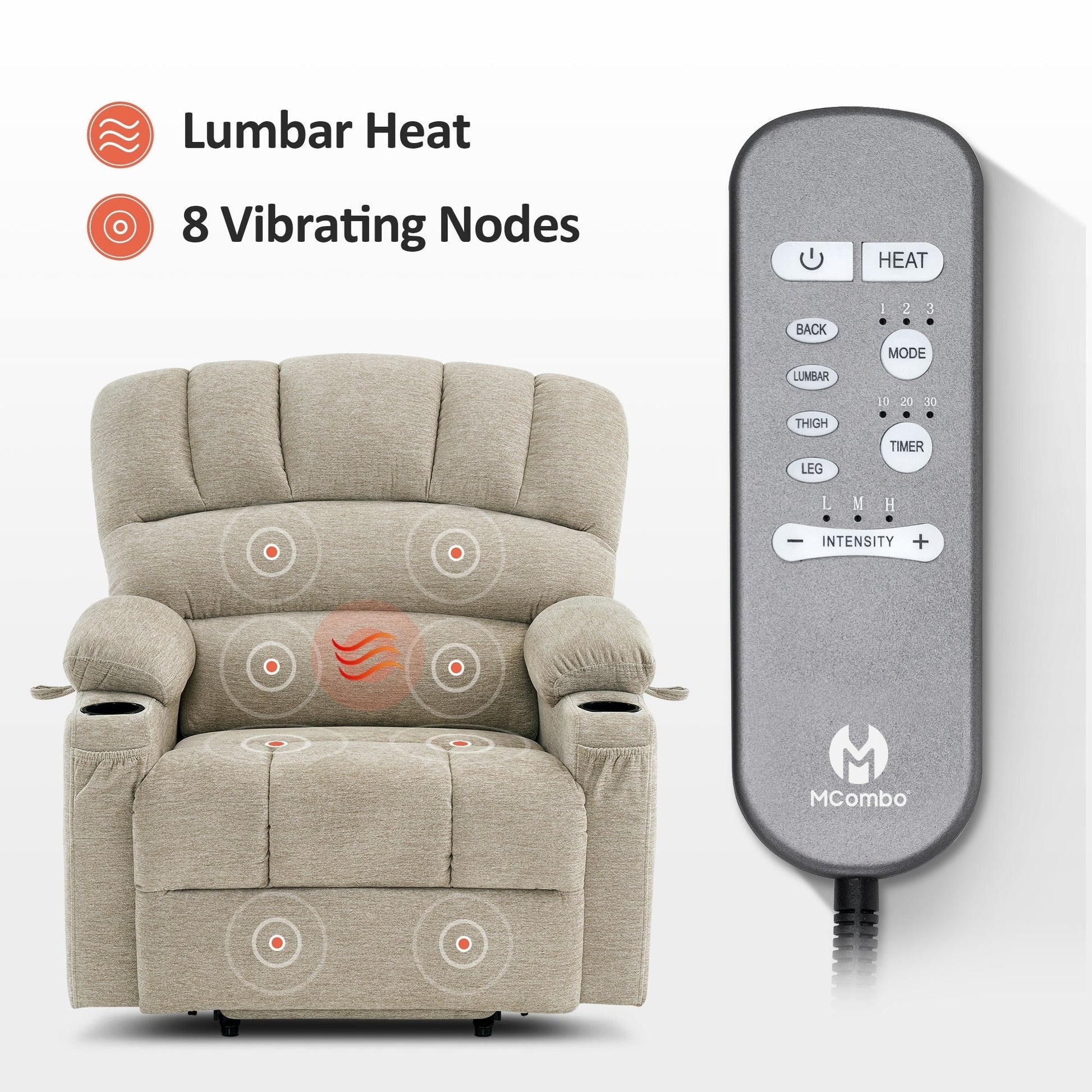 Poltrona reclinabile MCombo con massaggio e calore per anziani di corporatura robusta, tessuto R7093 (piccola-larga)