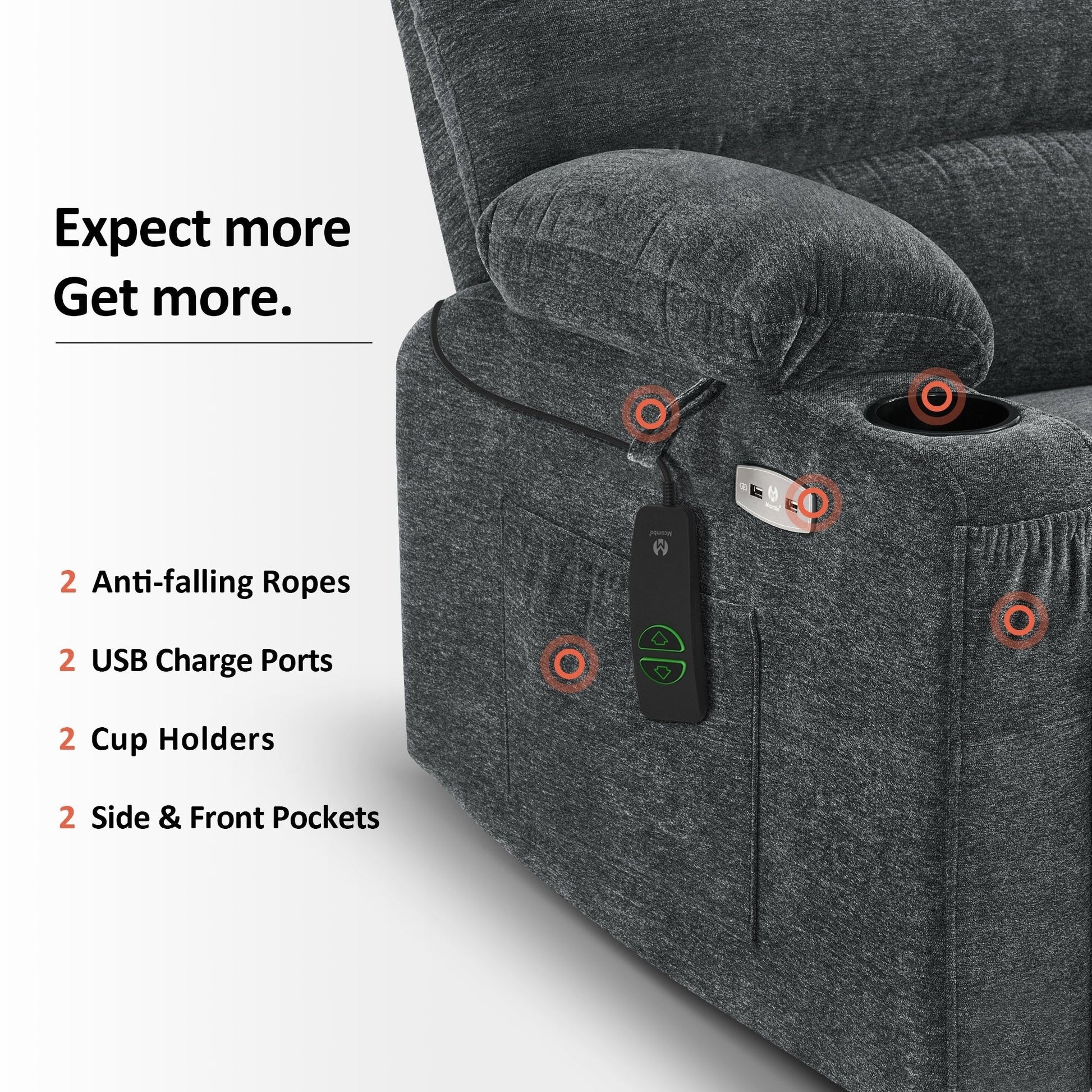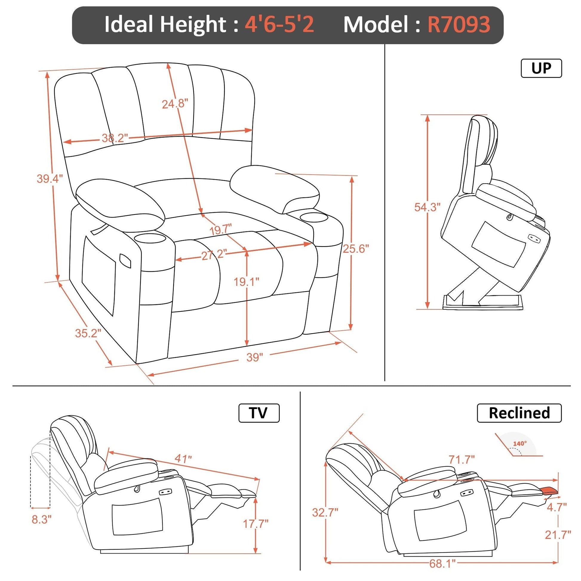 • Assistenza al sollevamento elettrico: meccanismo di sollevamento controbilanciato per aiutare l'anziano ad alzarsi facilmente e ad adattarsi senza problemi alla posizione di sollevamento o reclinazione preferita premendo i pulsanti (angolo di reclinazione massimo: 140°)