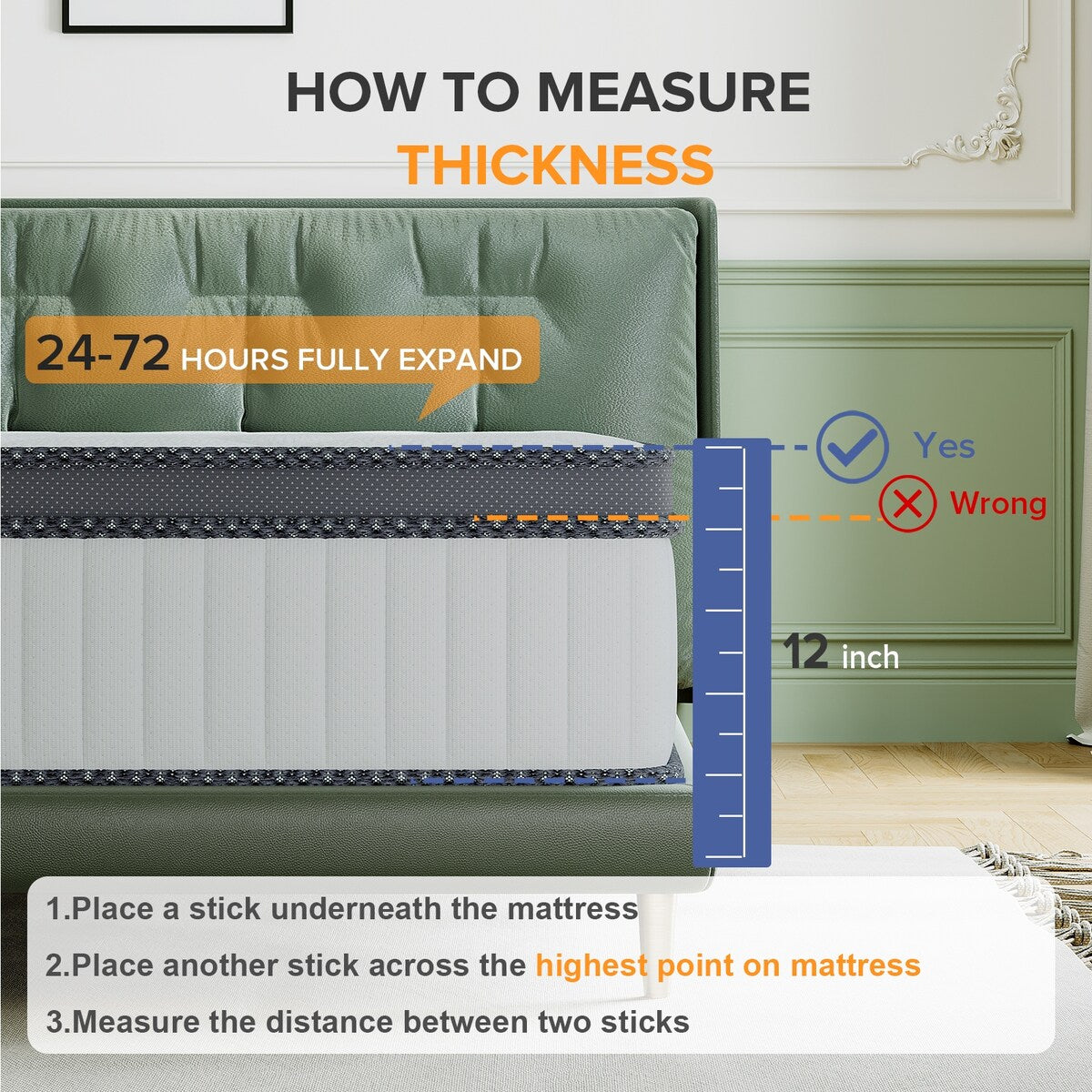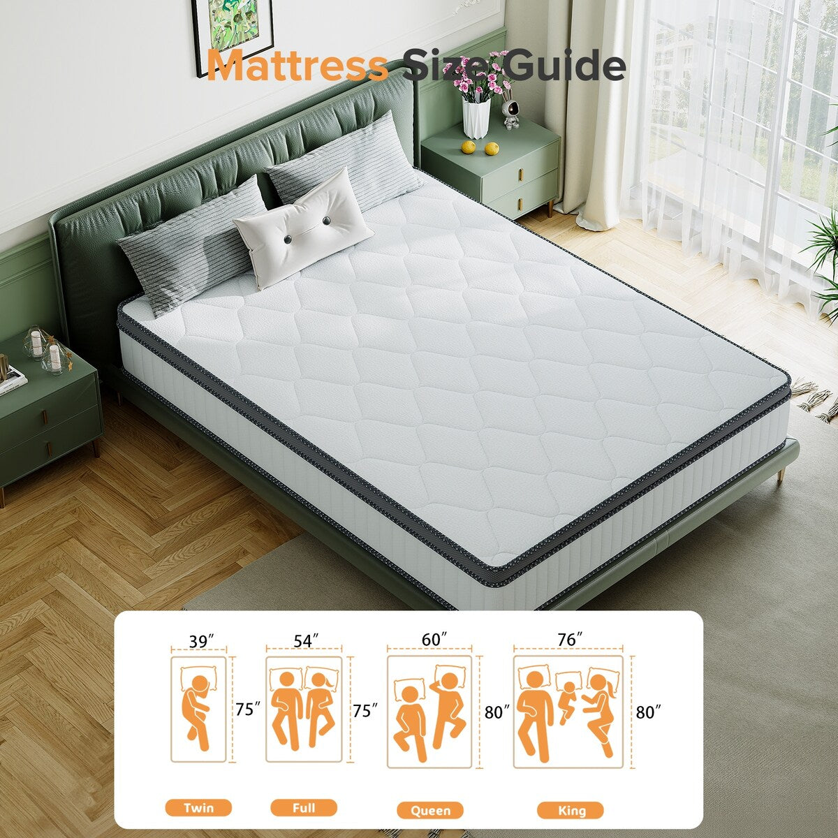 • Queen: 60 pollici di larghezza × 80 pollici di lunghezza × 10 pollici di spessore superiore