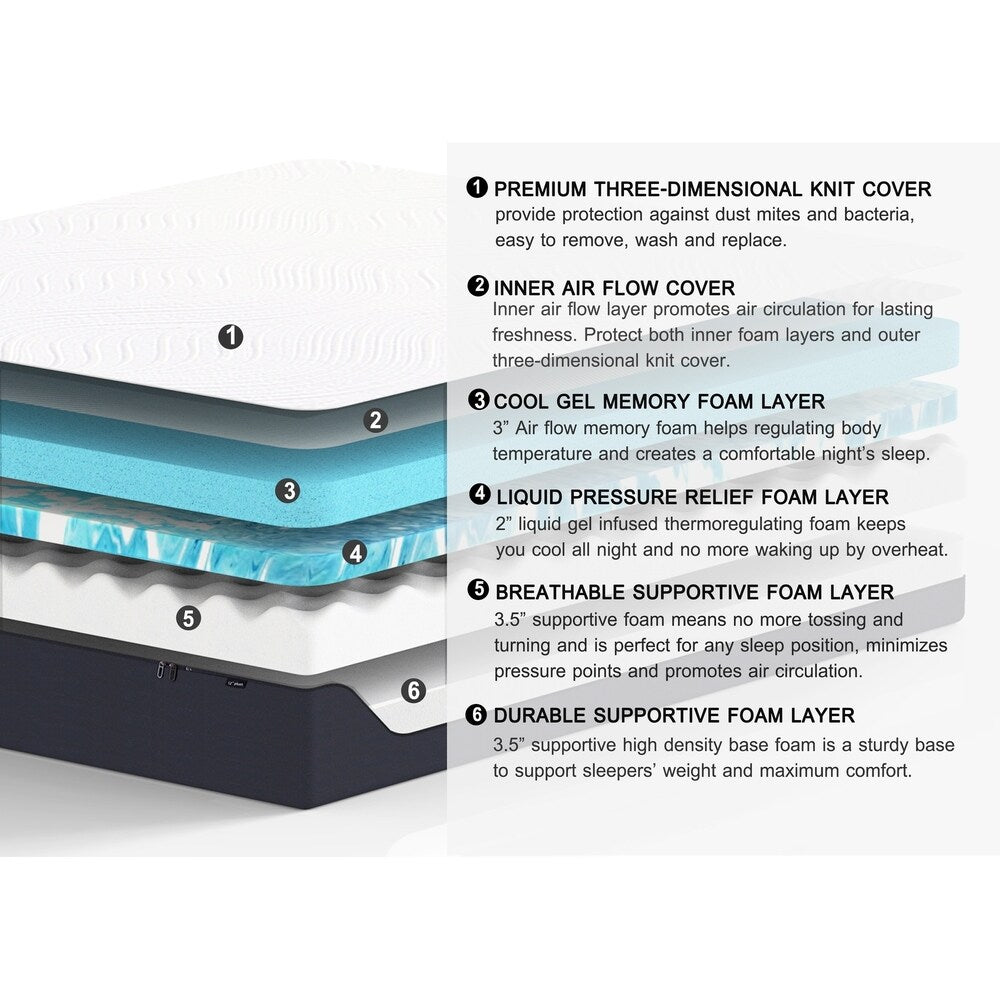 • Spessore del materasso: 12' (3' di memory foam in gel + 2' di schiuma comfort anti-pressione + 3,5' di schiuma di supporto con struttura a circolazione d'aria + 3,5' di schiuma di supporto ad alta densità)