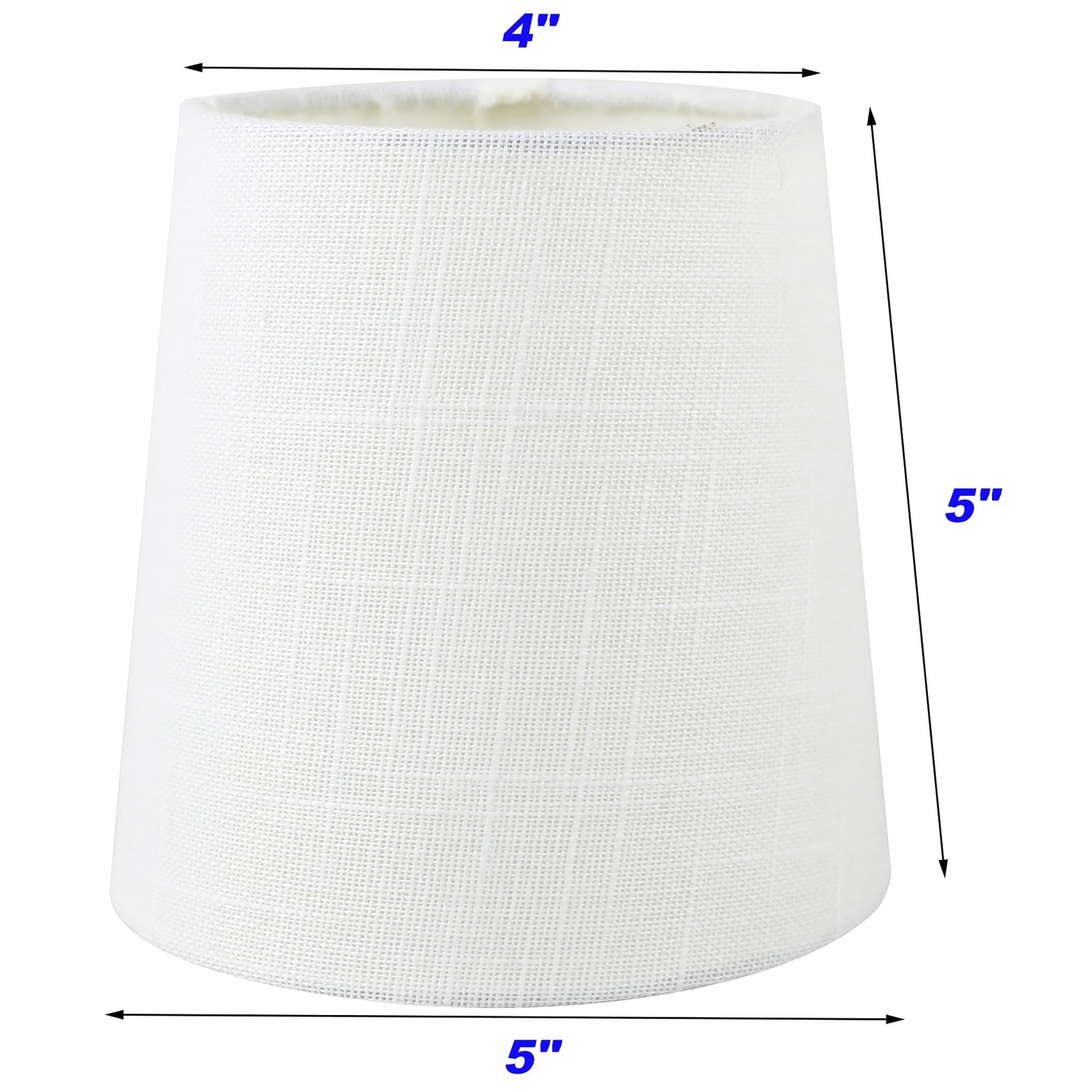 DIMENSIONI PARALUMI: diametro superiore 4', diametro inferiore 5' e altezza 5'. TESSUTO: Lino. Copertina rigida MONTAGGIO: Montatura a clip progettata per adattarsi a lampadine a goccia o a siluro. NON per lampadine standard. POTENZA MASSIMA CONSIGLIATA: 40 watt.