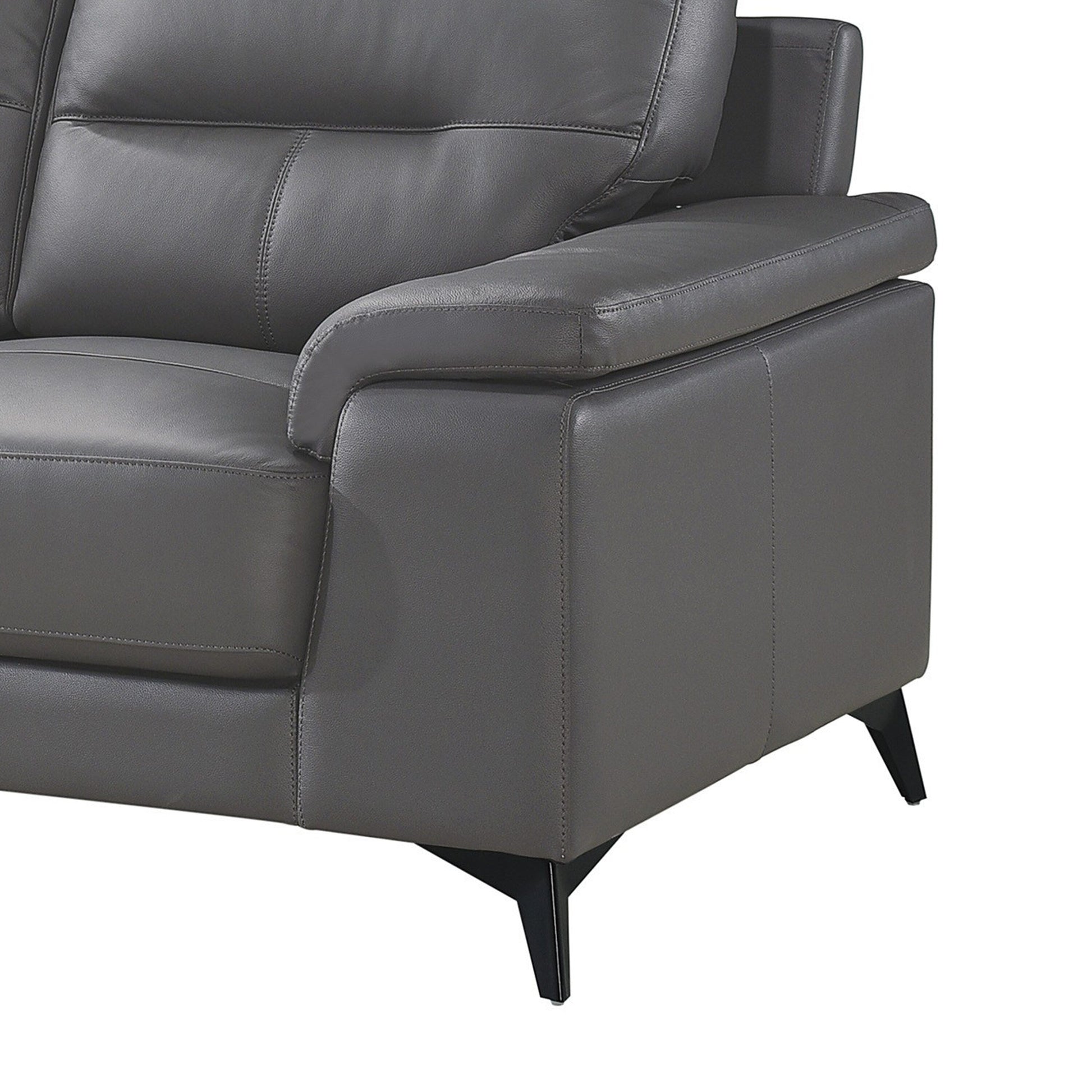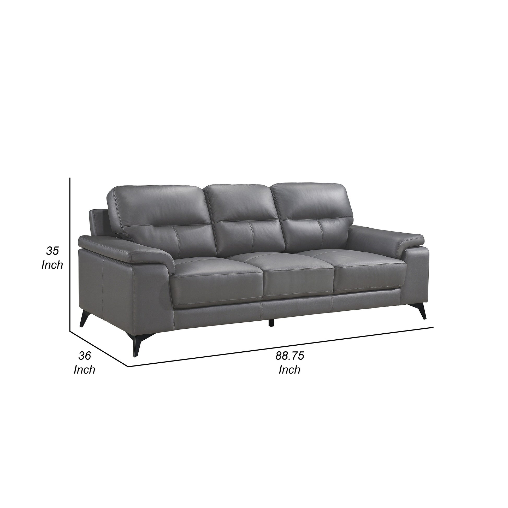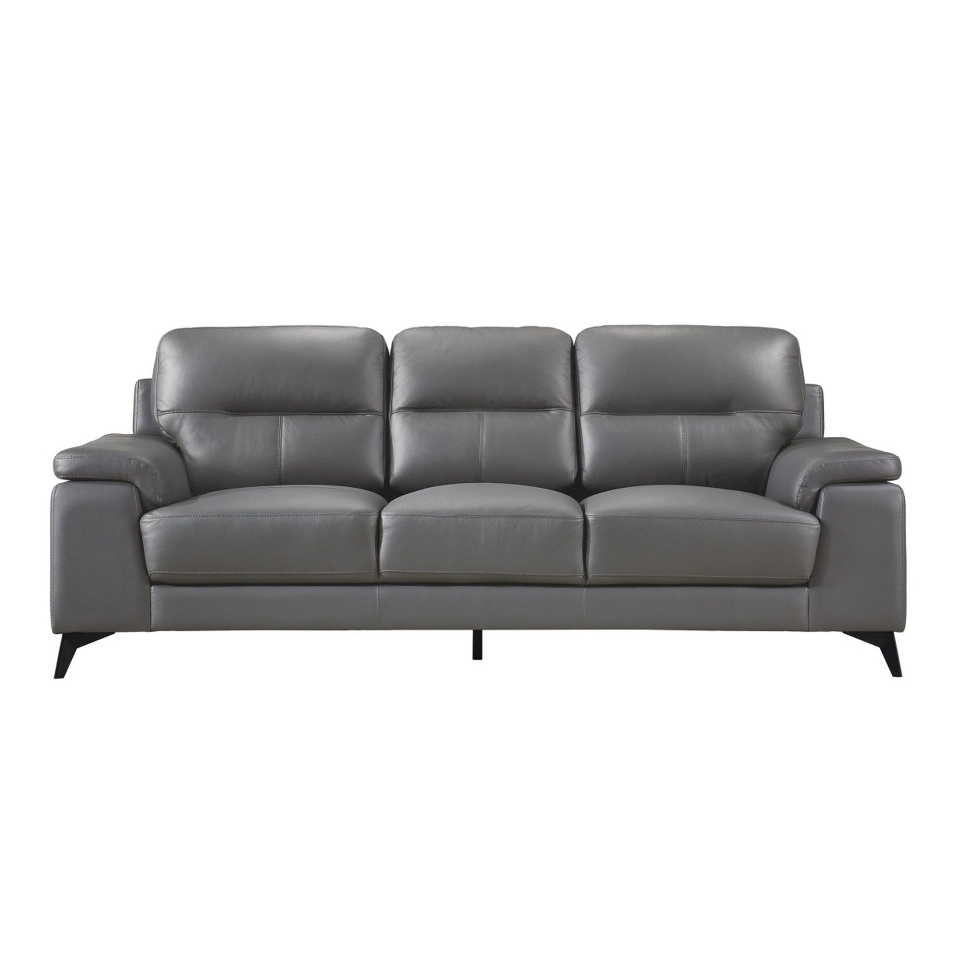 Rinnova il tuo spazio abitativo con le linee moderne ed eleganti di questo divano. Realizzato su una struttura in legno massello e compensato, presenta cuscini di seduta in schiuma ad alta densità e un rivestimento in pelle pieno fiore grigio scuro con un resistente rivestimento in similpelle su lati e schienale. I braccioli sagomati con cuscino e le gambe in metallo nero conferiscono una finitura audace e lineare. Esplora la nostra collezione Mica per ulteriori opzioni.