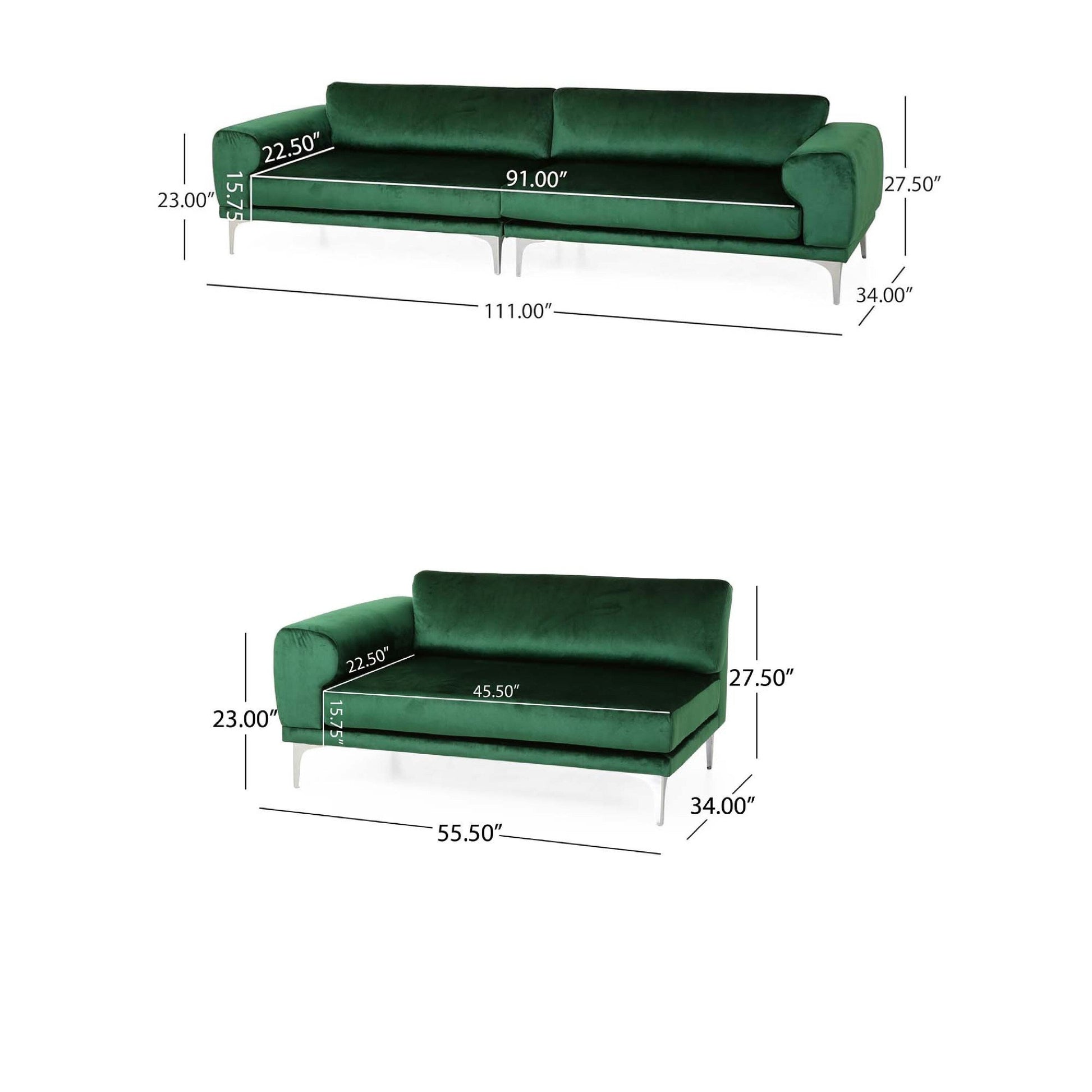Divano Miry a 4 posti, gambe argentate contemporanee, velluto verde smeraldo