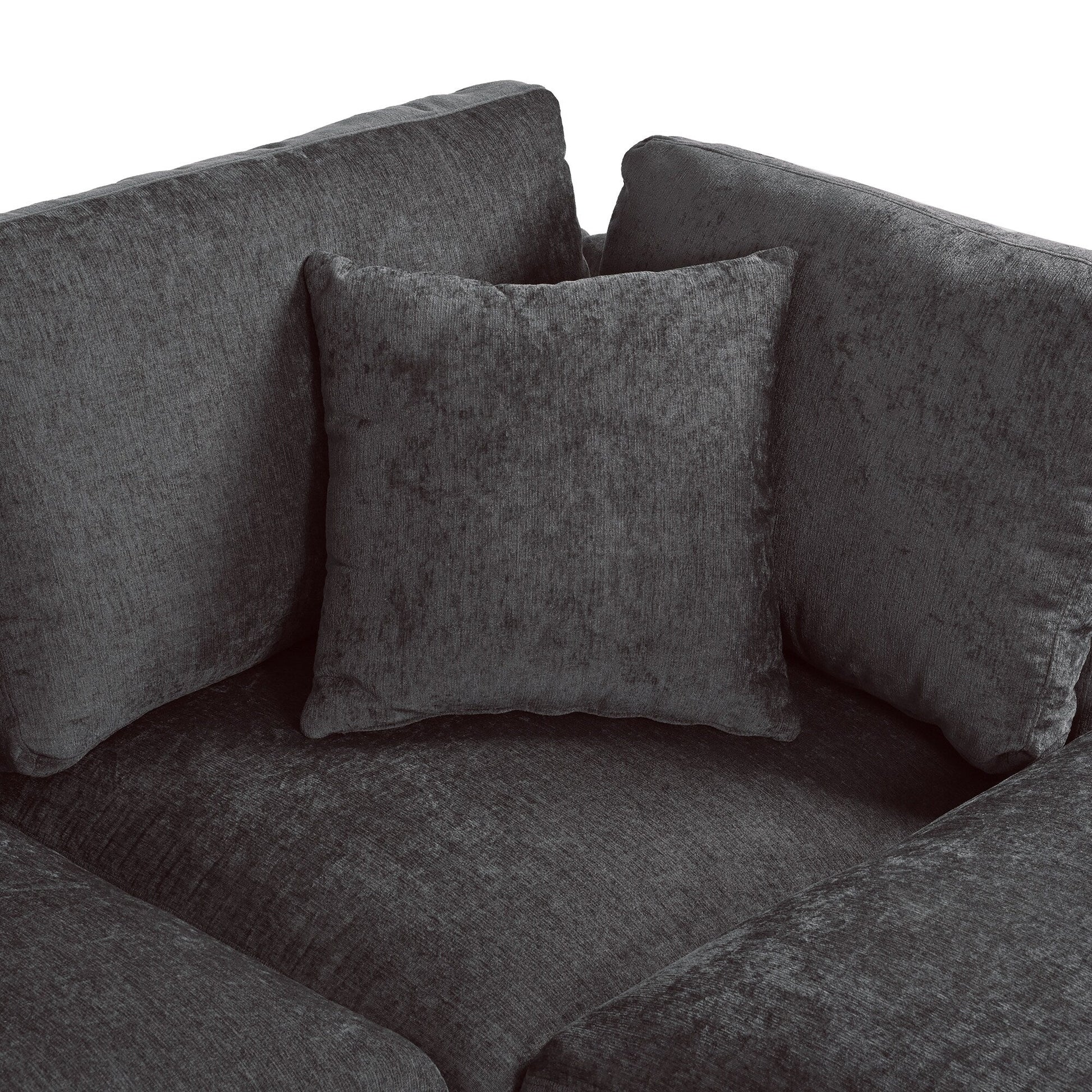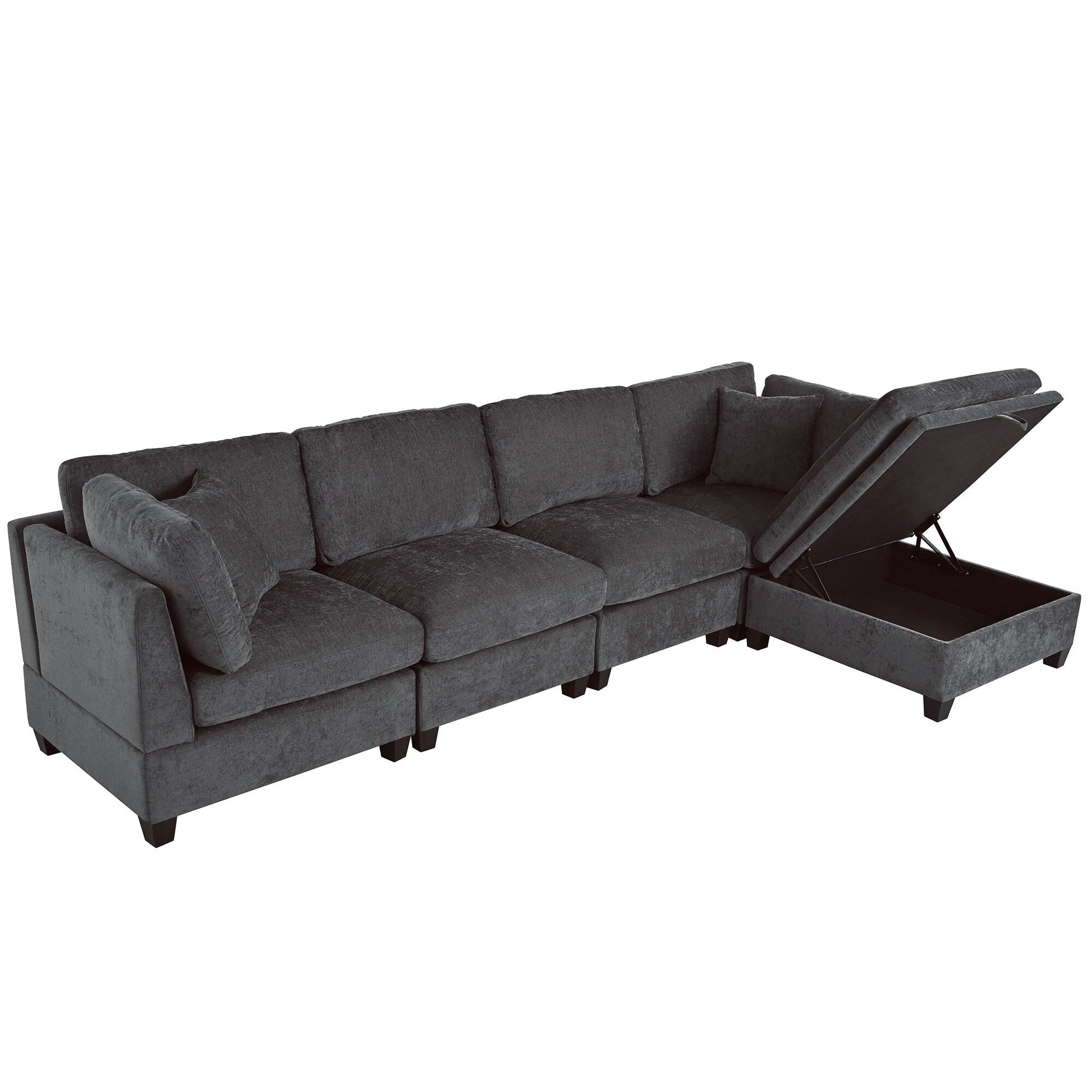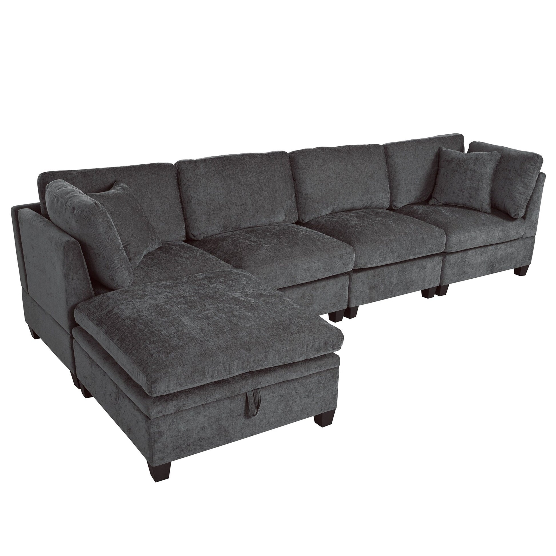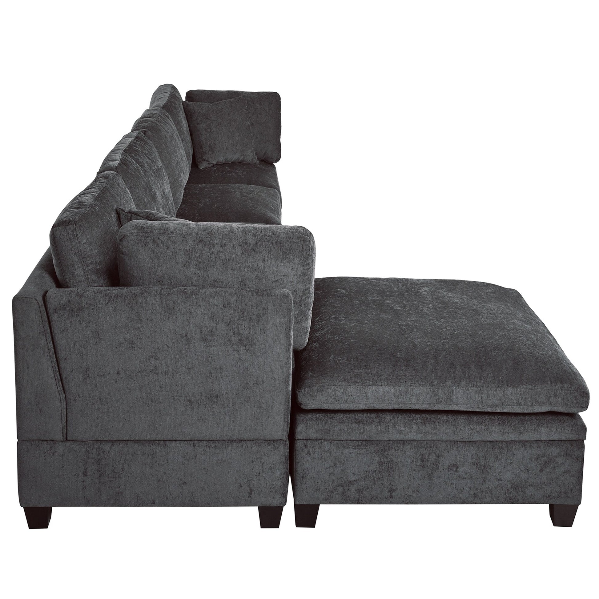 • Rilassatevi nel comfort di questo divano componibile imbottito a 5 posti con forma a U, dotato di morbidi cuscini, portabicchieri nascosti e un pouf contenitore. Il suo design salvaspazio coniuga comfort e funzionalità, rendendolo una scelta pratica per soggiorni o appartamenti.