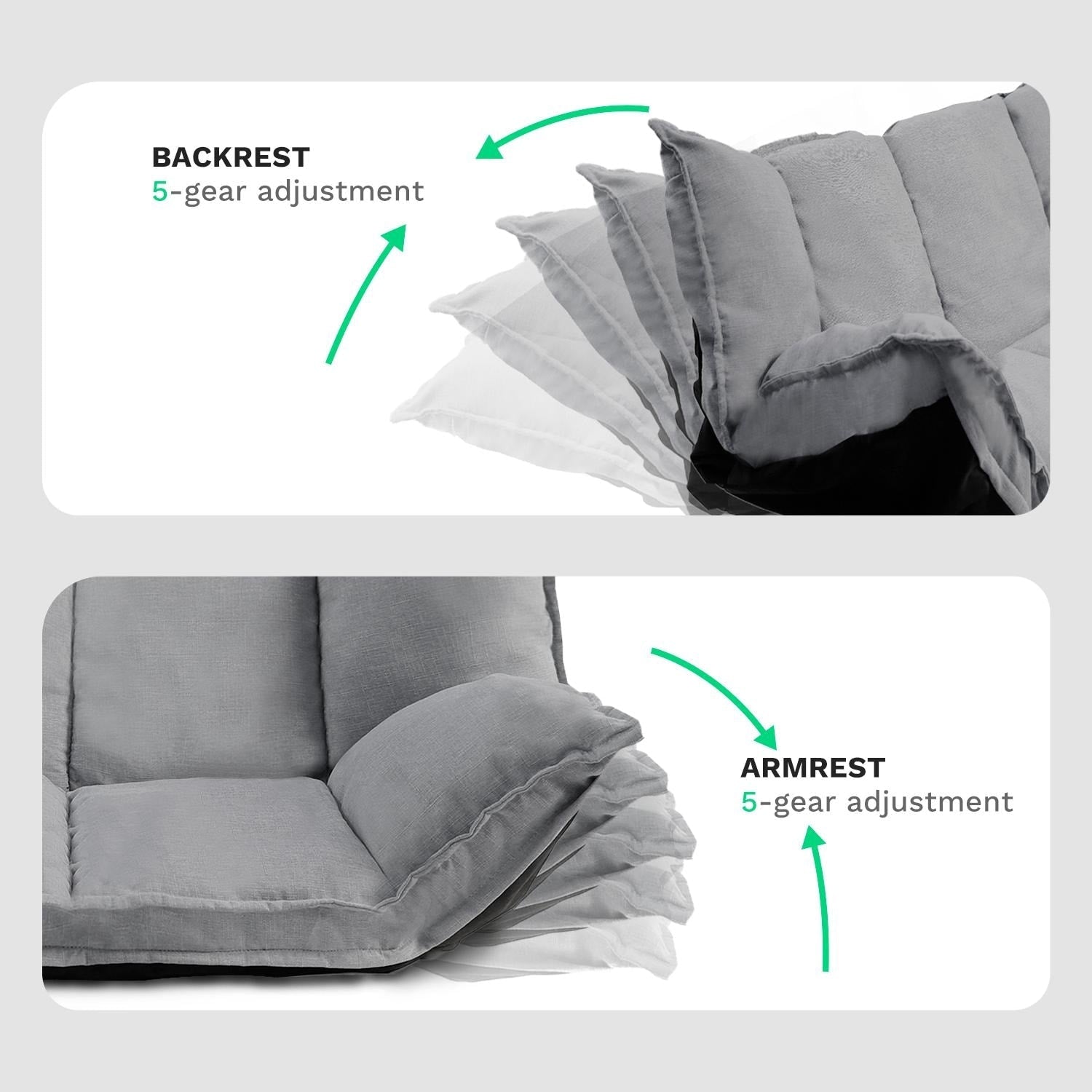 Concedetevi il massimo del comfort e della versatilità con la poltrona lounge regolabile. Realizzata con cura artigianale e materiali di alta qualità, tra cui un rivestimento in tessuto, una robusta struttura in metallo e un'imbottitura in soffice cotone, questa poltrona promette resistenza e comfort senza pari. Il morbido rivestimento in lino garantisce traspirabilità e un tocco delicato sulla pelle.