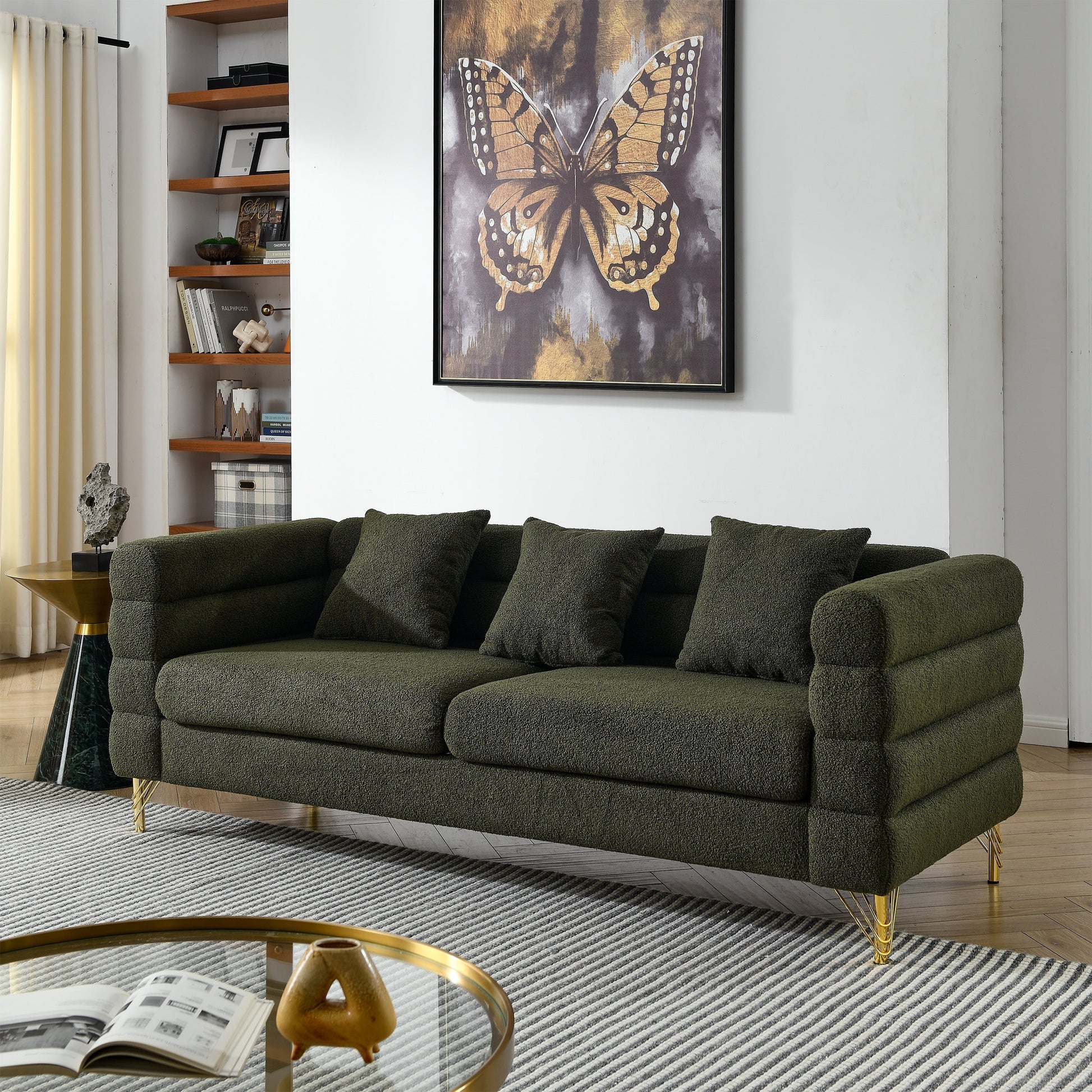 • Struttura resistente: supportato da una solida struttura in legno e robuste gambe in metallo lucidato oro, questo moderno divano da soggiorno a tre posti è progettato per garantire resistenza e durata. Ogni seduta ha una capacità di carico fino a 113 kg, il che lo rende la scelta ideale per il relax di tre persone.