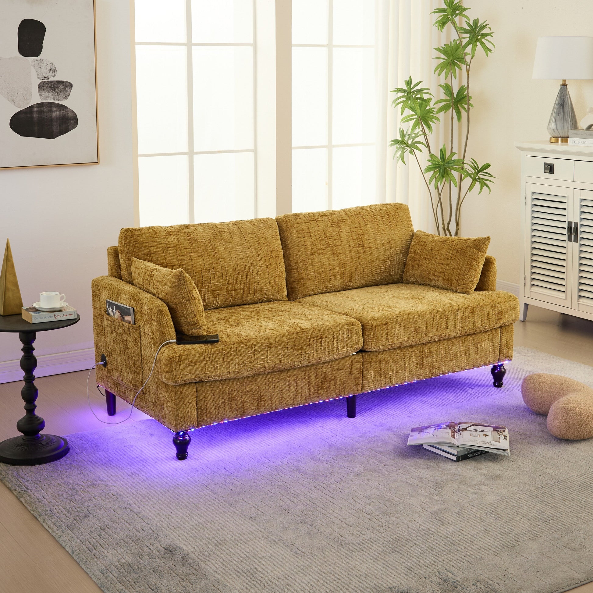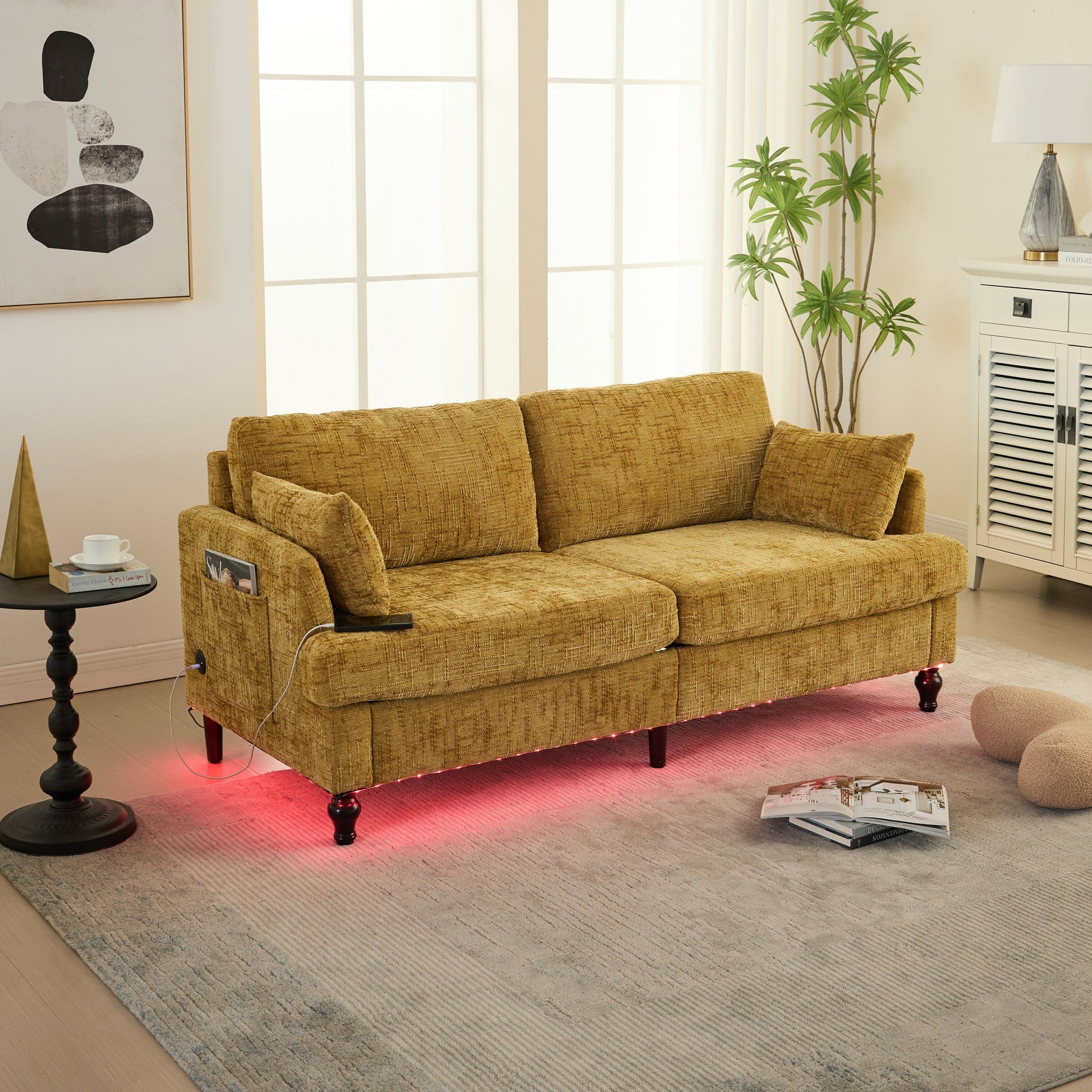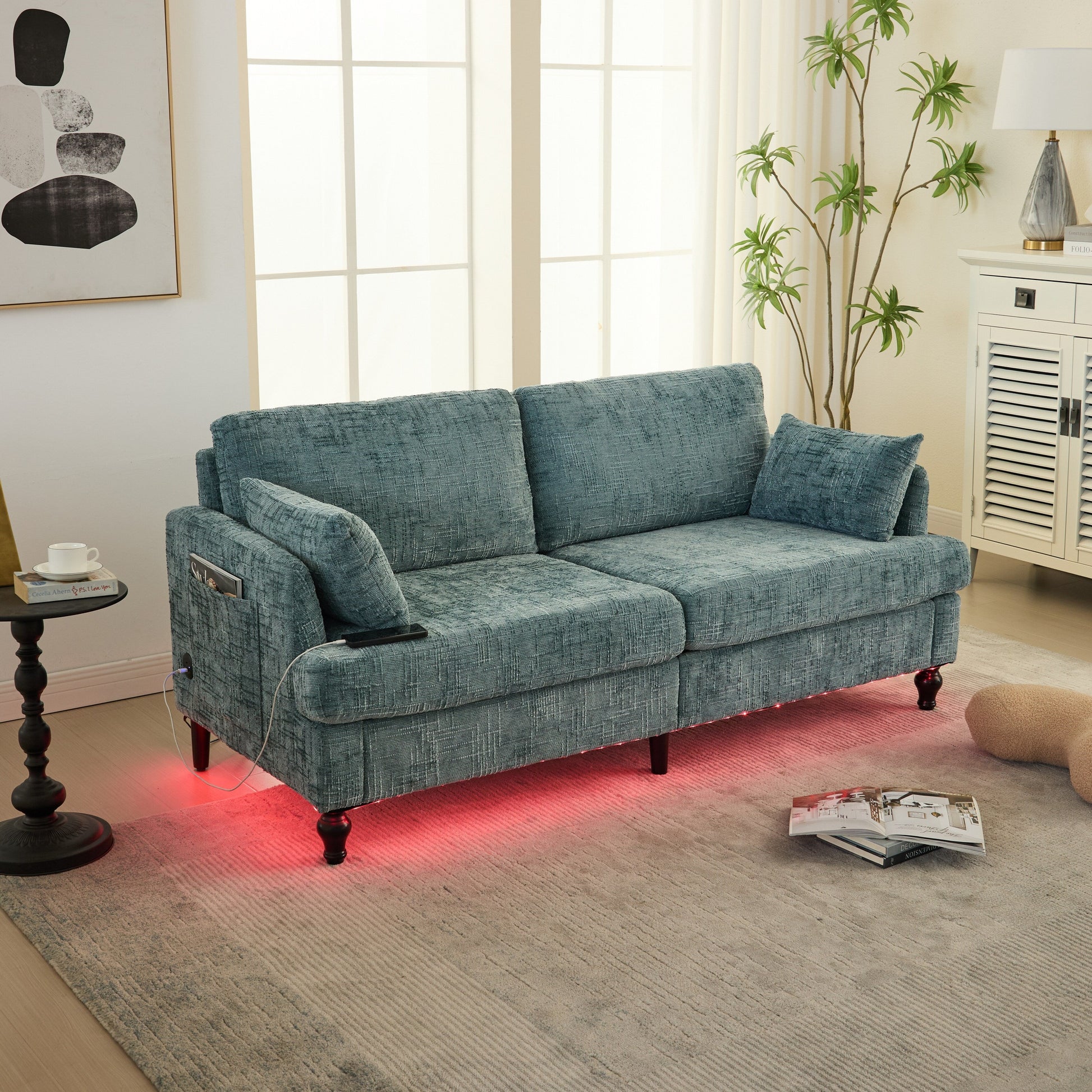 Divano moderno a 2 posti in ciniglia con gambe in legno, luce a LED, porta di ricarica USB e borsa portaoggetti, soggiorno, camera da letto, studio