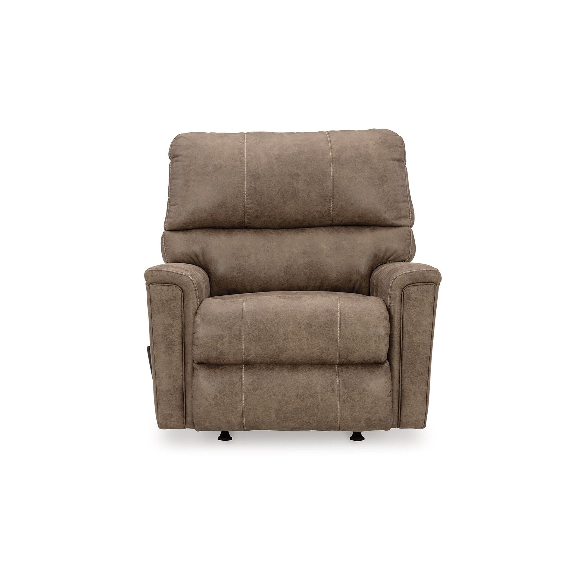Rilassati con stile con questa poltrona reclinabile a dondolo manuale, dotata di una resistente struttura in legno con rinforzi in metallo per una maggiore durata. Il suo movimento di reclinazione fluido e il dolce dondolio favoriscono il relax, mentre il rivestimento in similpelle color marrone fossile aggiunge eleganza. Inoltre, i suoi cuscini in schiuma ad alta resilienza offrono un supporto solido ma confortevole. Scopri la nostra collezione Nav per saperne di più.