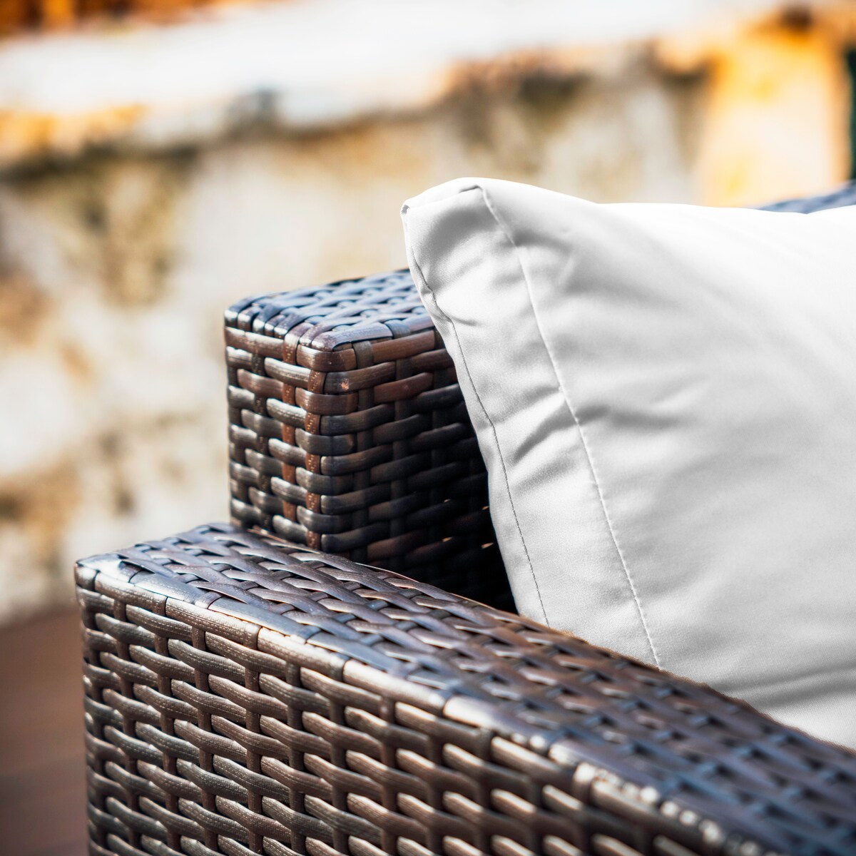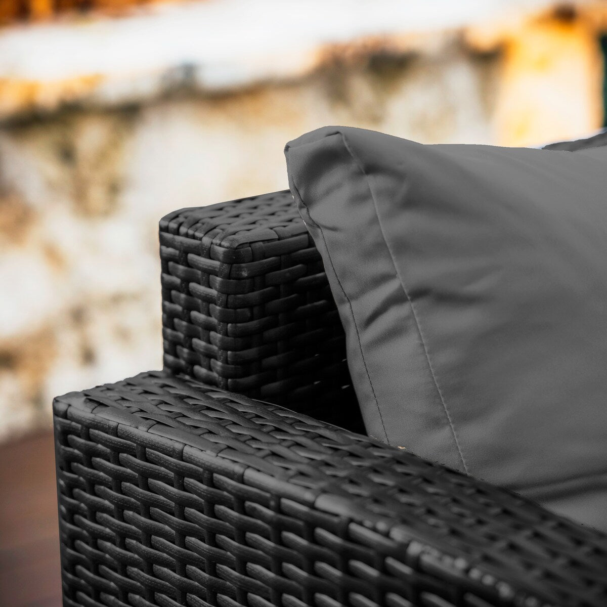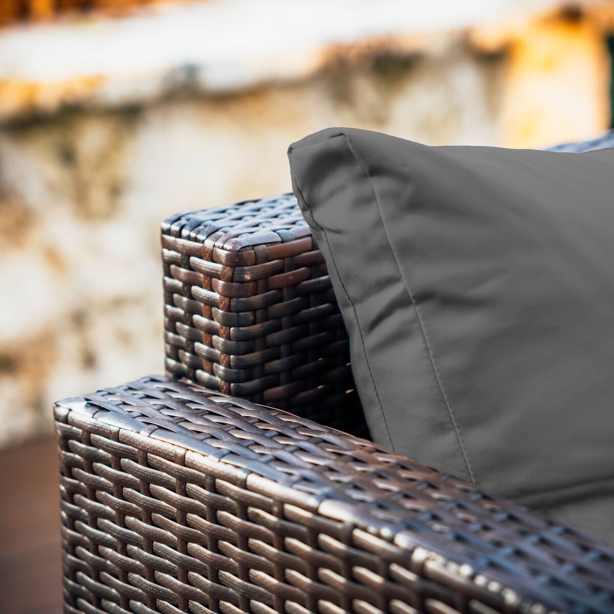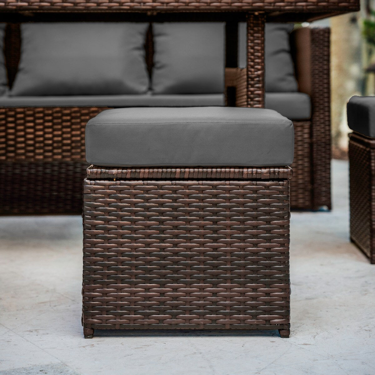 Trasforma il tuo patio o terrazzo in un accogliente spazio all'aperto con il set da pranzo in vimini Nestlè da 7 pezzi, che include un tavolo da pranzo, tre pouf e tre panche che possono essere combinati per formare un ampio divano a L. Rilassati sui morbidi cuscini di seduta e appoggiati sui cuscini dello schienale, riunendoti attorno all'ampio e robusto tavolo da pranzo con la famiglia e gli amici. Realizzato in resistente acciaio zincato e intrecciato in polyrattan con piano del tavolo in poliresina, questo splendido set di mobili da giardino è impermeabile e resistente alle intemperie, garantendo anni di divertimento.