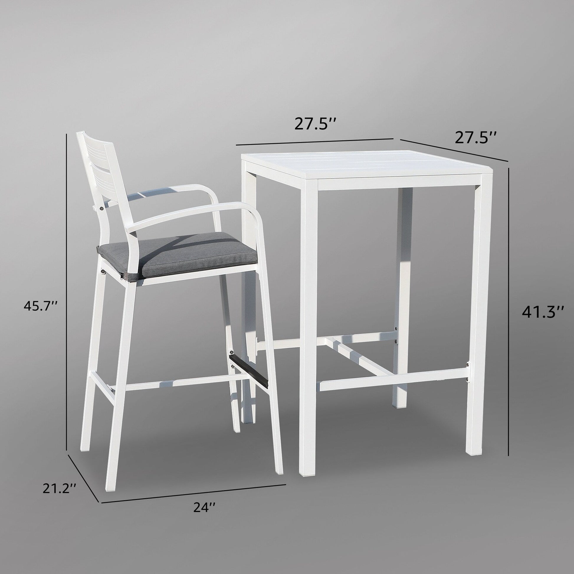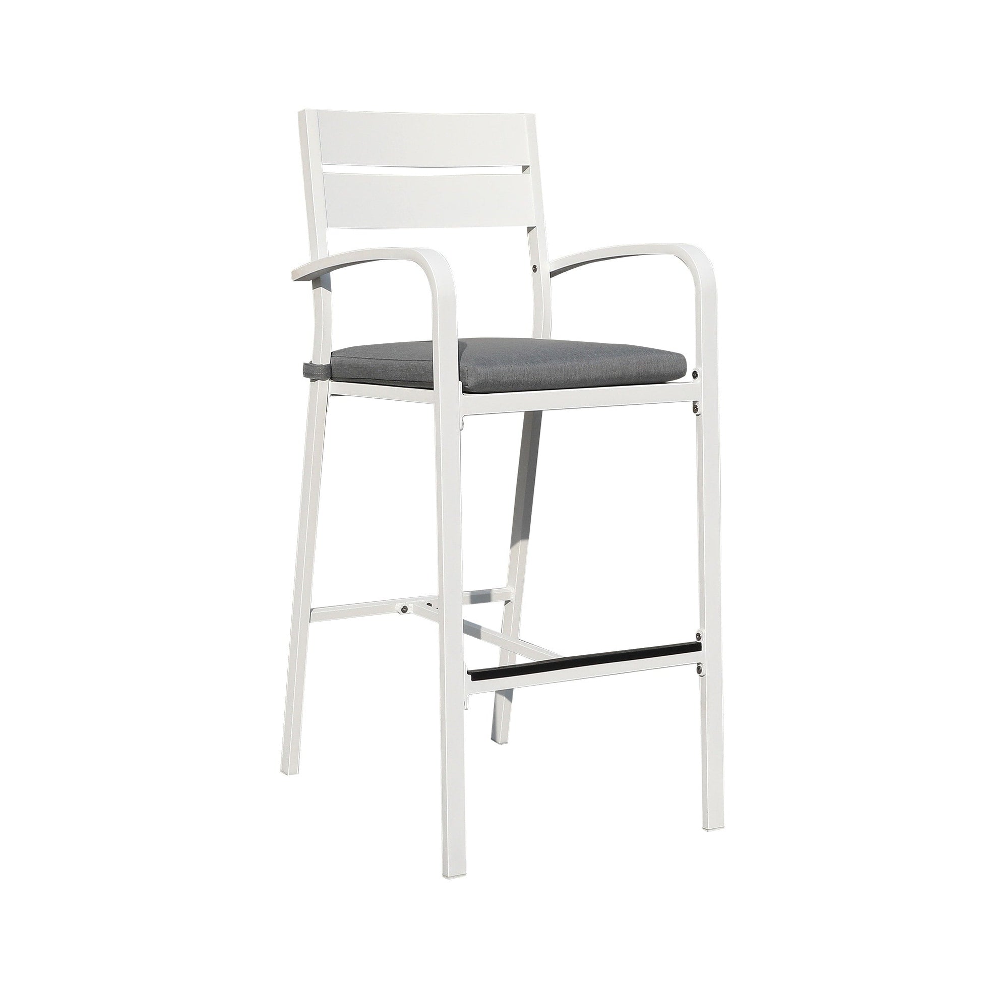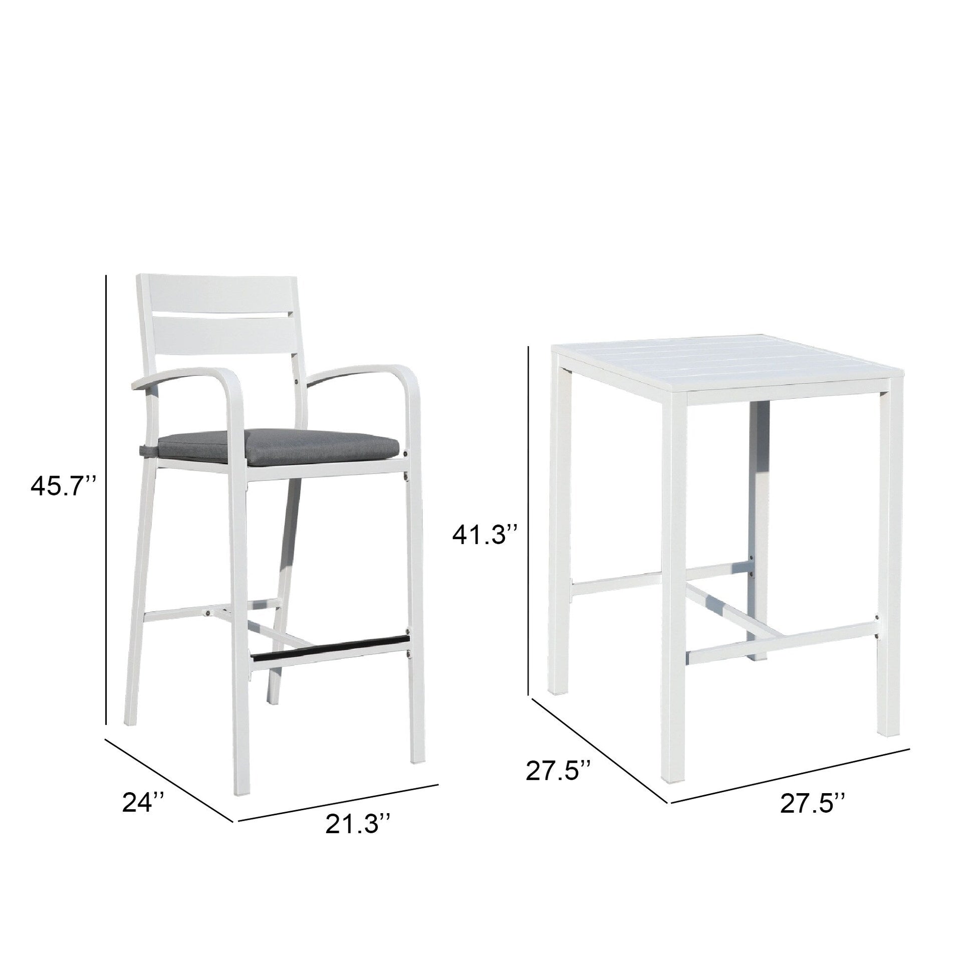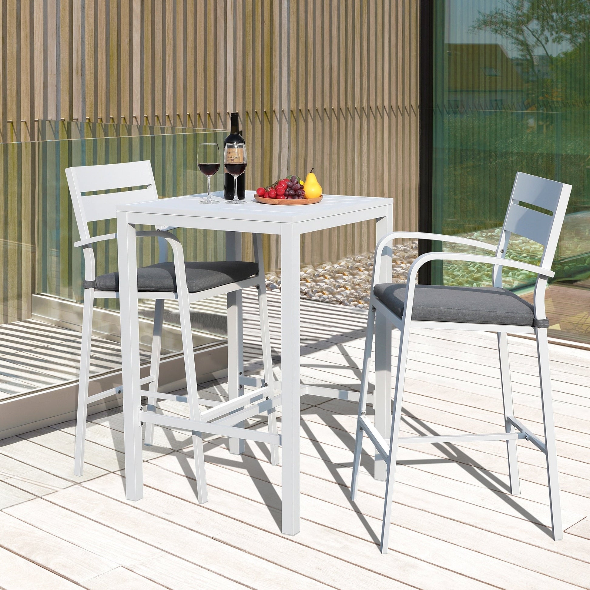 Valorizza il tuo spazio esterno con questo elegante e pratico set da bar in alluminio composto da 3 pezzi. Che tu abbia un accogliente balcone o una piccola terrazza, questo set da bar dal design contemporaneo, disponibile in bianco o nero, è perfetto per pranzi e cene informali e per rilassarsi. Realizzato in alluminio di alta qualità, questo set è resistente alle intemperie e richiede una manutenzione minima. La struttura leggera e compatta lo rende facile da spostare, mentre i morbidi cuscini imbottiti e i poggiapiedi offrono il massimo comfort. Vivi una serata romantica sotto le stelle con la persona amata utilizzando questo grazioso set da bar per esterni.