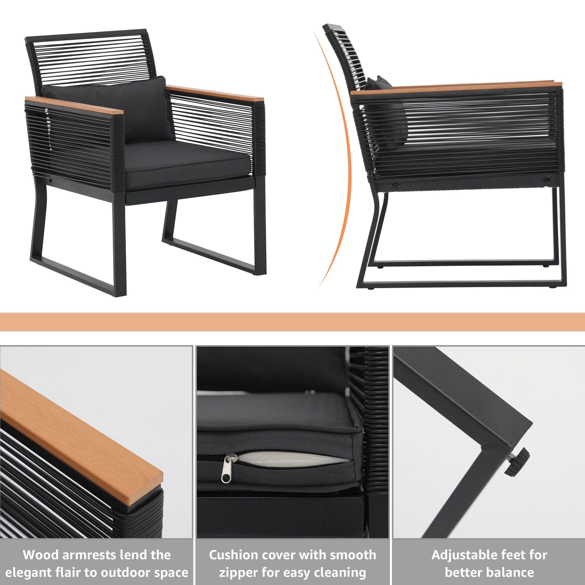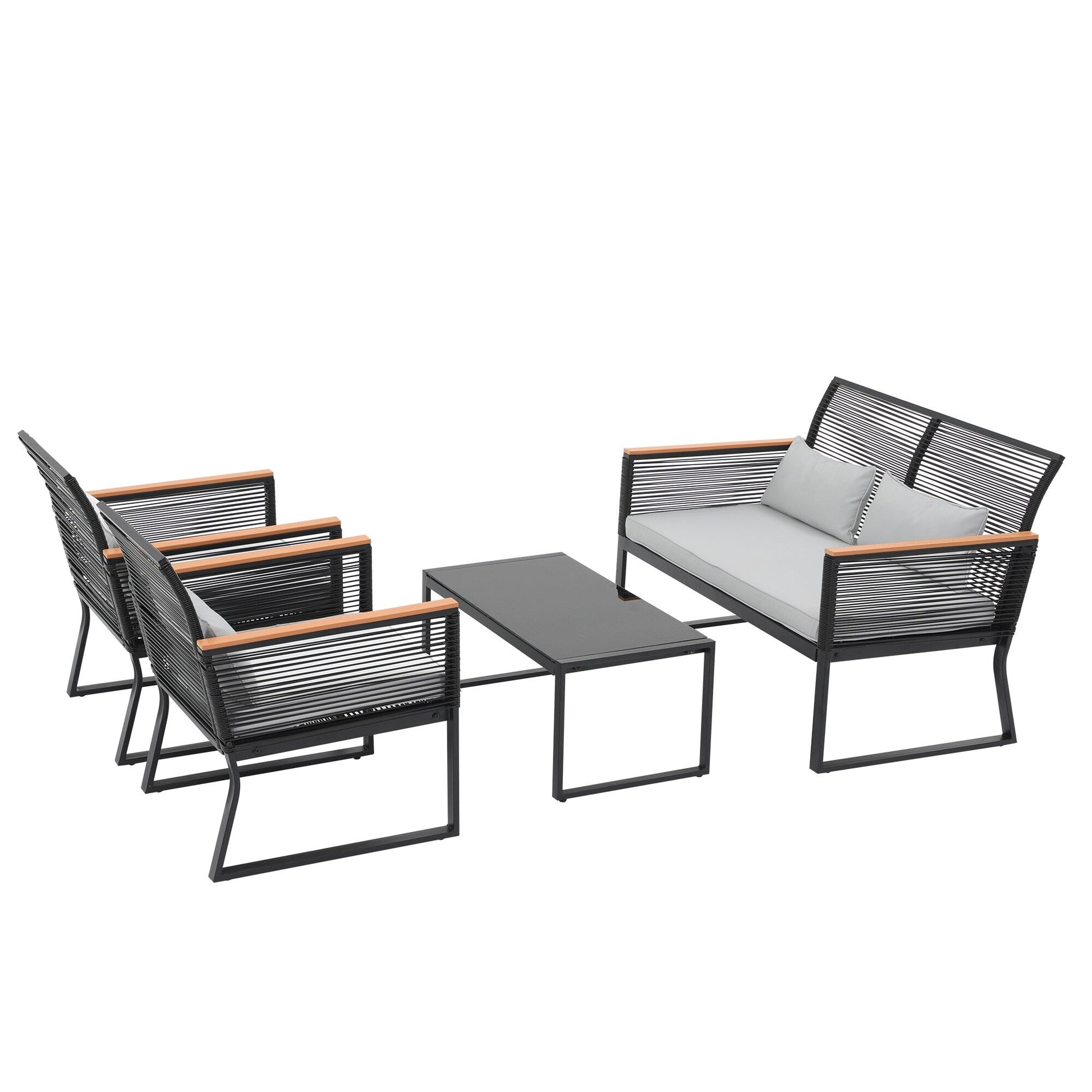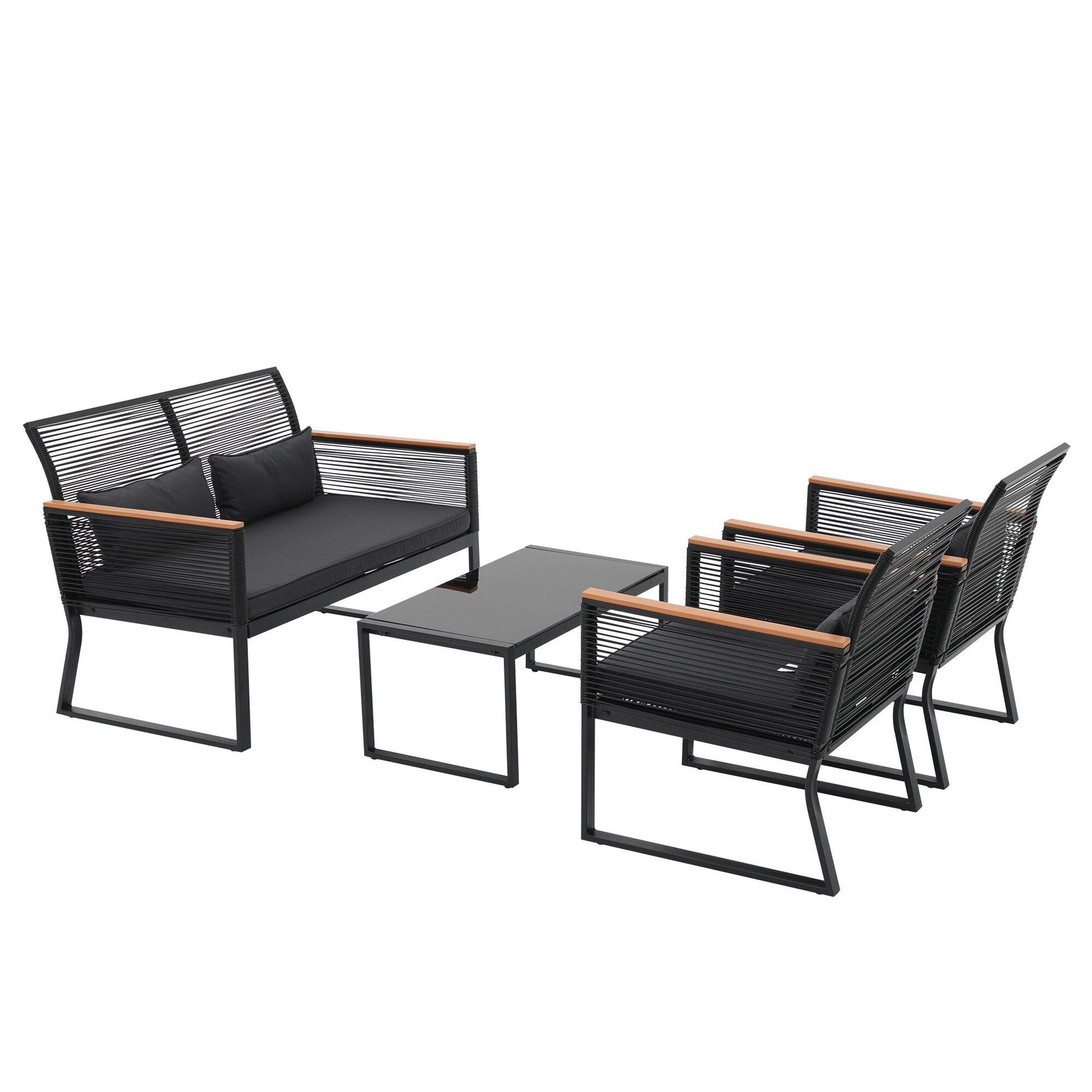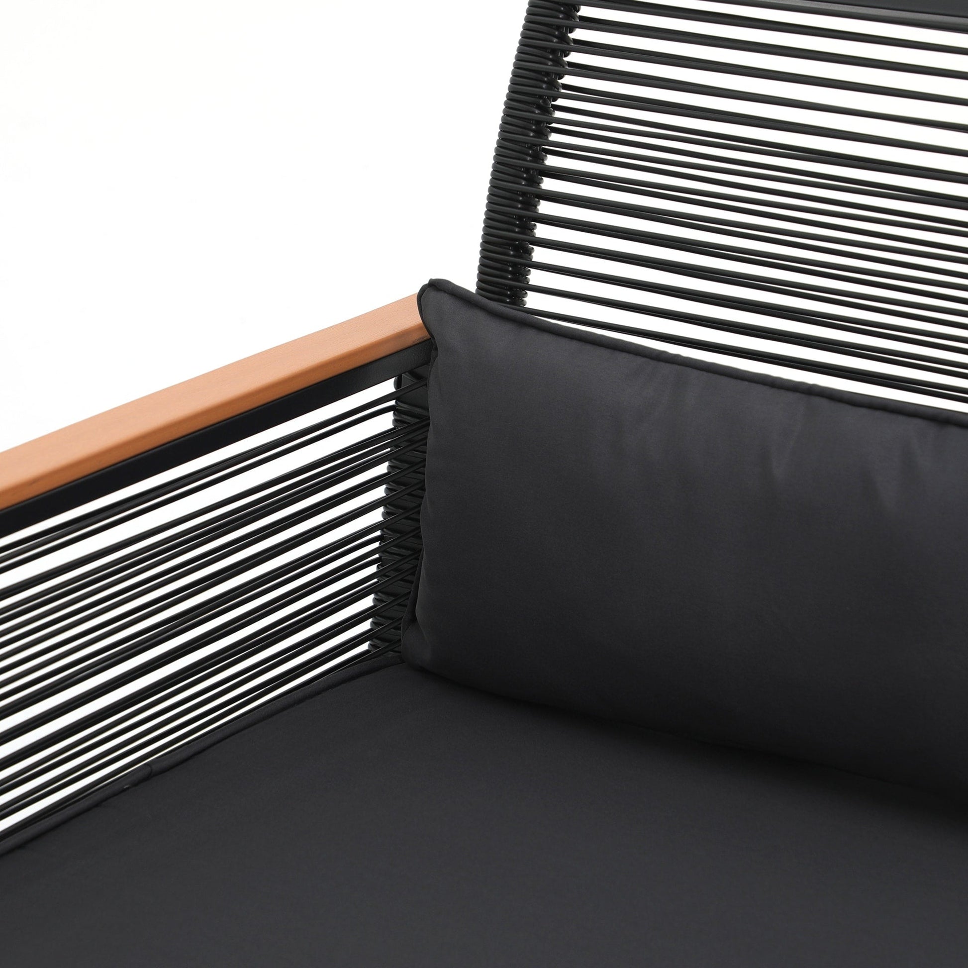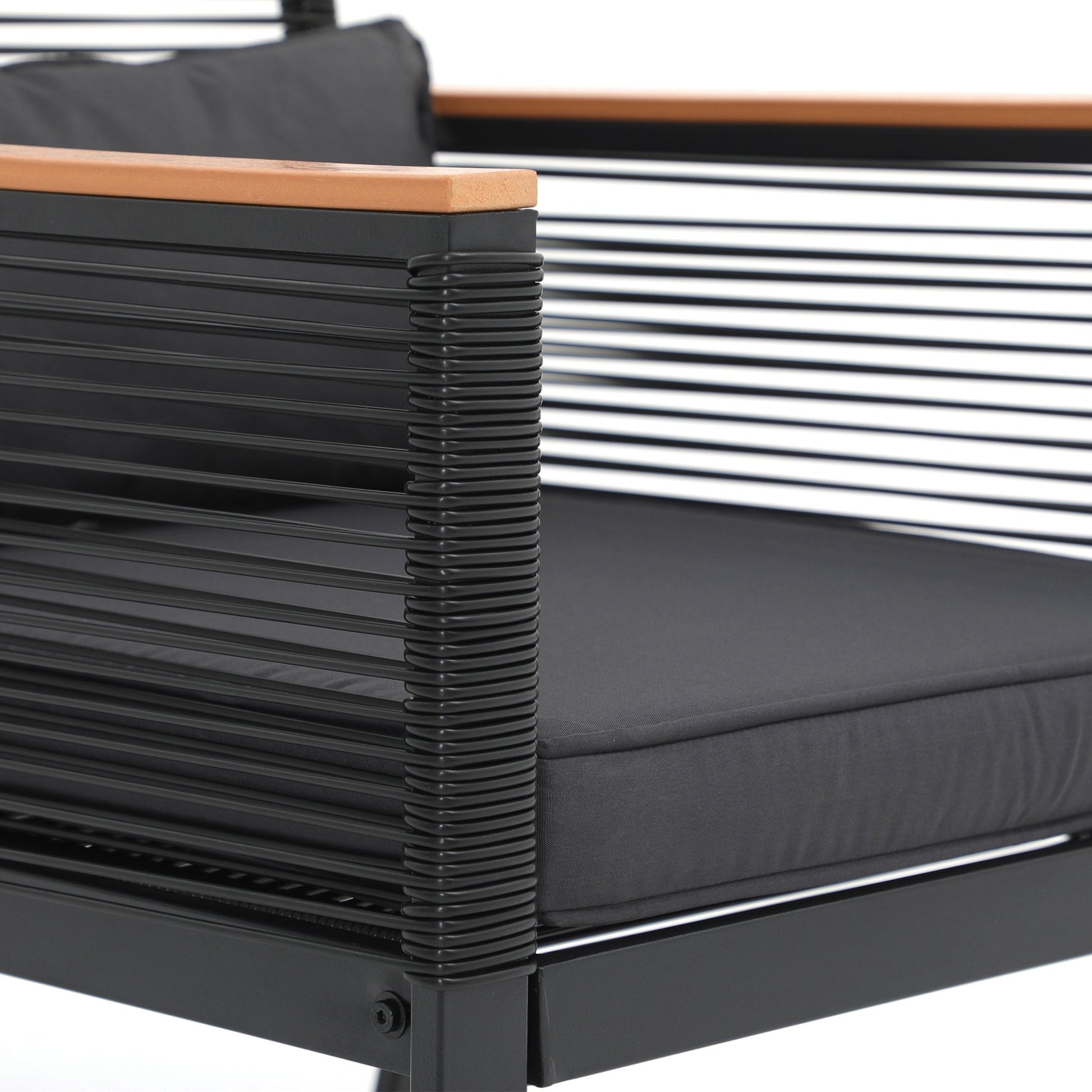 Godetevi conversazioni accoglienti, splendidi tramonti e aria fresca con gli amici su questo elegante e pratico set da conversazione per patio. Realizzato in vimini PE di alta qualità e telaio in acciaio verniciato a polvere, questo set da conversazione per esterni è progettato per resistere a diverse condizioni climatiche e garantire un utilizzo affidabile per anni a venire. Il vimini nero rende il set facile da abbinare all'ambiente circostante, mentre i braccioli in legno conferiscono un tocco di eleganza all'arredamento del patio. Il set da conversazione è dotato di 4 cuscini per la vita per offrire ulteriore comfort durante i momenti di relax all'aperto.