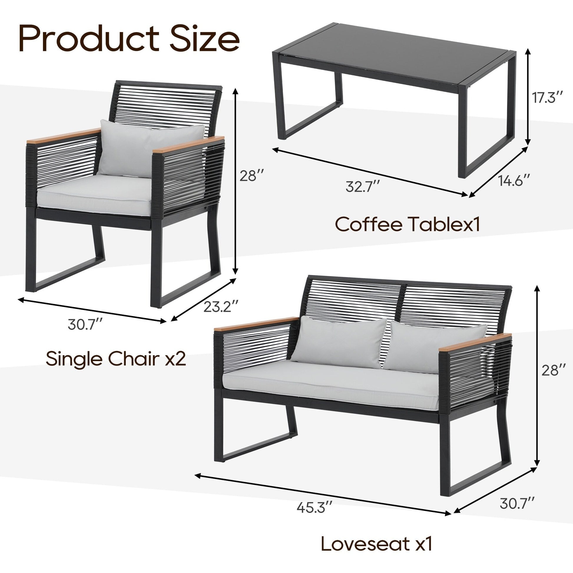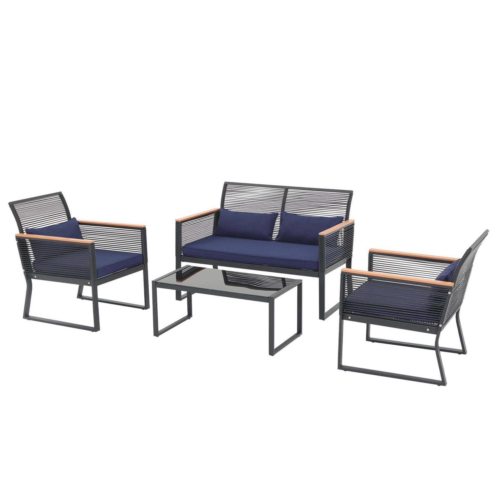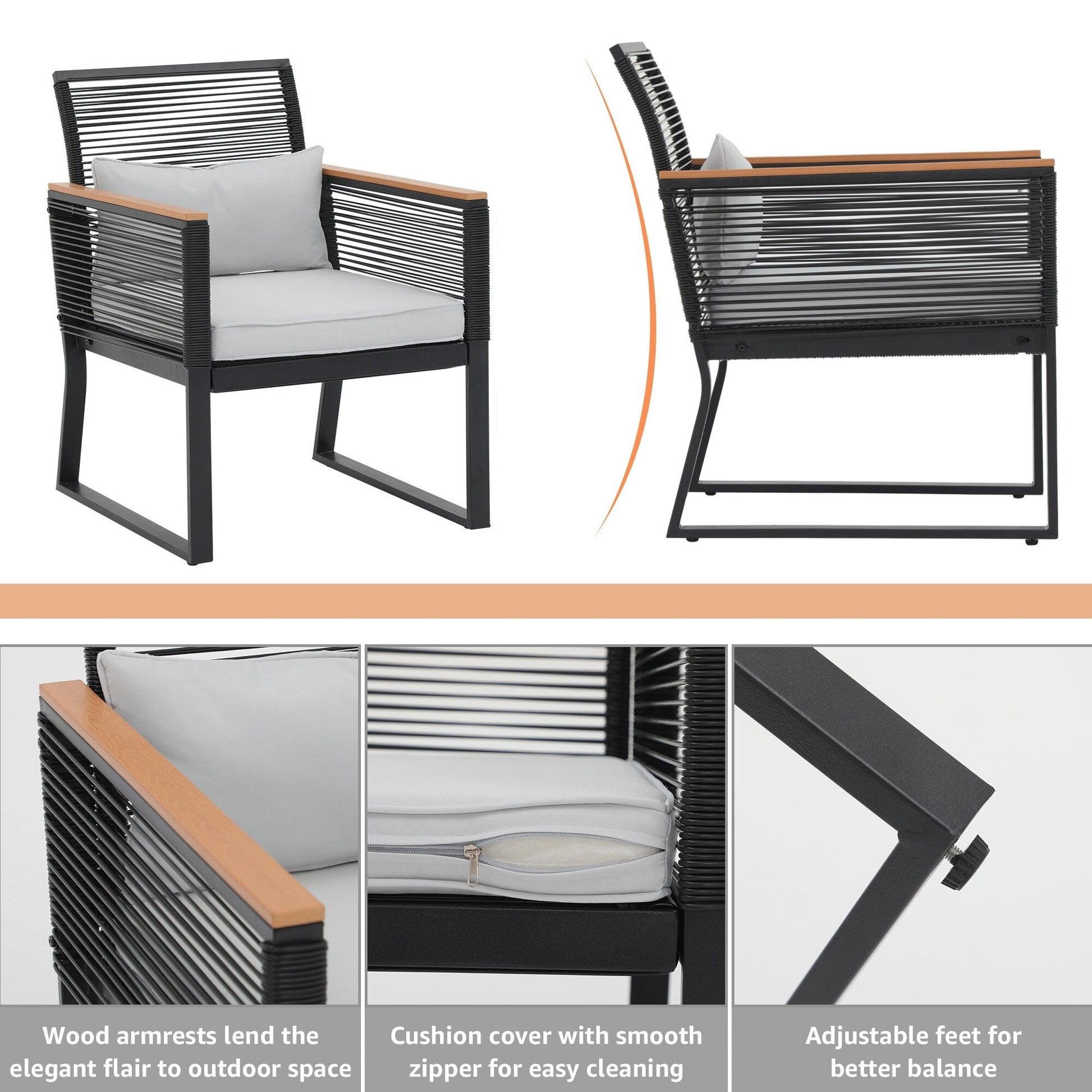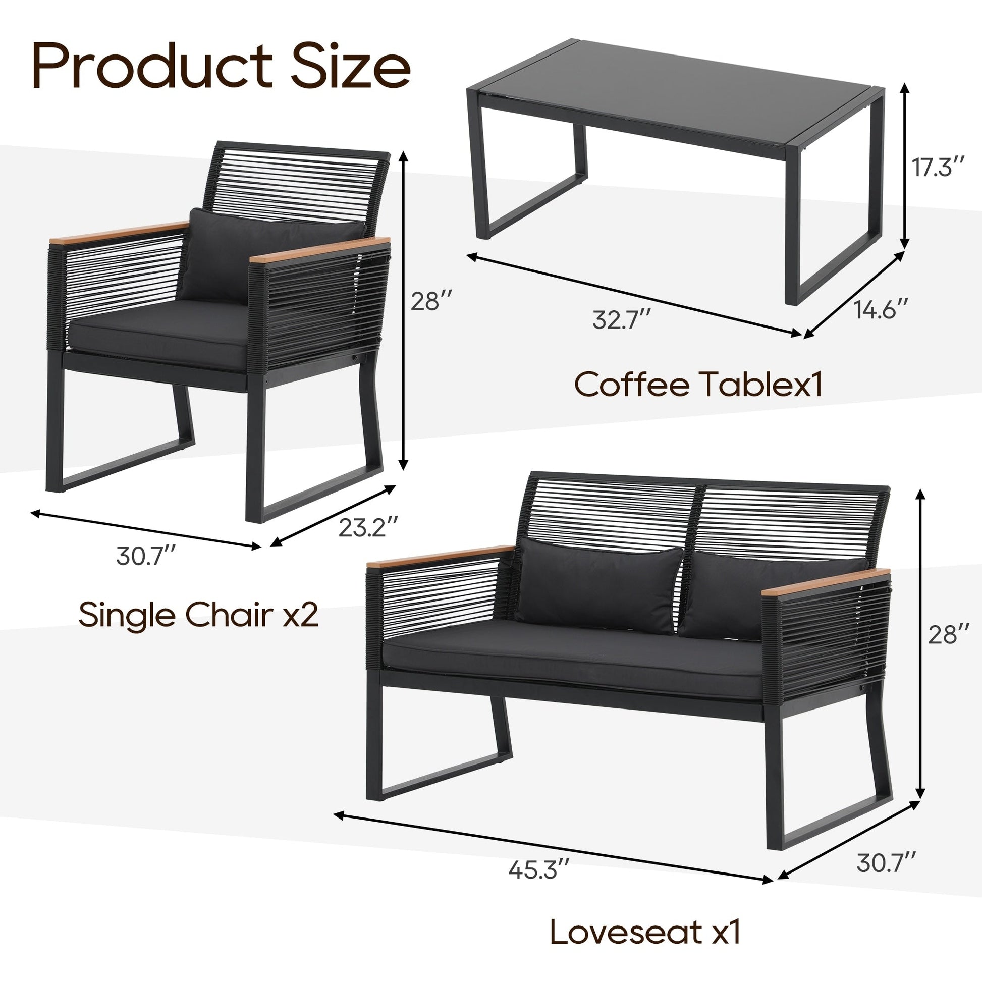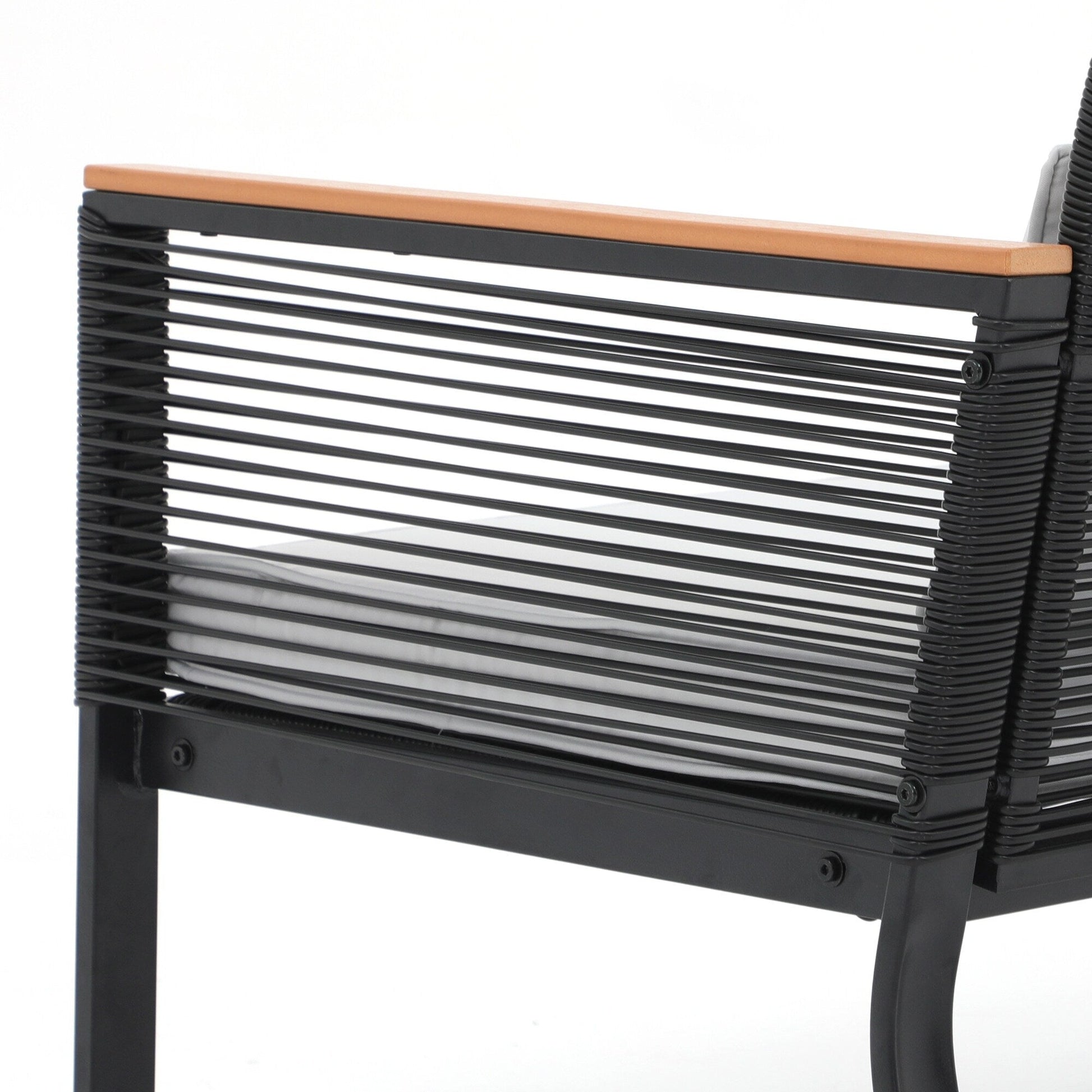 Godetevi conversazioni accoglienti, splendidi tramonti e aria fresca con gli amici su questo elegante e pratico set da conversazione per patio. Realizzato in vimini PE di alta qualità e telaio in acciaio verniciato a polvere, questo set da conversazione per esterni è progettato per resistere a diverse condizioni climatiche e garantire un utilizzo affidabile per anni a venire. Il vimini nero rende il set facile da abbinare all'ambiente circostante, mentre i braccioli in legno conferiscono un tocco di eleganza all'arredamento del patio. Il set da conversazione è dotato di 4 cuscini per la vita per offrire ulteriore comfort durante i momenti di relax all'aperto.