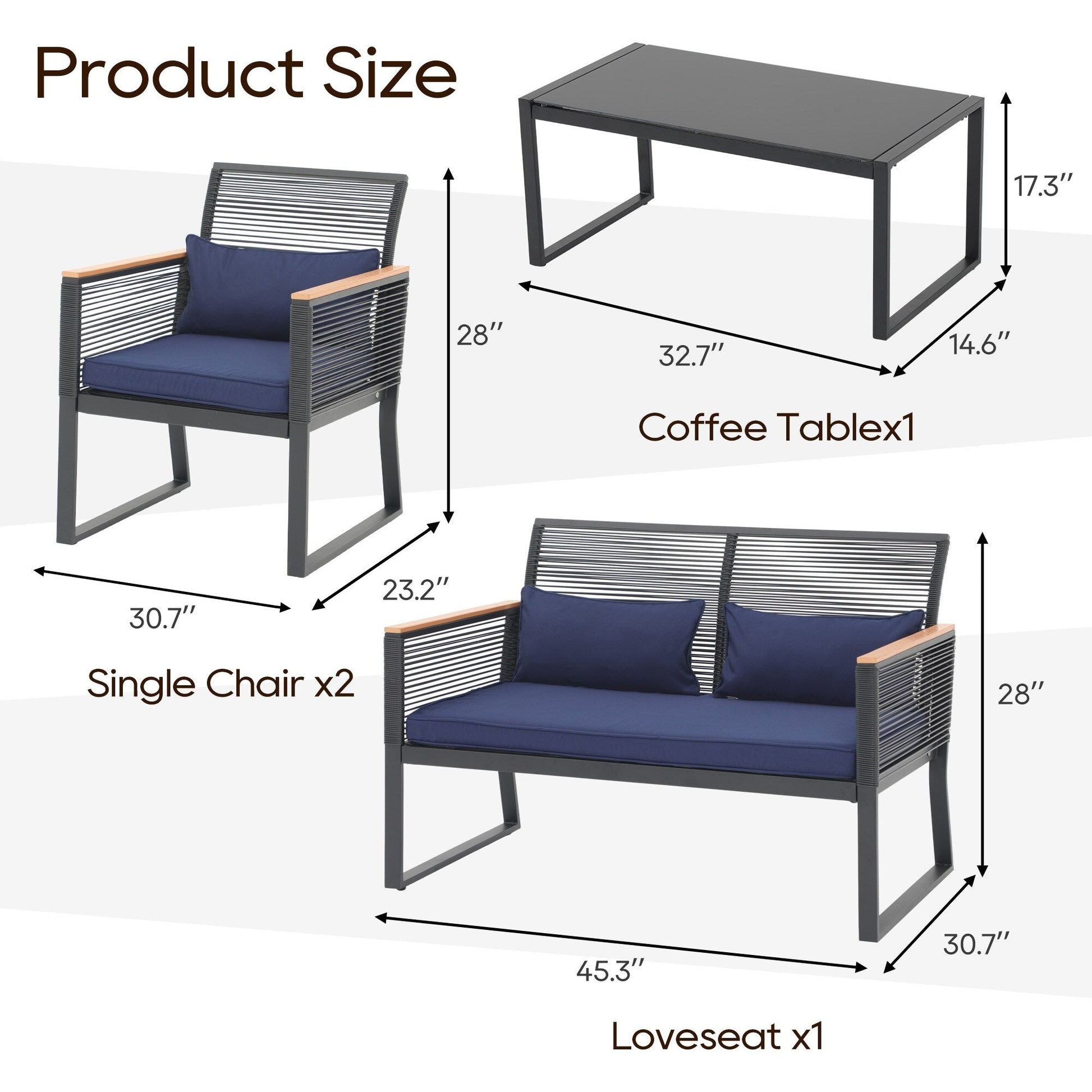 Include 2 sedie singole, 1 divano a due posti e 1 tavolino da caffè